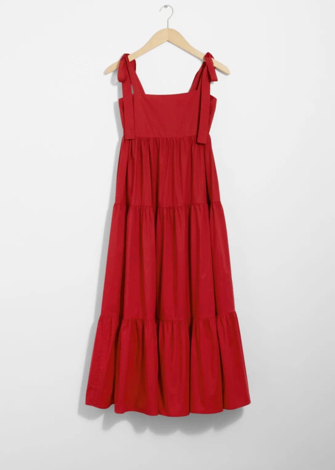 Robe midi trapèze sans manches avec une jupe à plusieurs niveaux, des liens à nouer et une encolure carrée.