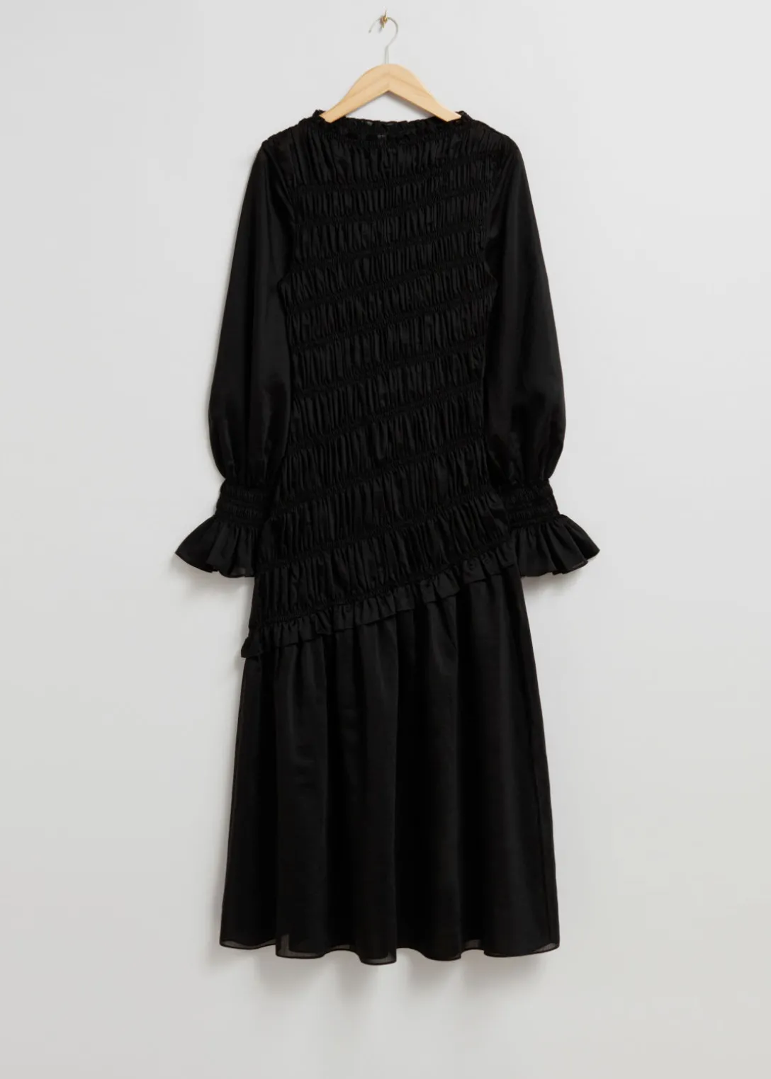 Robe midi avec des détails à smocks inclinés tombant sur une bordure volantée et une jupe épurée.