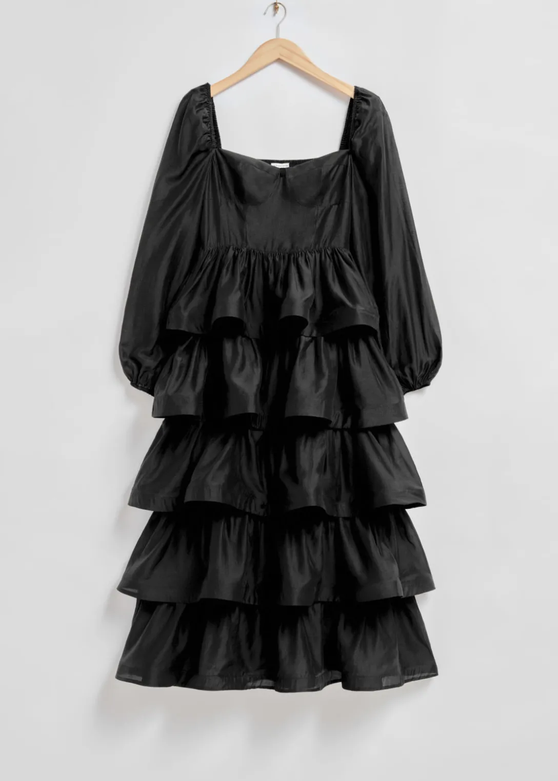 Robe midi à manches longues, dotée de plusieurs niveaux de volants et d’un corsage d’inspiration corset.