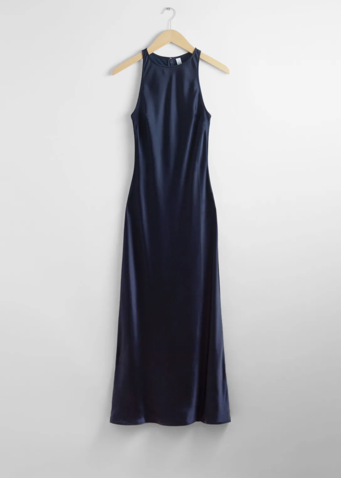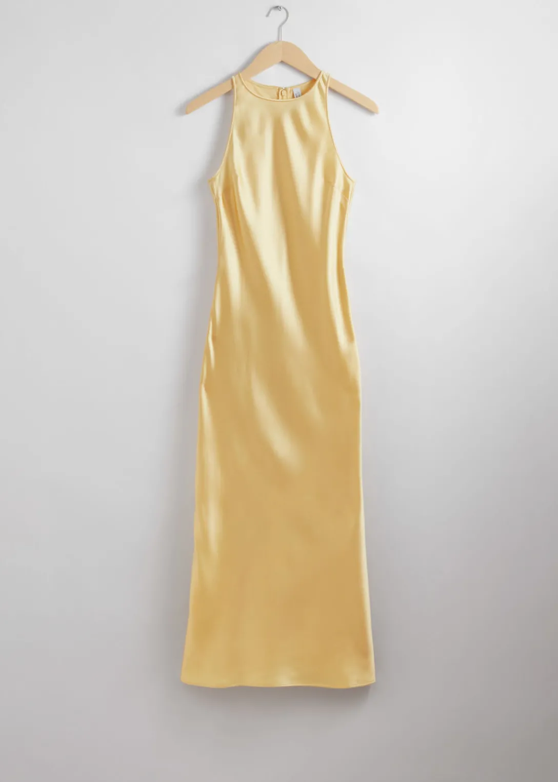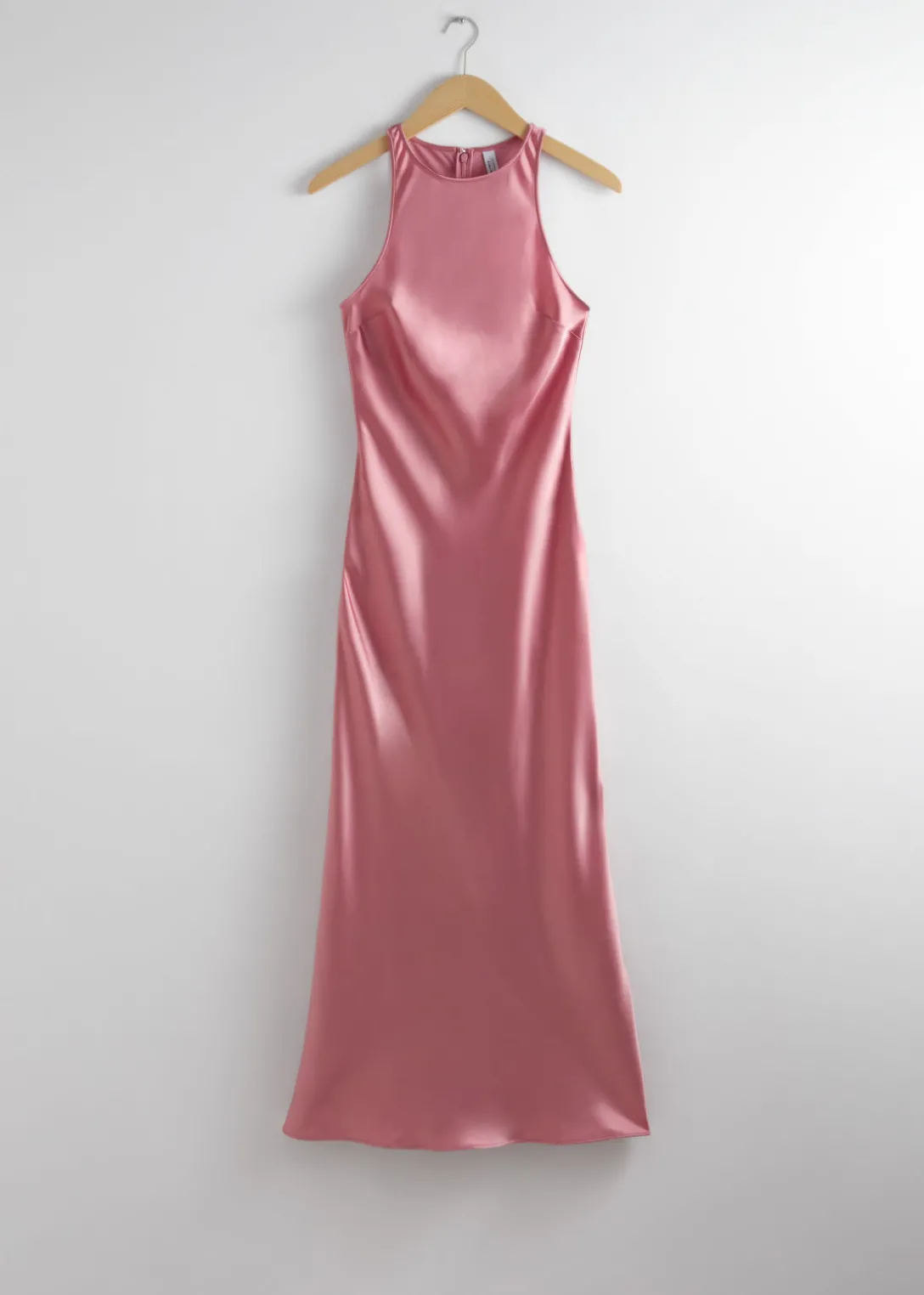 Robe midi sans manches en satin, avec des pinces au niveau de la poitrine.