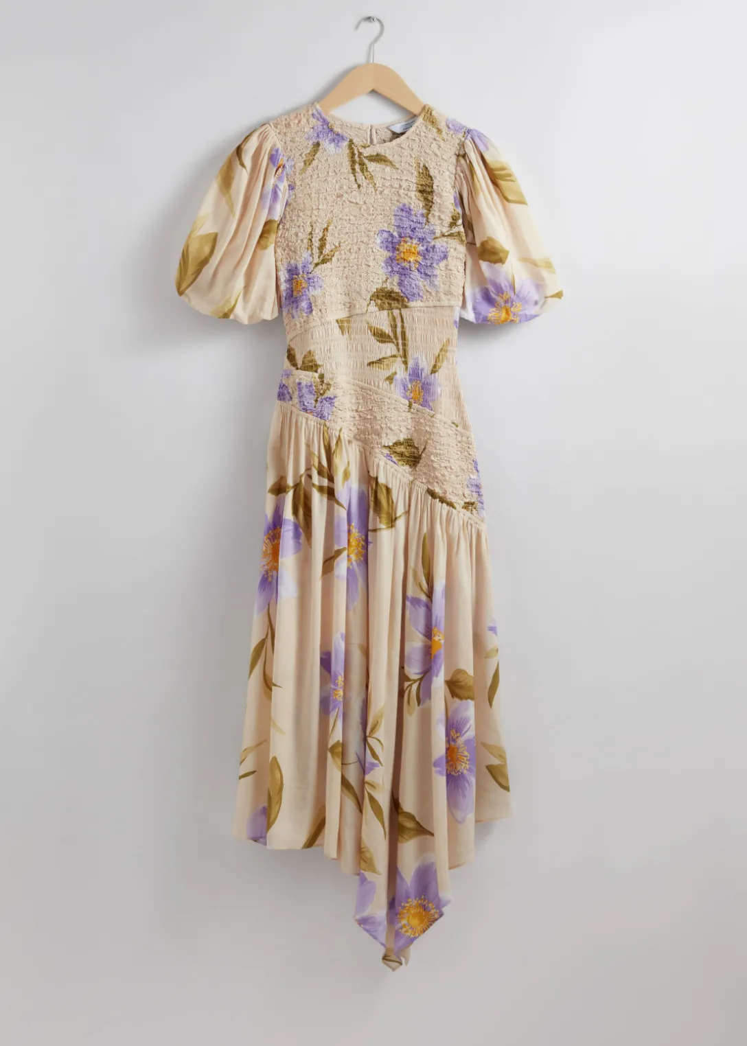 Robe midi avec des empiècements à smocks et une jupe légèrement plissée créant un ourlet asymétrique.