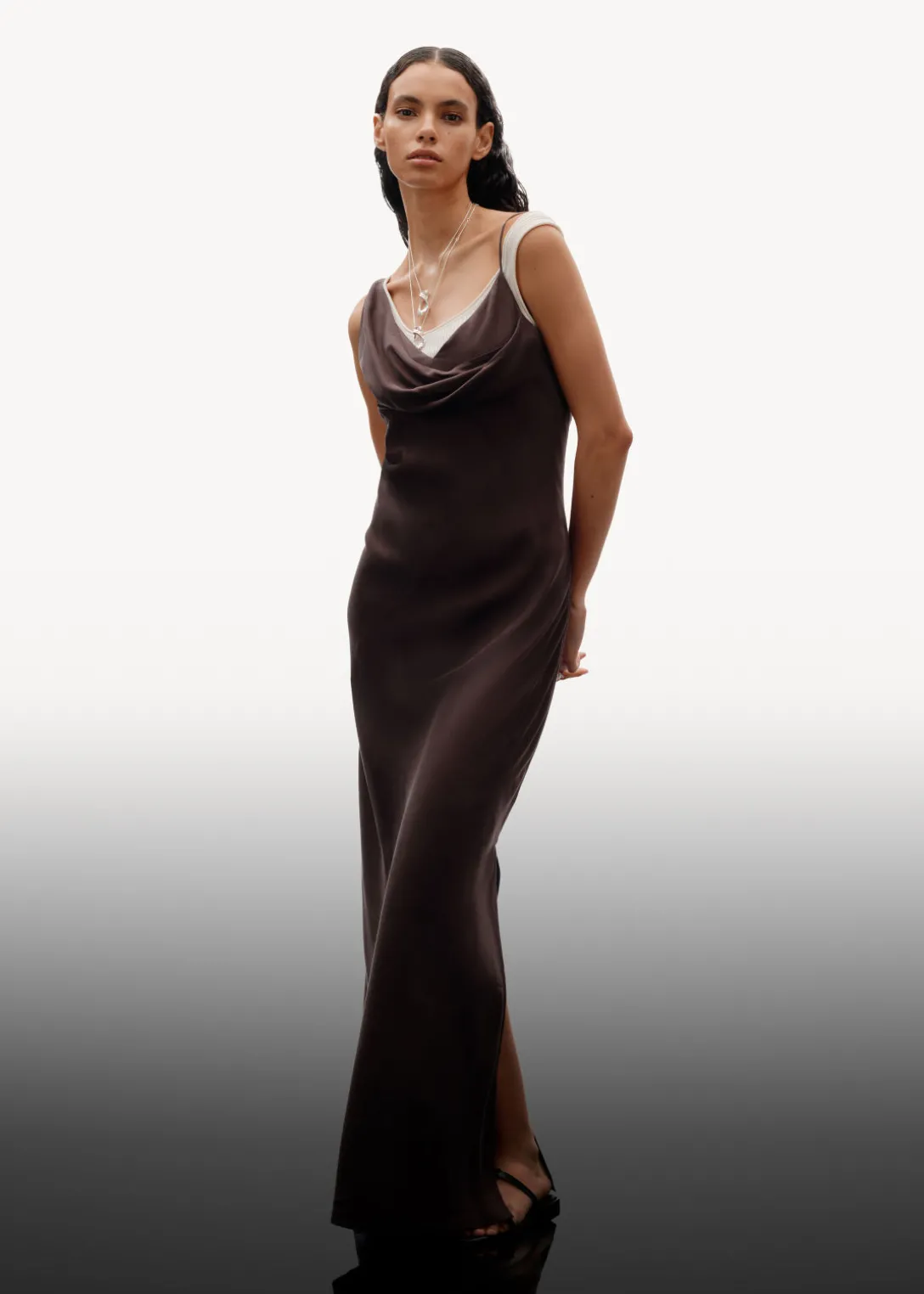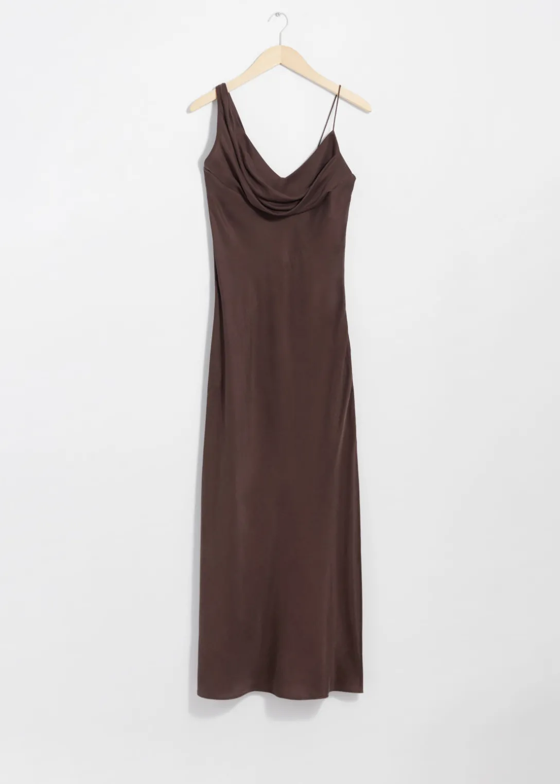Robe midi sans manches en soie, avec une encolure drapée et asymétrique.