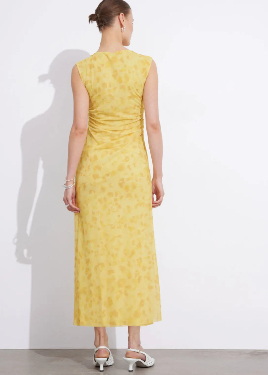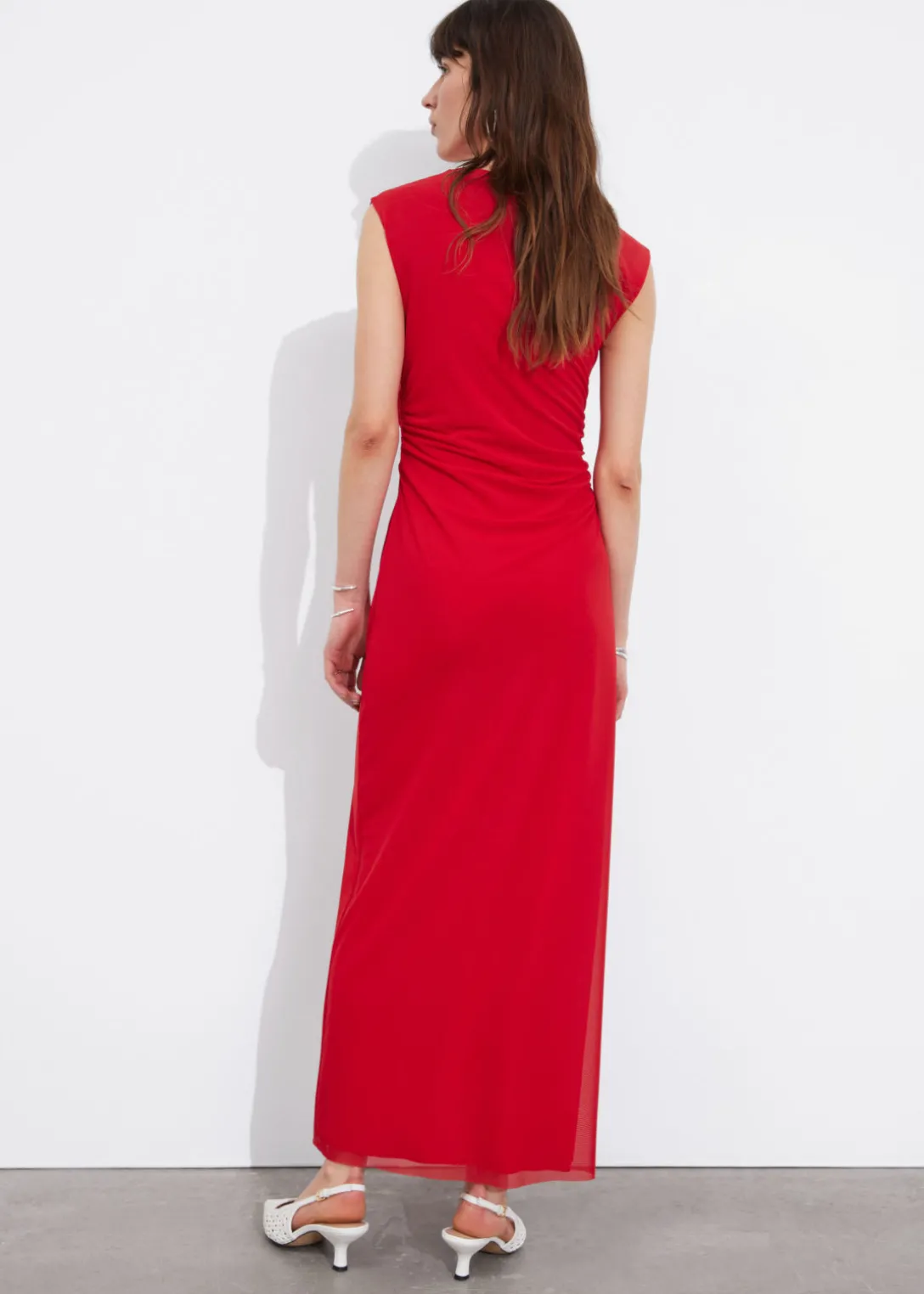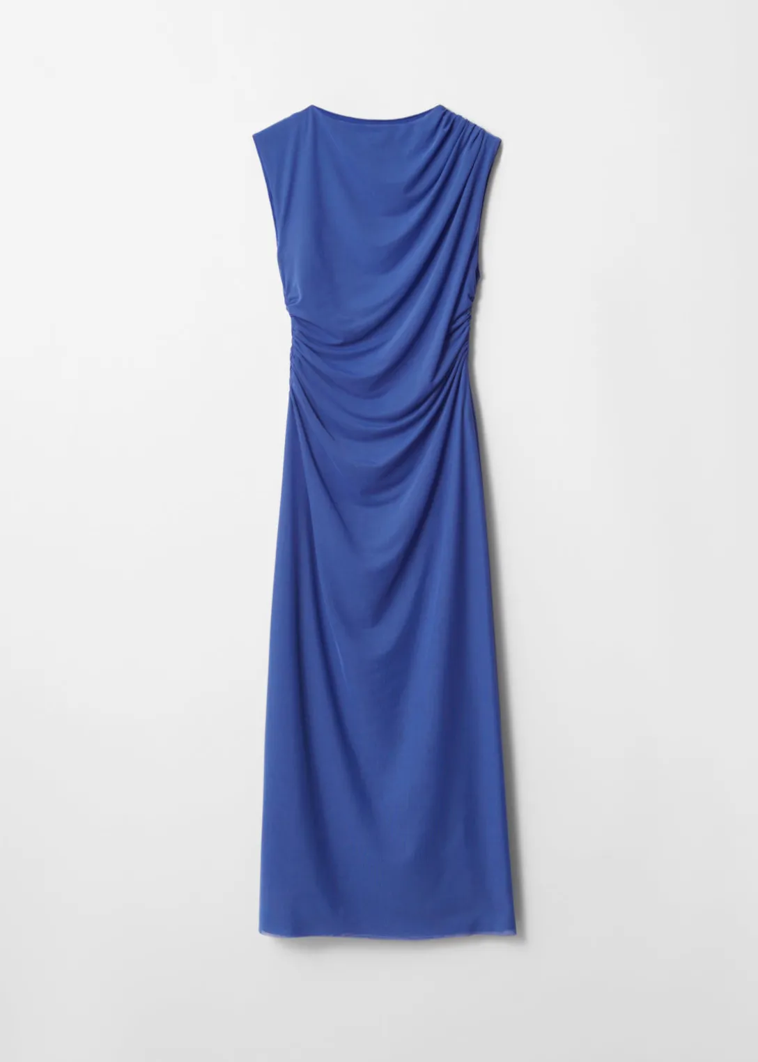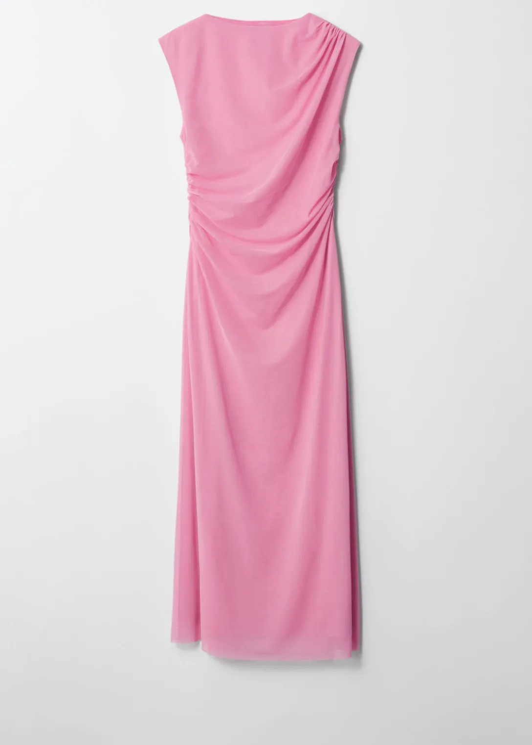 Robe midi ajustée sans manches avec une encolure bateau et des détails drapés.