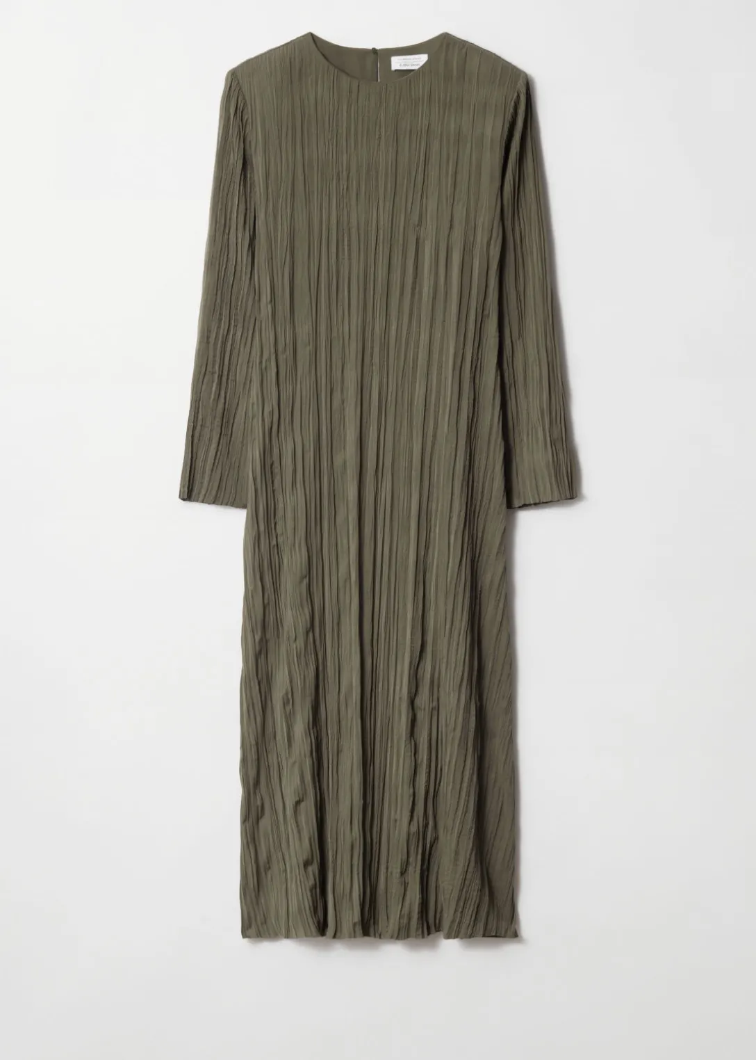 Robe midi à manches longues à effet froissé. Finie avec des épaules rembourrées.