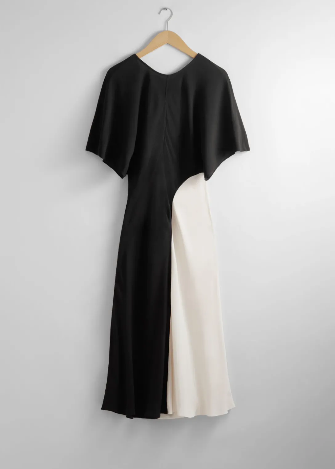 Robe midi en satin avec des manches volantées et des coutures courbées apparentes pour une finition légèrement drapée.