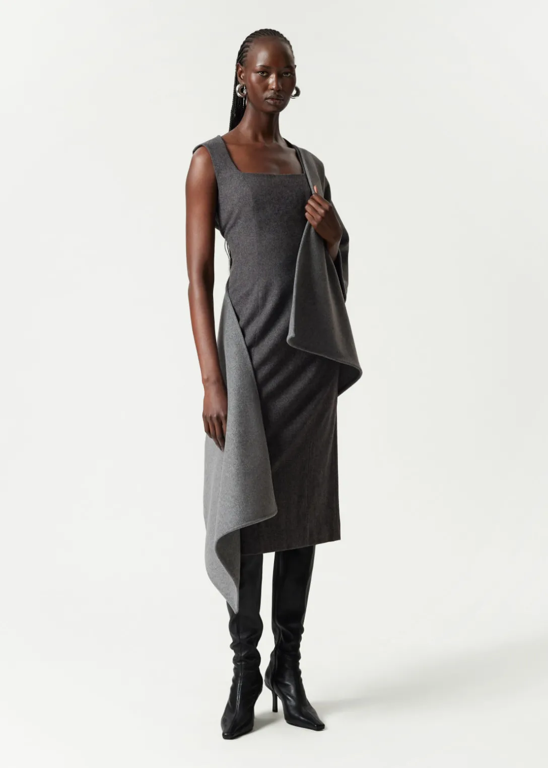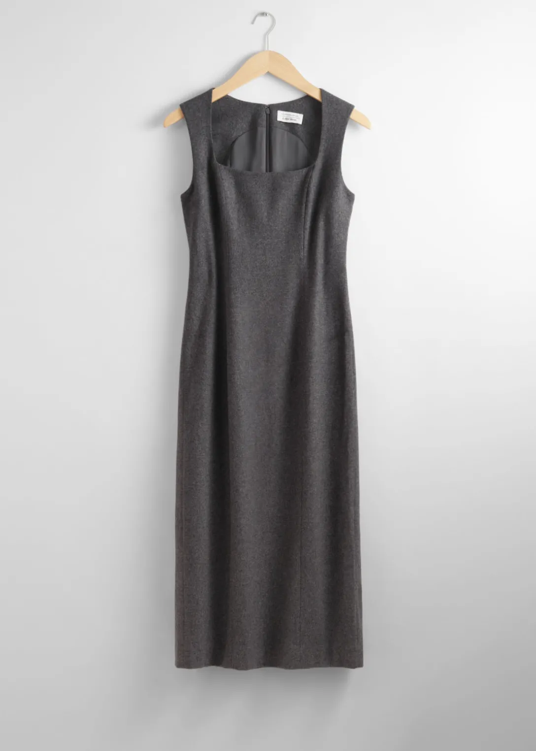 Robe midi sans manches en laine, avec une encolure carrée et une silhouette ajustée.