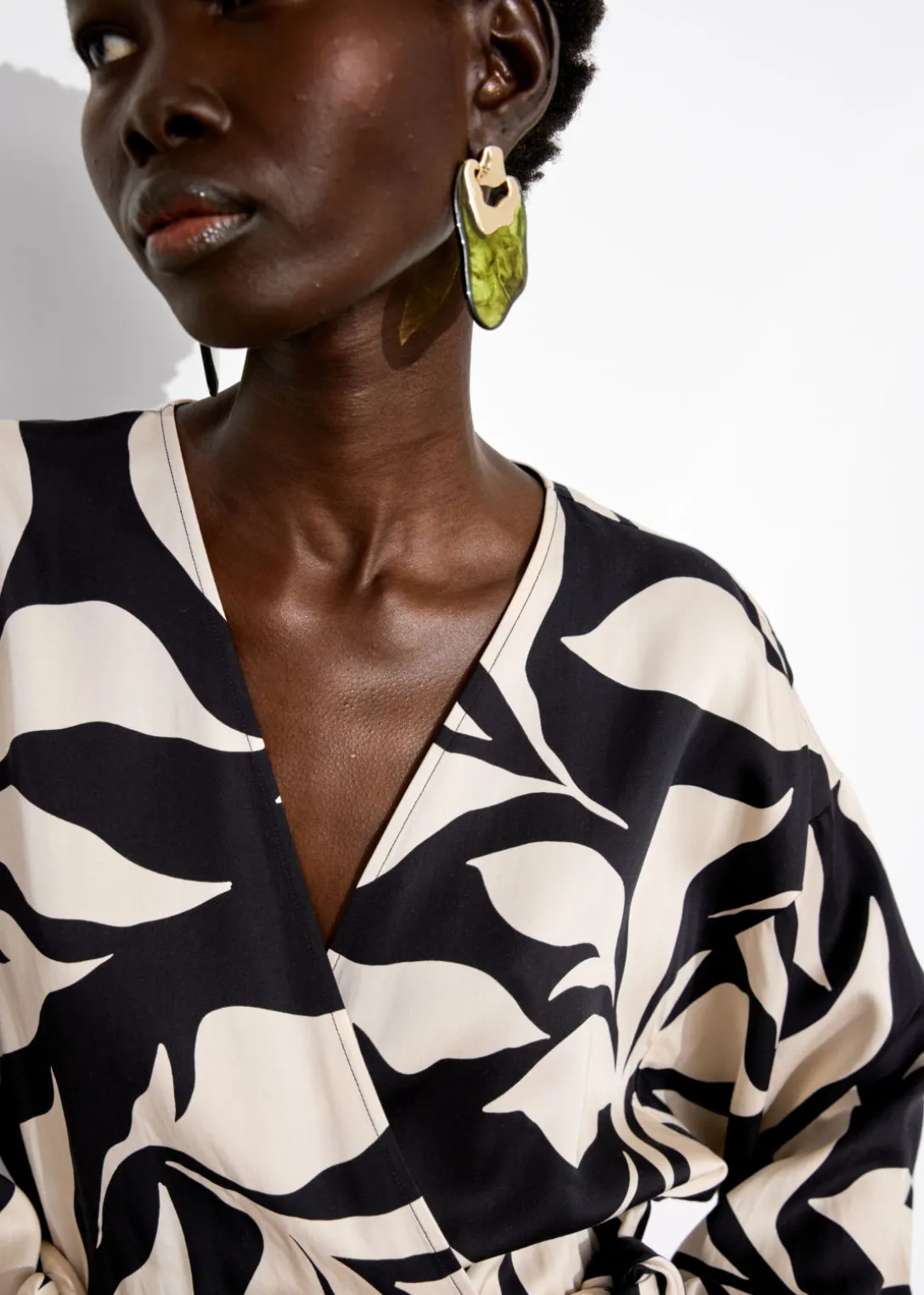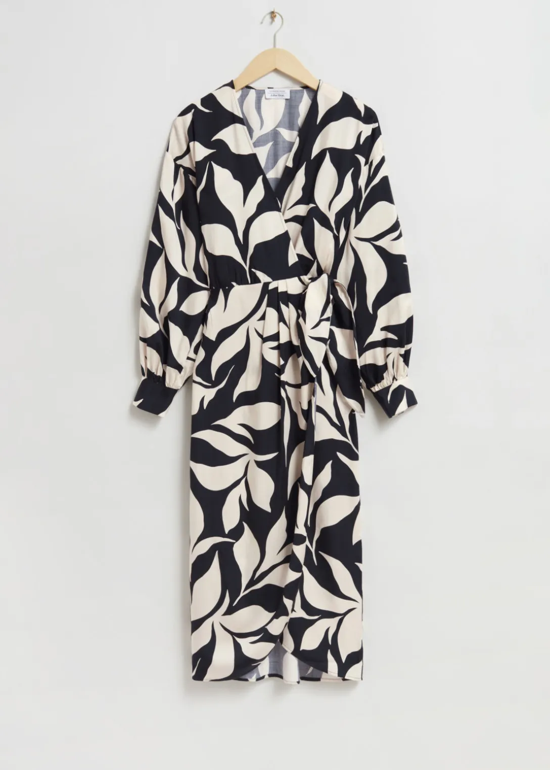 Robe portefeuille à col en V en tissu texturé, doux et soyeux. Dotée de longues manches style blouson amples, d’une taille ajustable, d’une coupe midi et d’une jupe drapée avec un ourlet forme tulipe arrondi.