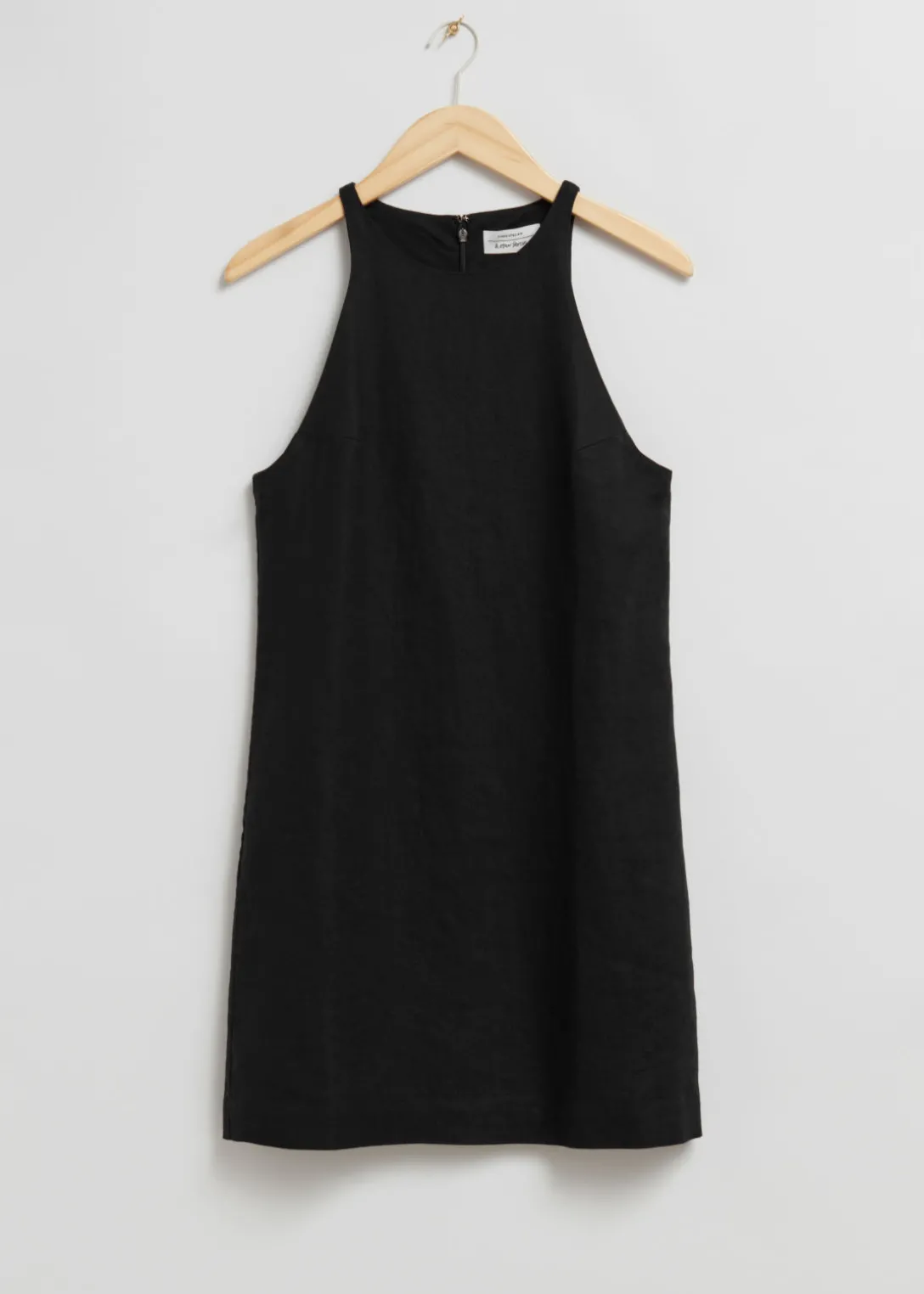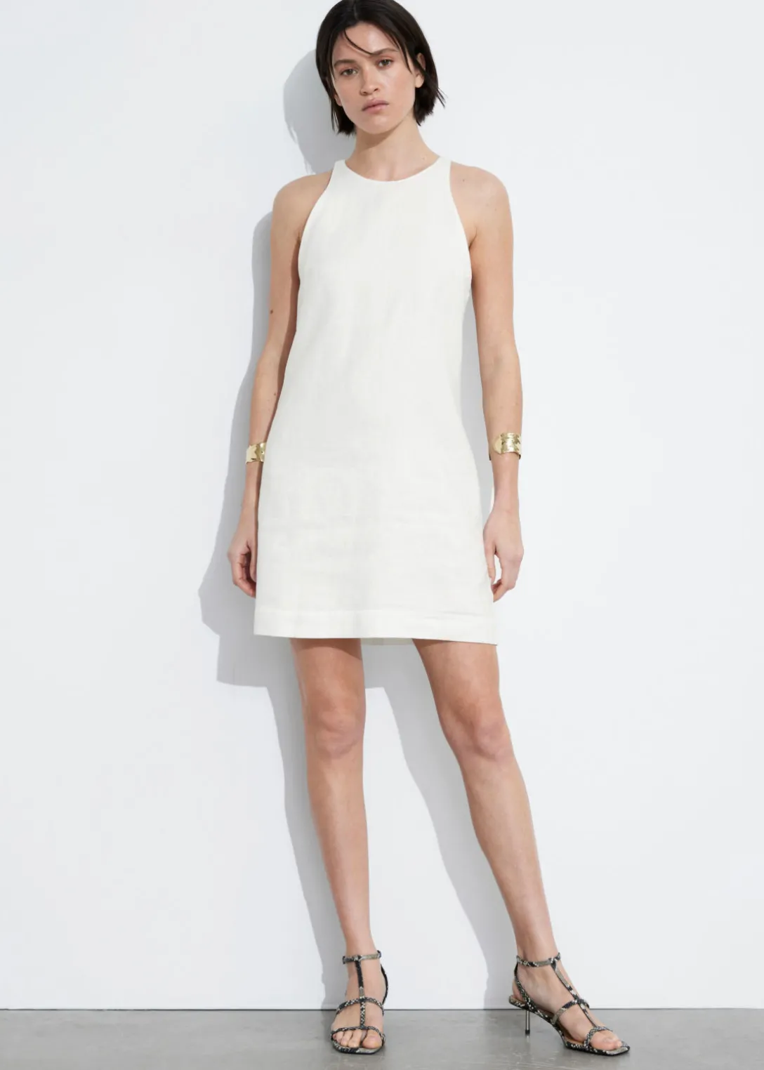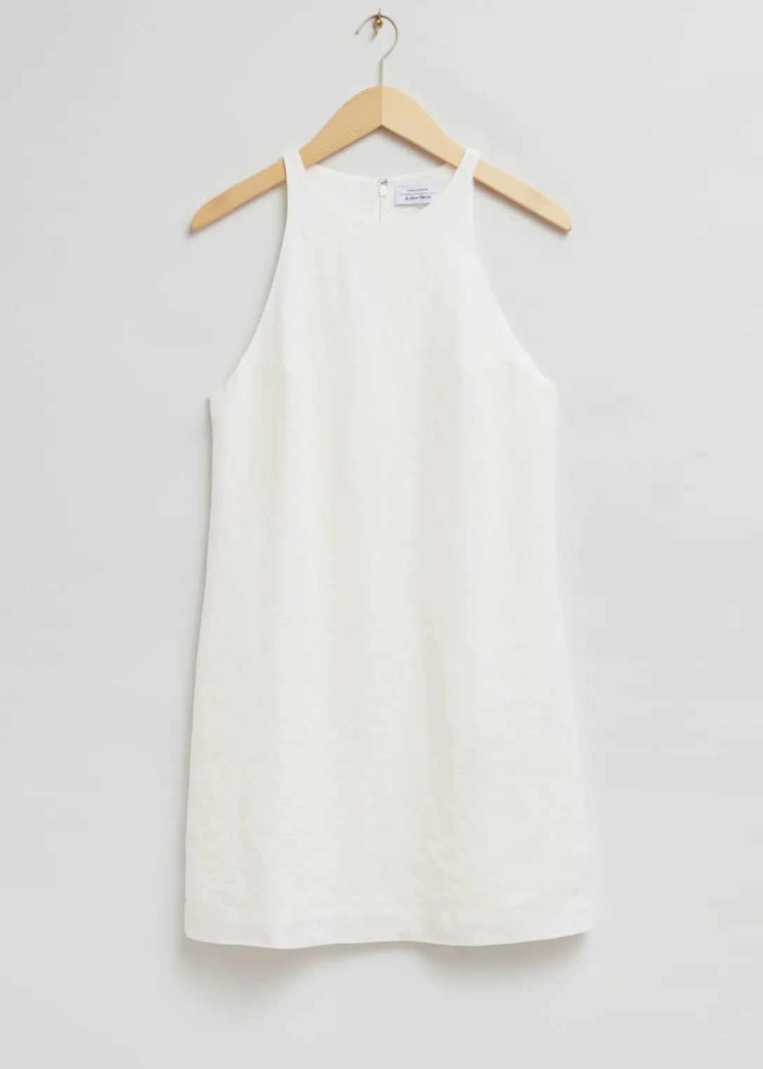 Robe trapèze courte en lin à col rond. Dotée d’une silhouette minimaliste, d’une fermeture invisible au centre dans le dos et de coutures sur toute la longueur.