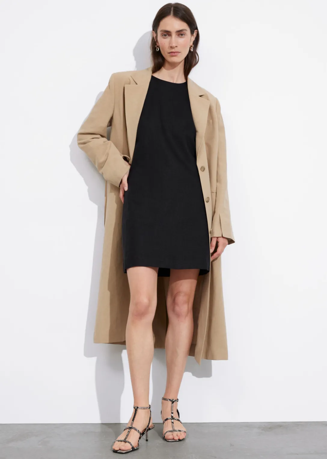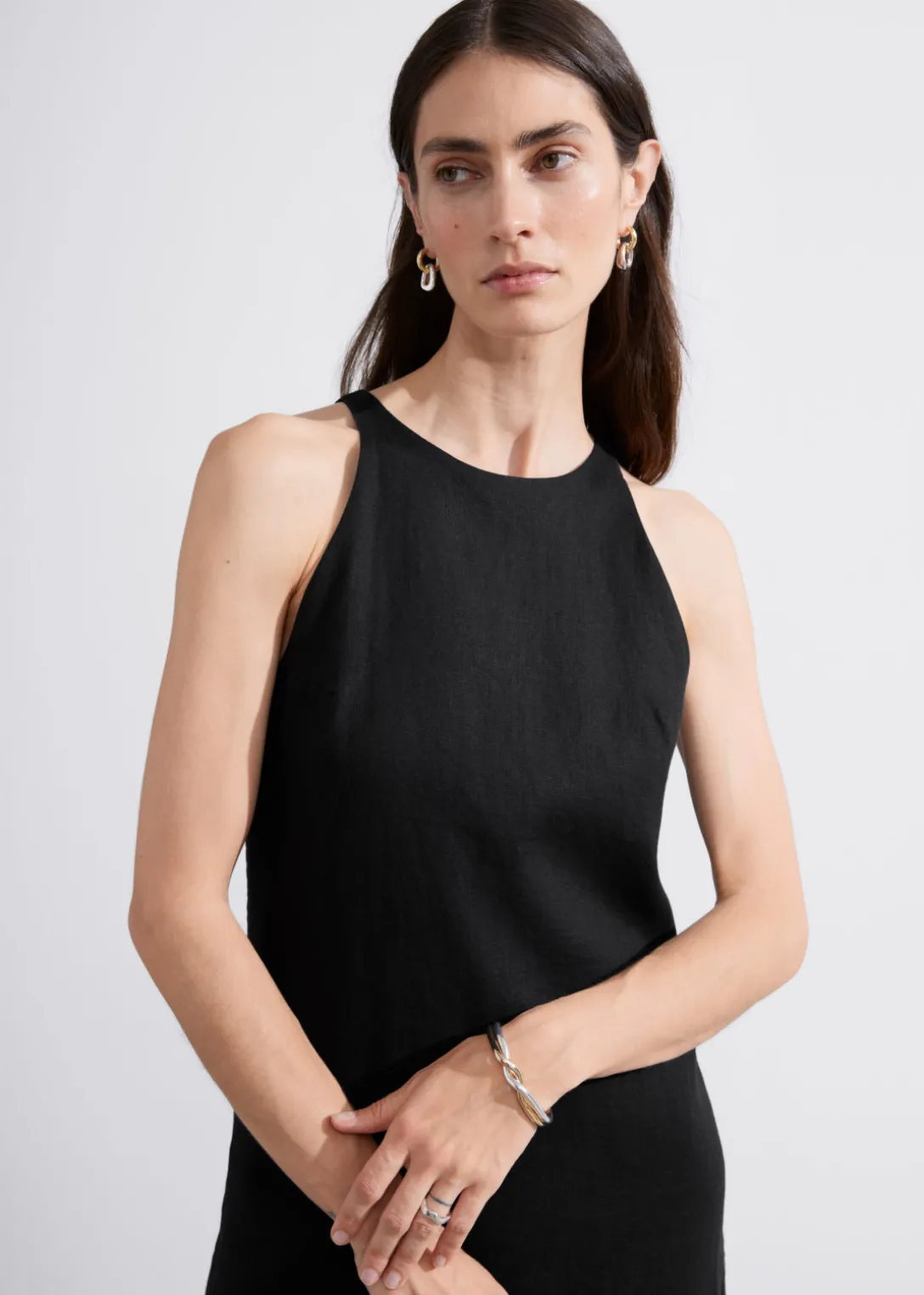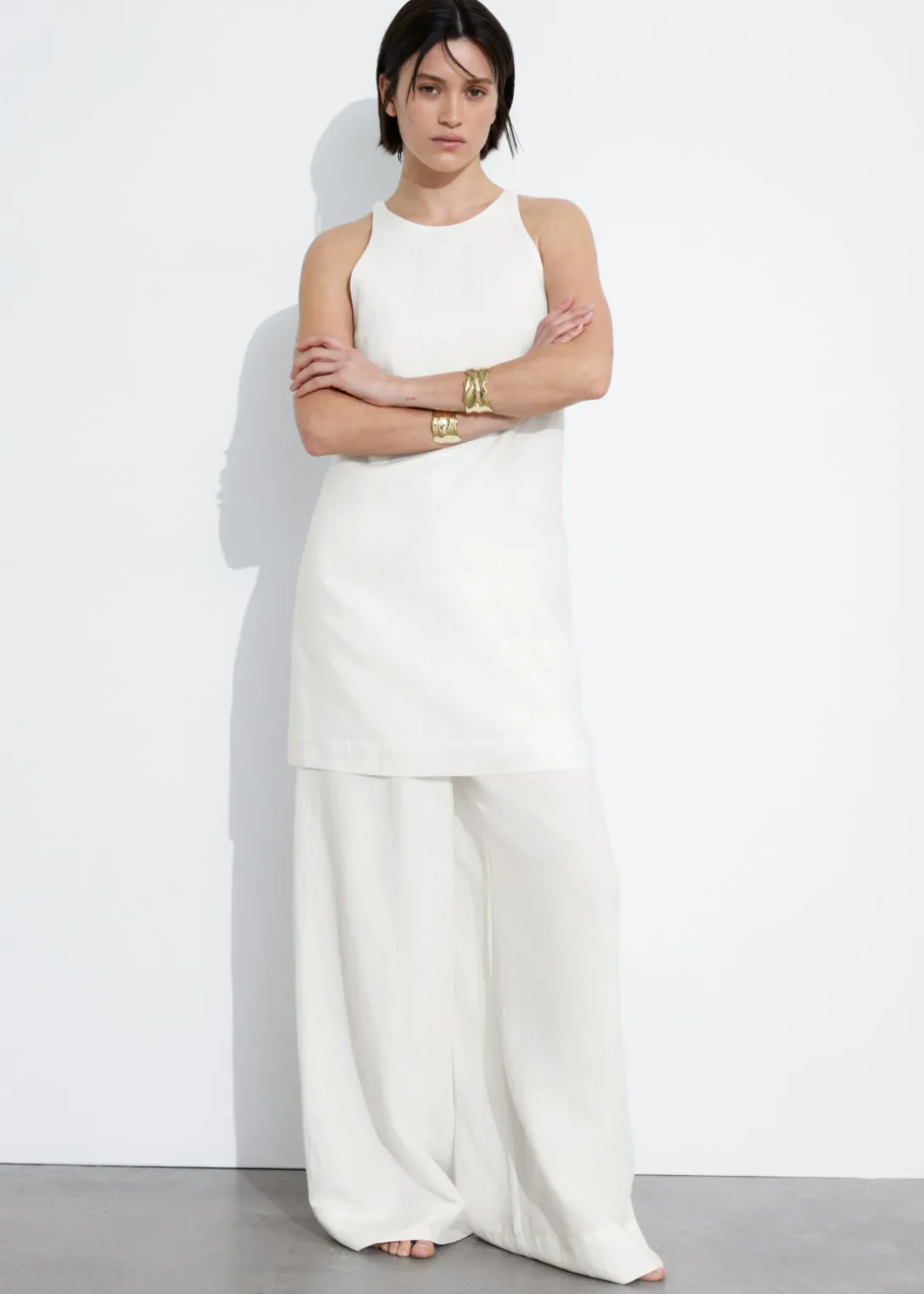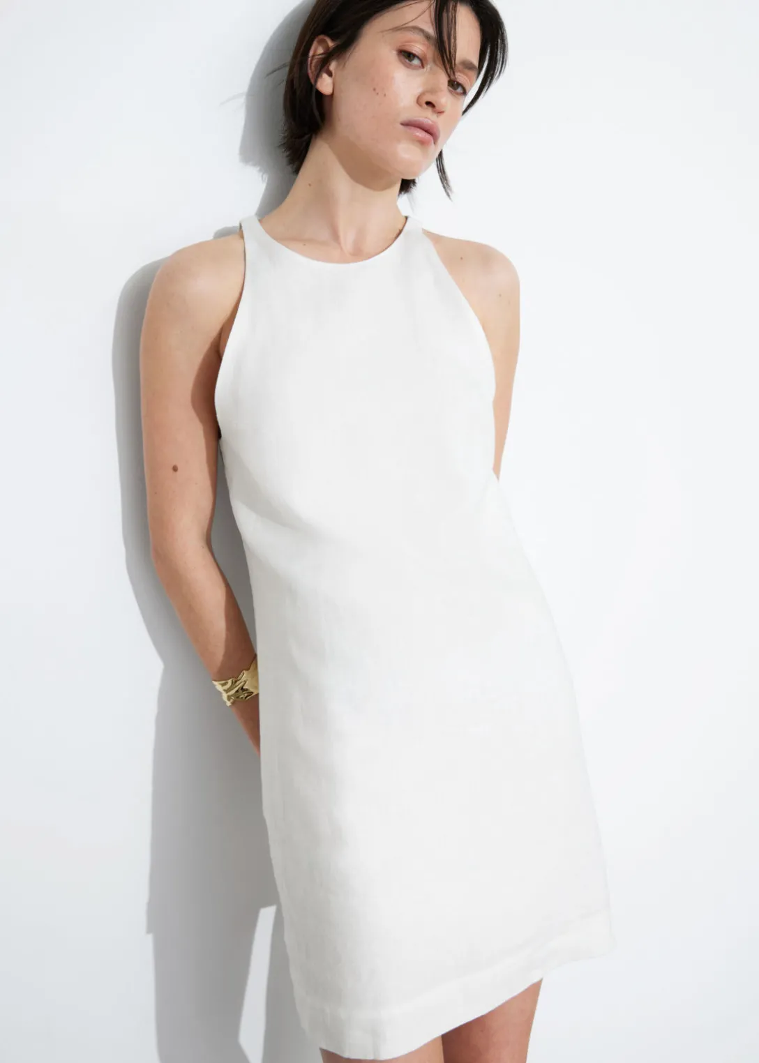 Robe trapèze courte en lin à col rond. Dotée d’une silhouette minimaliste, d’une fermeture invisible au centre dans le dos et de coutures sur toute la longueur.