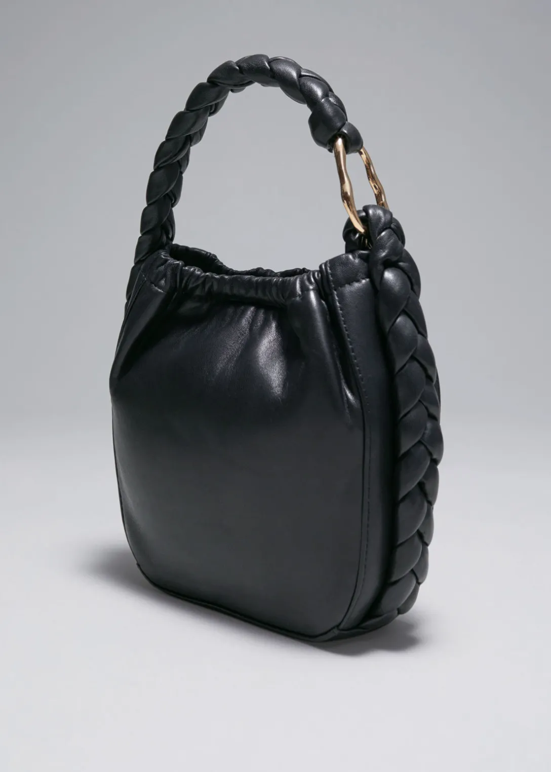 Confectionné en cuir souple, ce sac a une forme de seau doux. Ce petit sac est agrémenté d’une anse tressée et de ferrures dorées. L’intérieur doublé de coton contient une poche intérieure et une fermeture magnétique dissimulée.