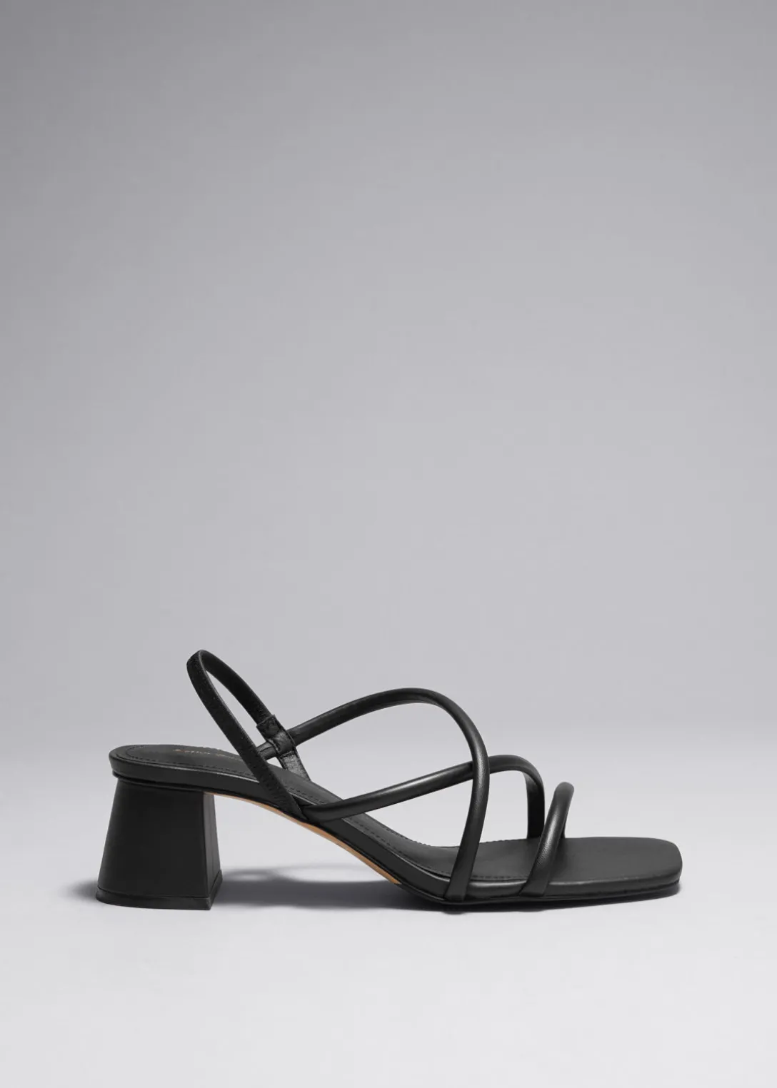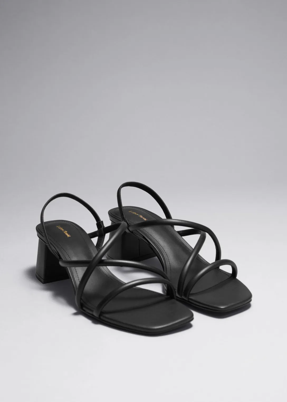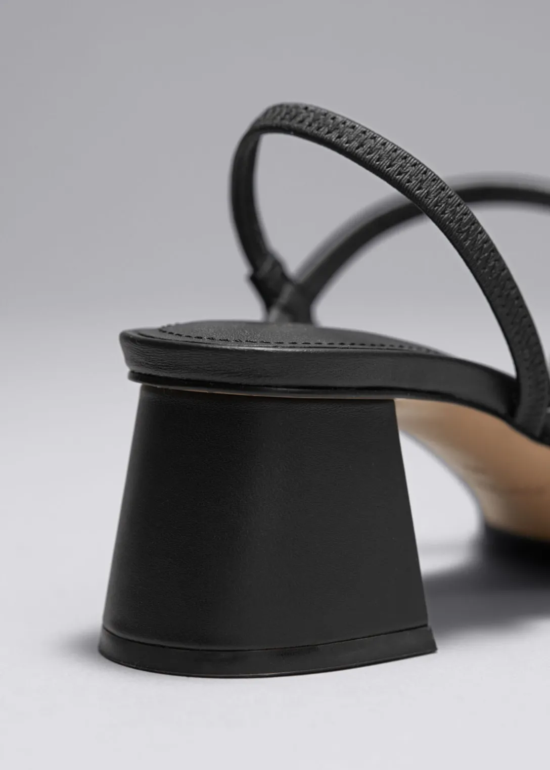 Sandales à talons épais confectionnées en cuir souple et dotées d’une silhouette minimaliste à brides, avec une sangle élastique à l’arrière pour un meilleur ajustement.