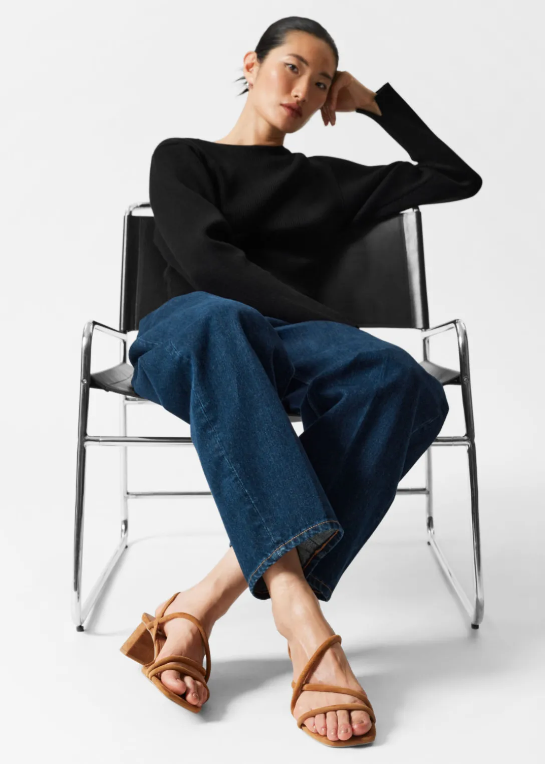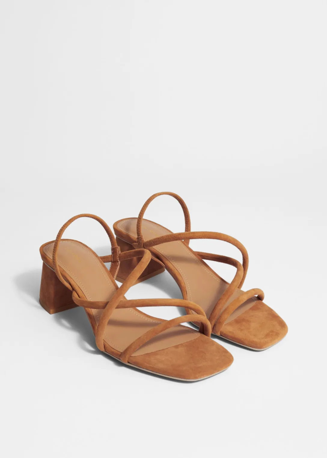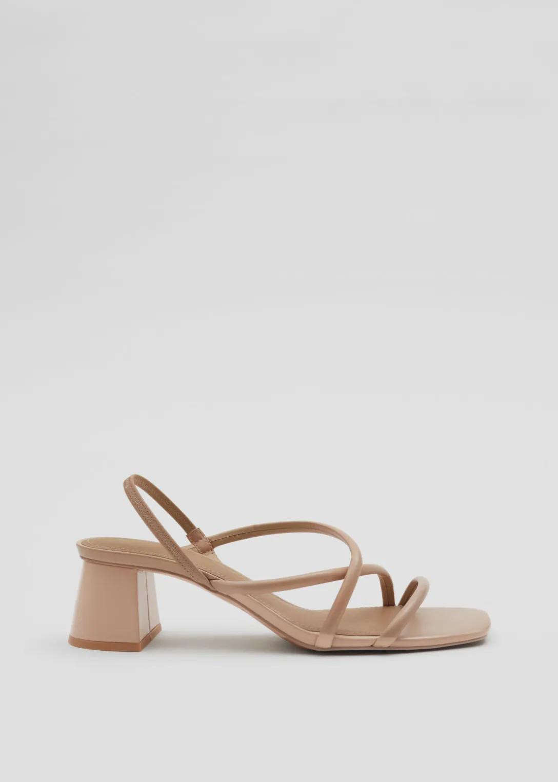 Sandales à talons épais confectionnées en cuir souple et dotées d’une silhouette minimaliste à brides, avec une sangle élastique à l’arrière pour un meilleur ajustement.