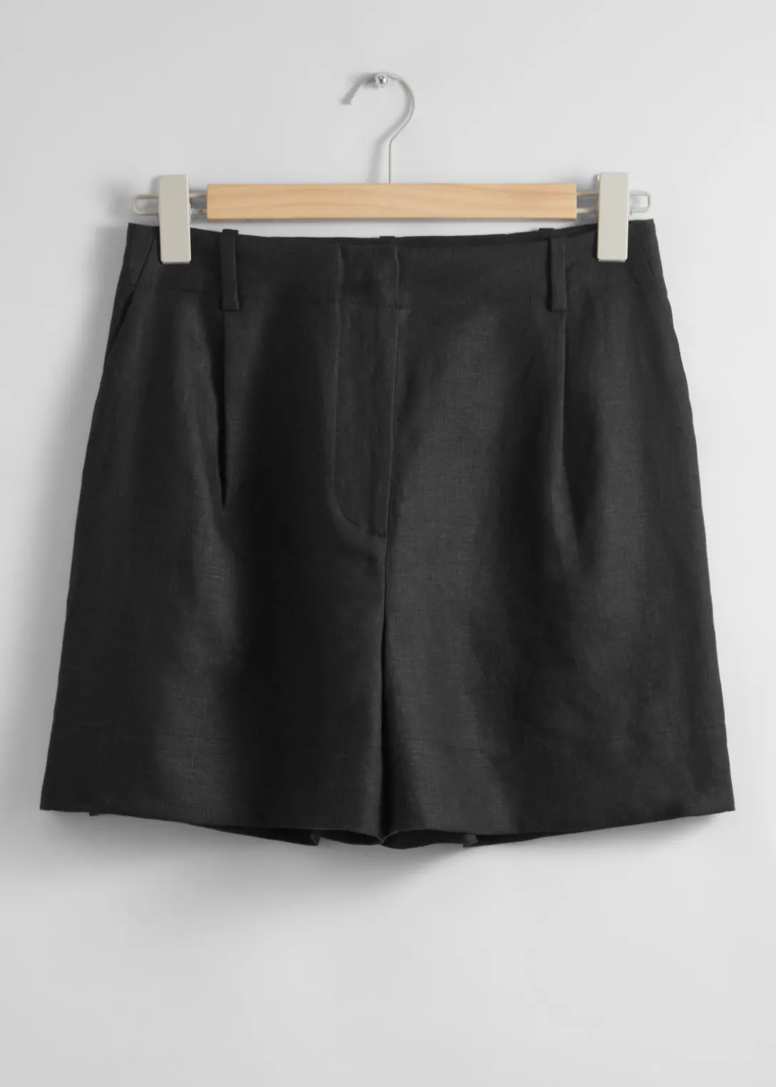 Short à taille haute en lin, avec des plis au centre à l’avant créant une finition habillée.