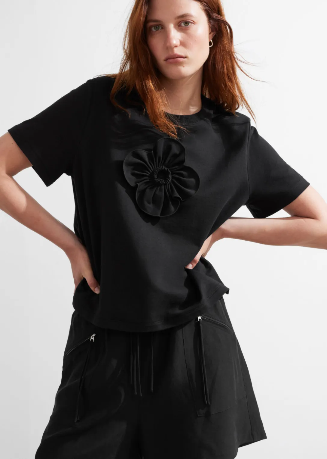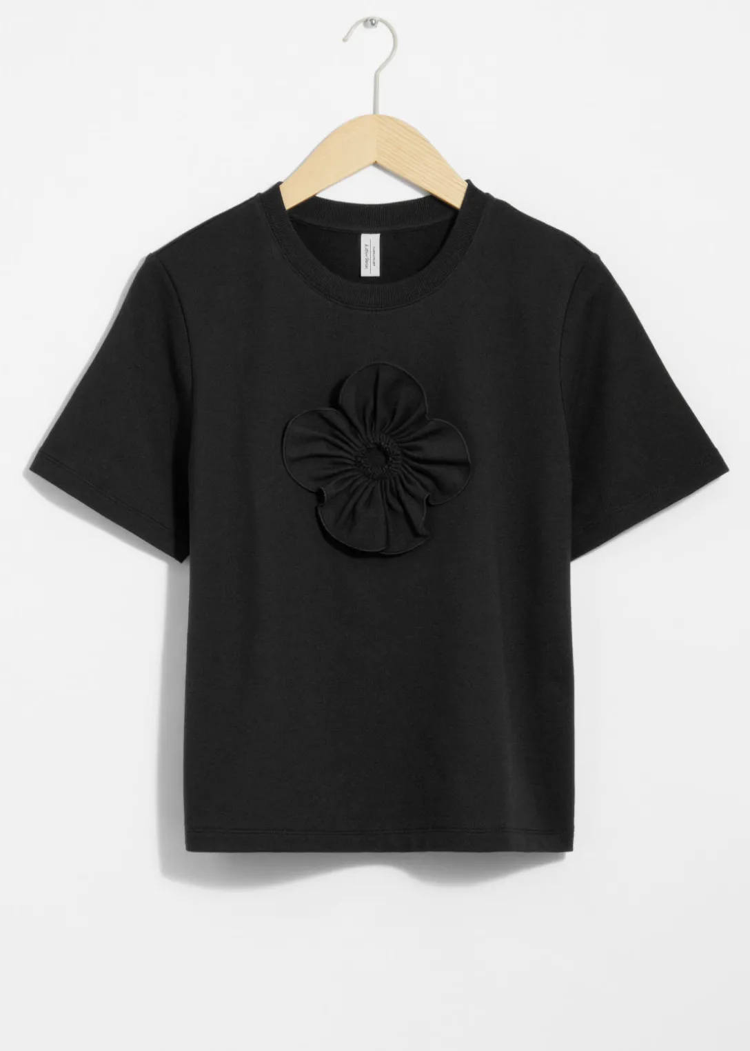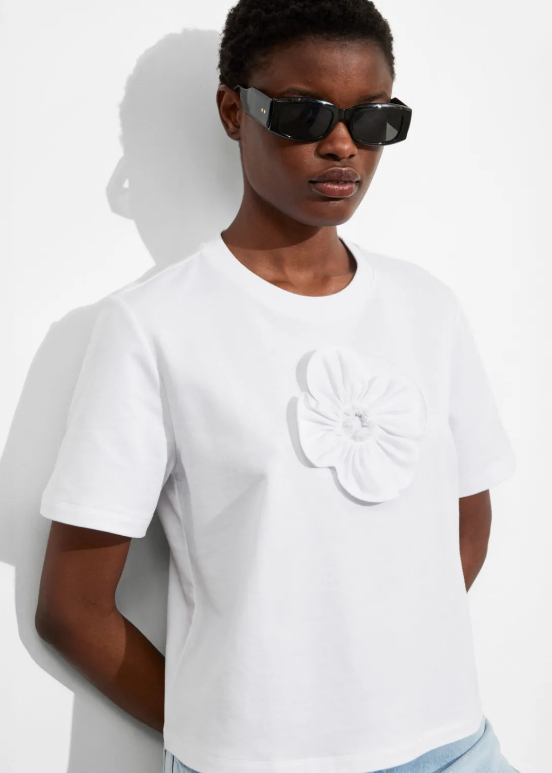 T-shirt à col rond, avec un grand motif floral appliqué au centre devant.