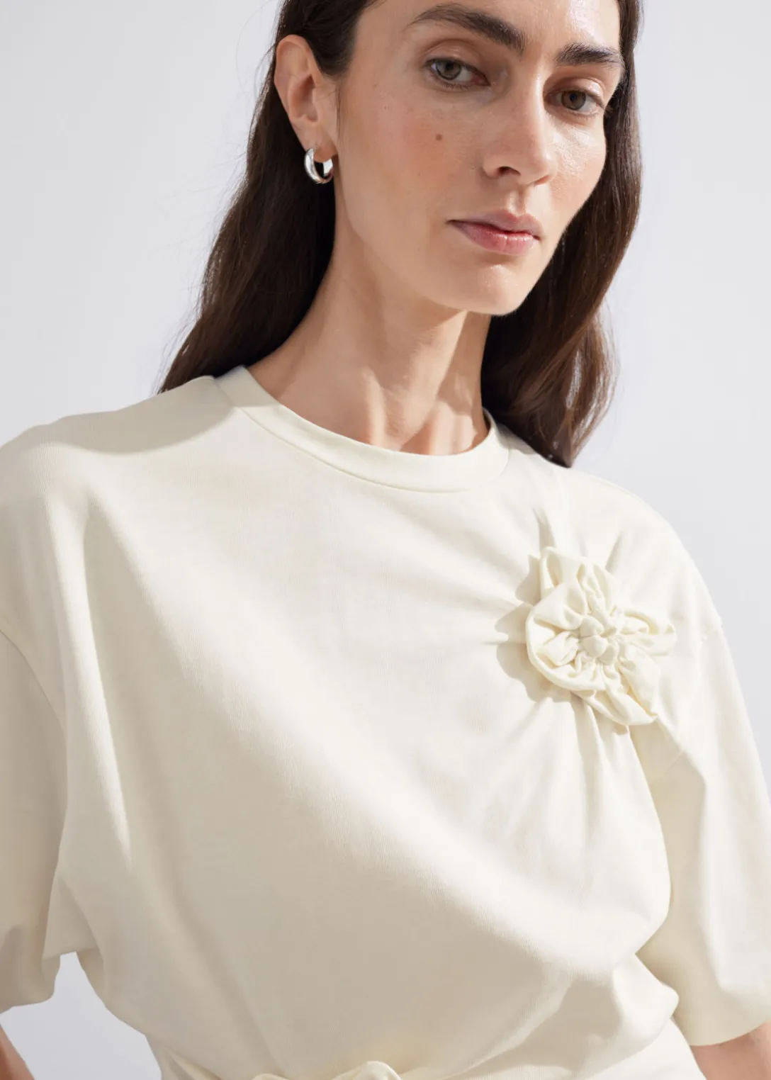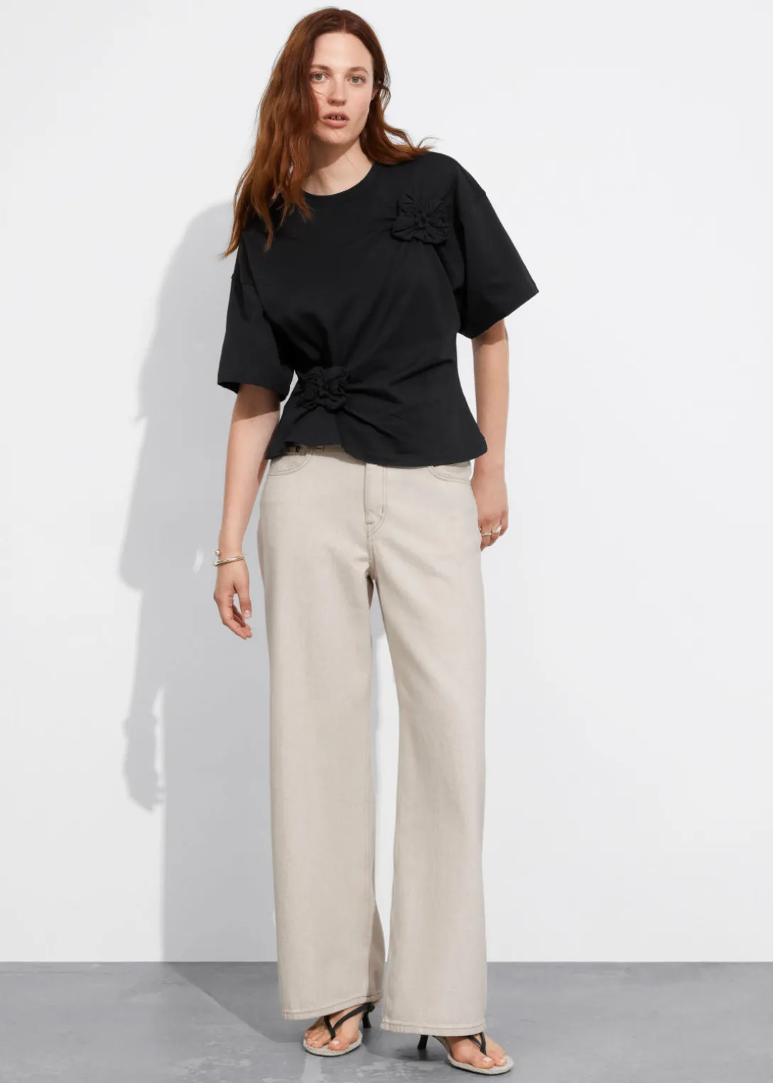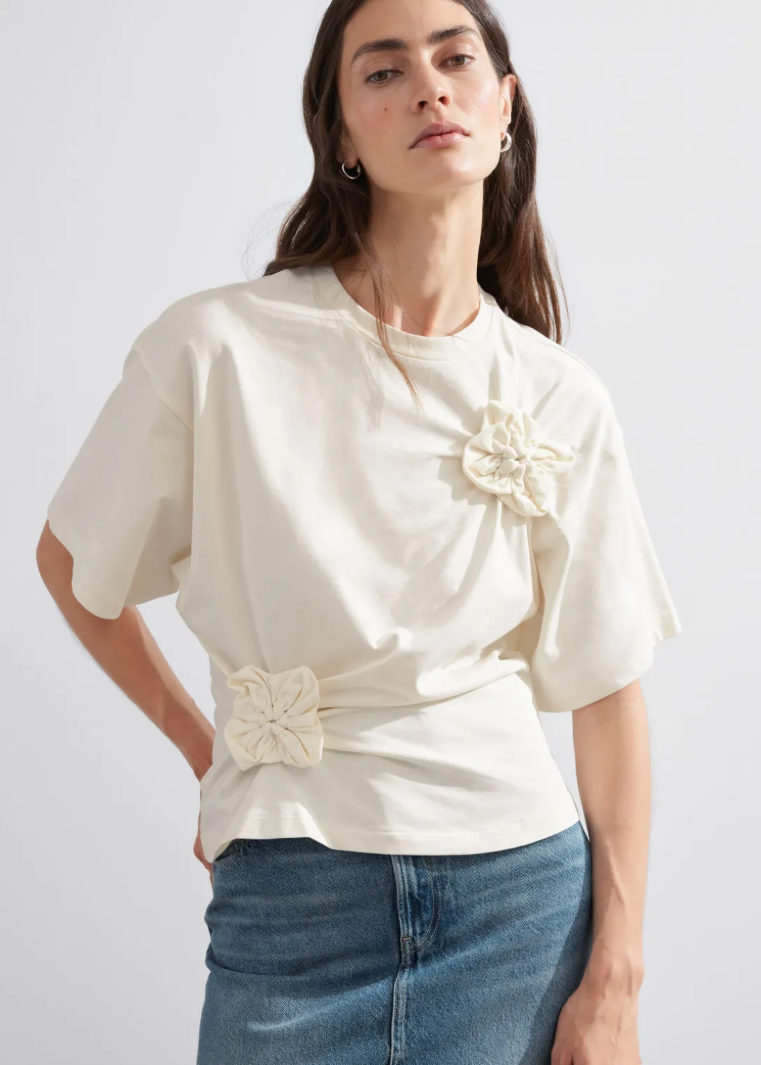 T-shirt à col ras du cou, avec des détails froncés ornés de motifs floraux appliqués ton sur ton.