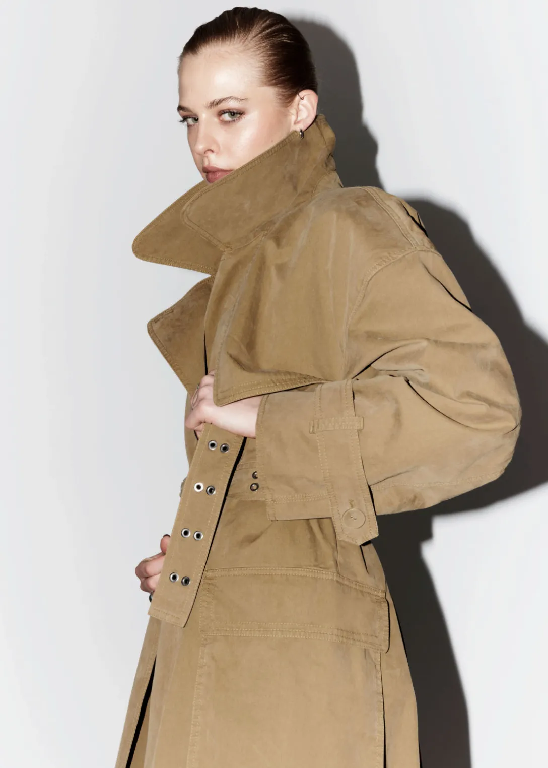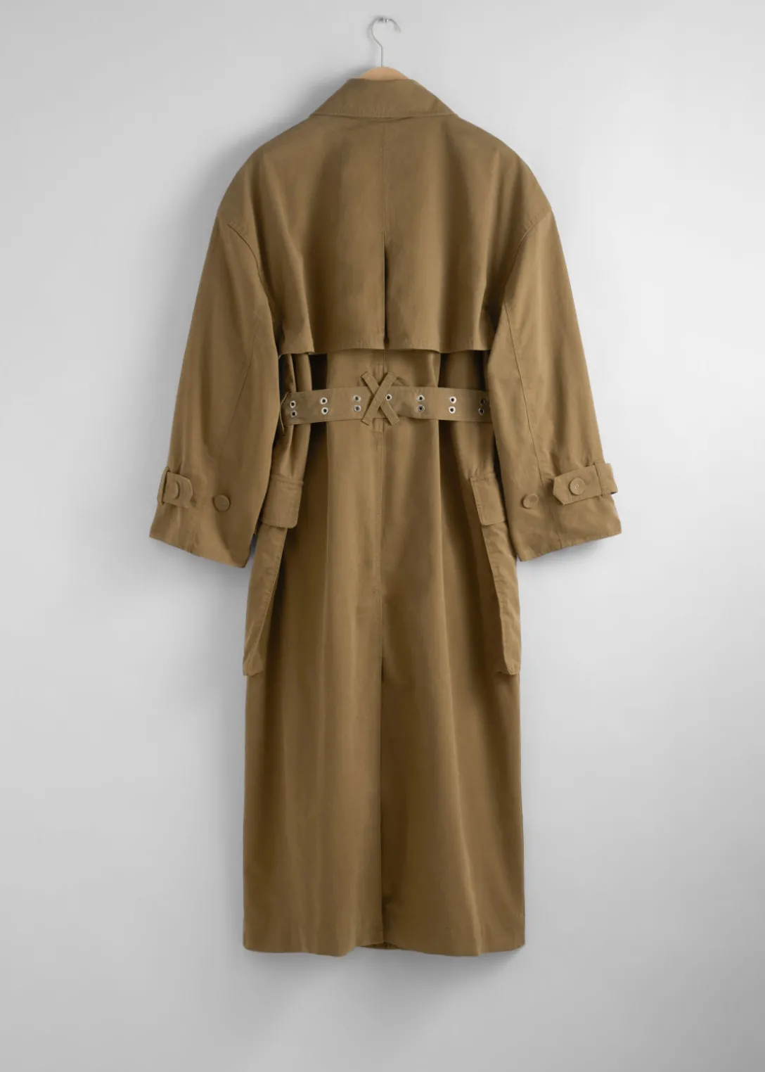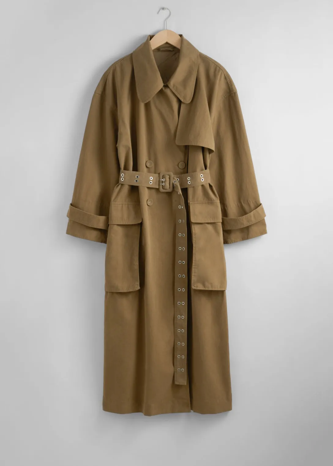 Trench-coat croisé avec deux grandes poches à rabat et une ceinture à boucle ton sur ton.