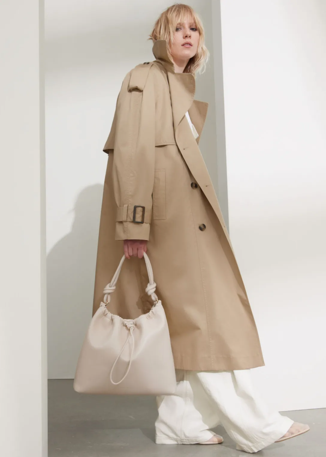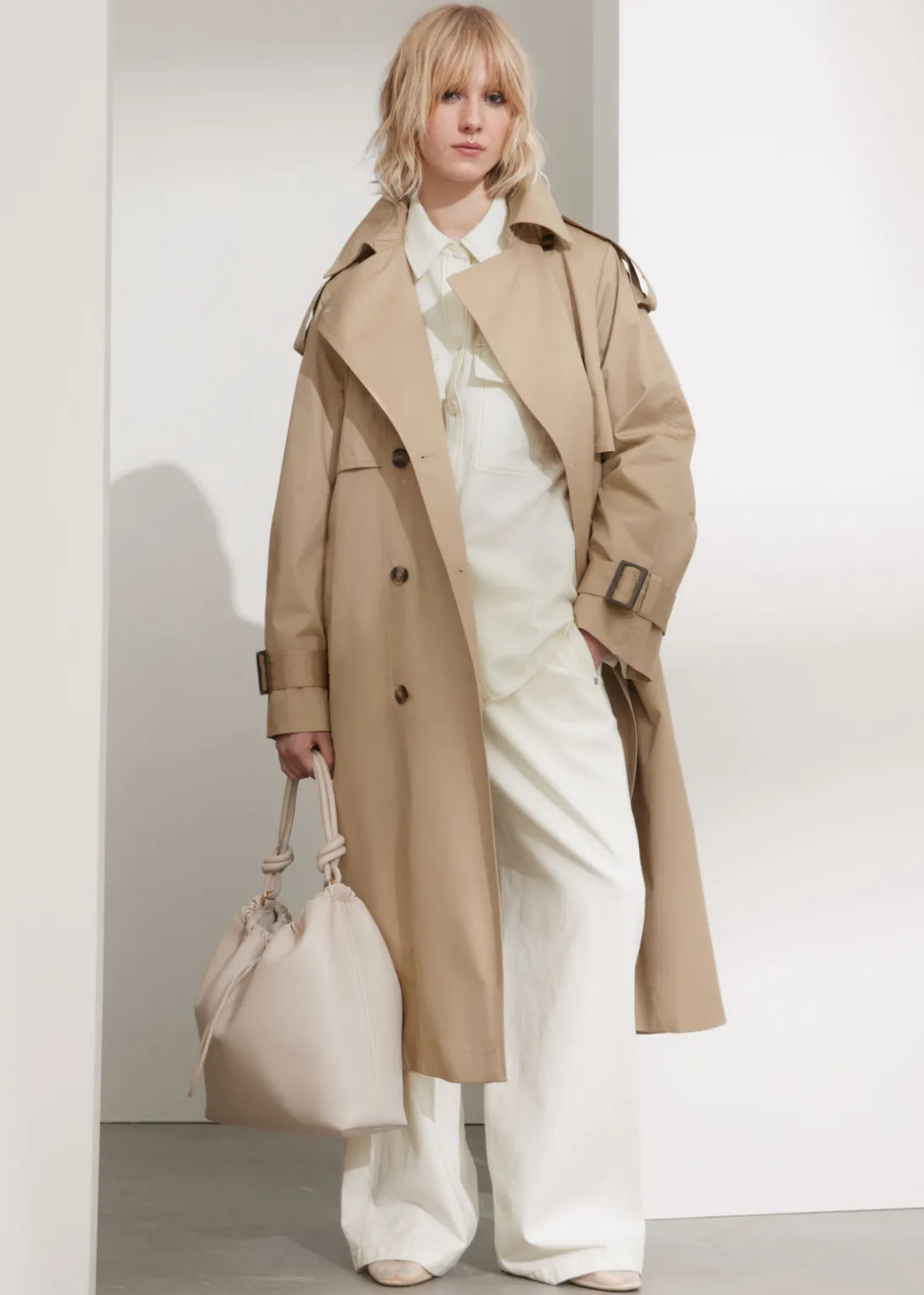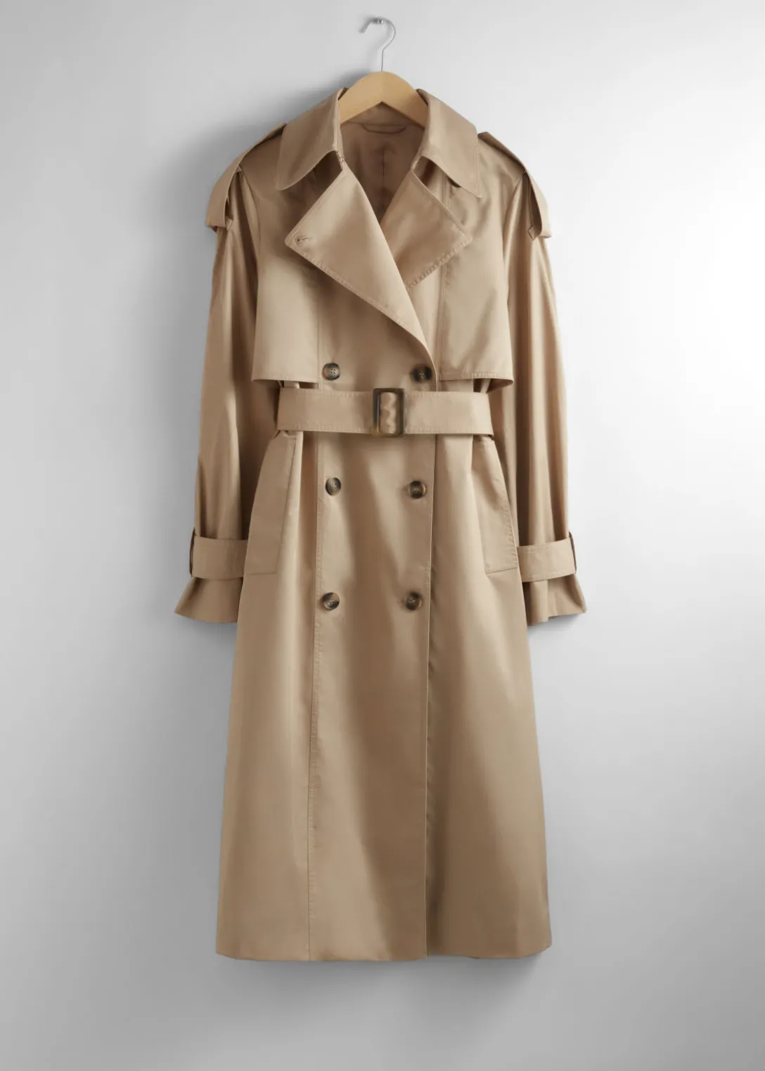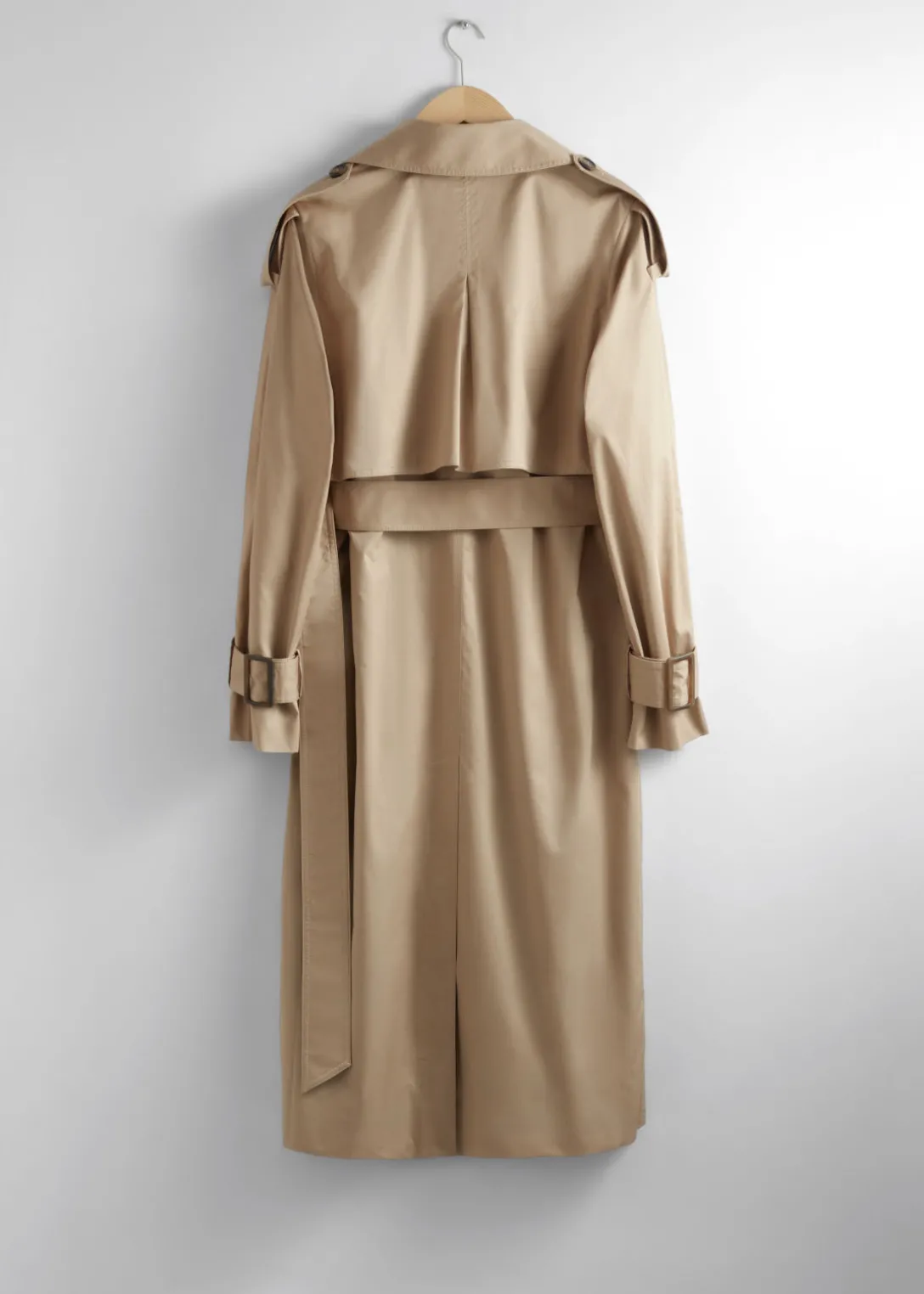 Trench-coat croisé avec des rabats devant et derrière ainsi que des épaulettes.