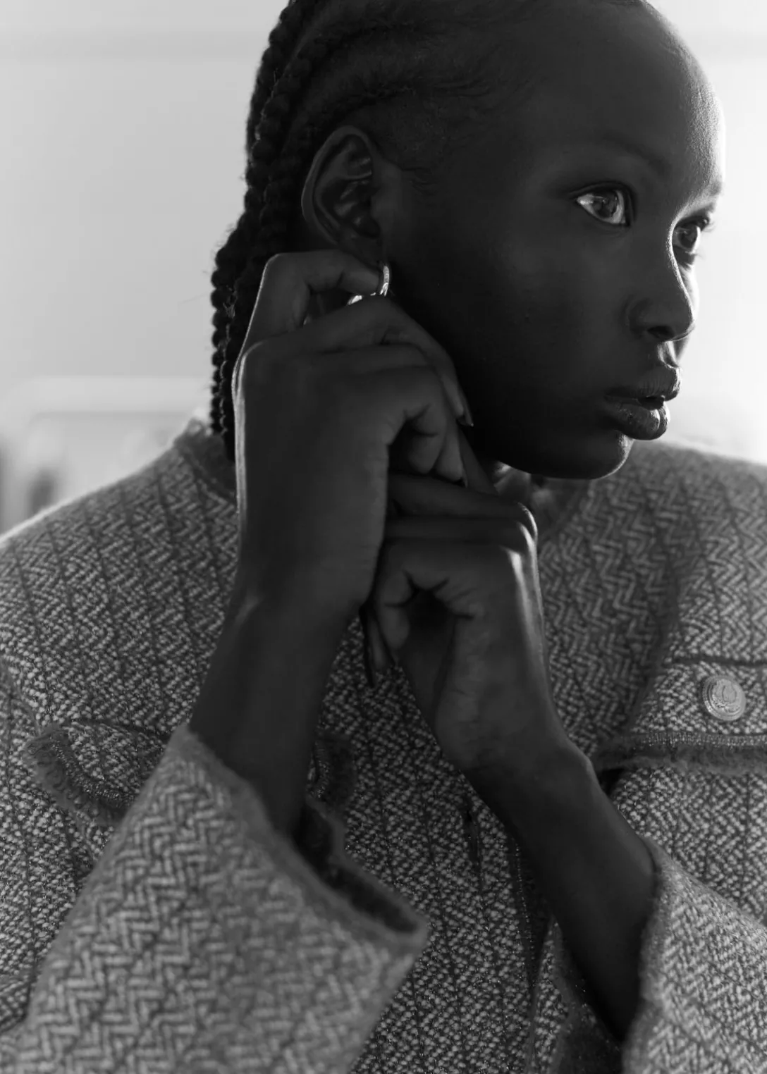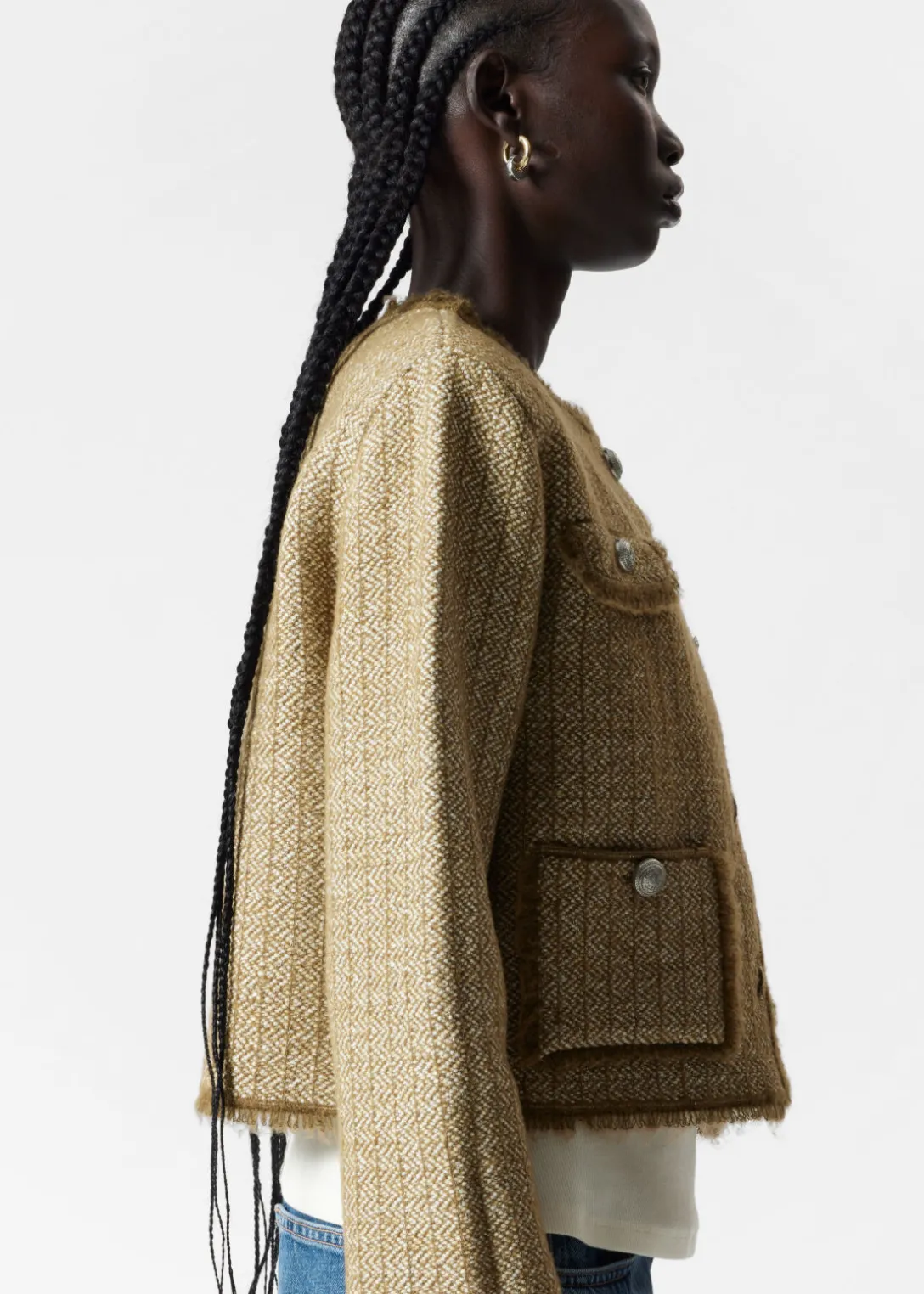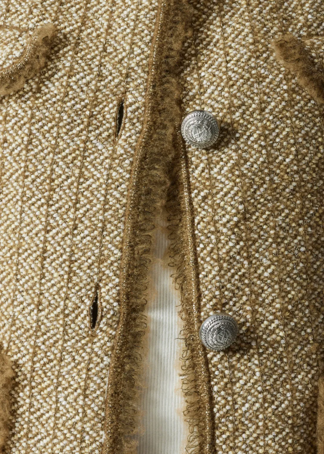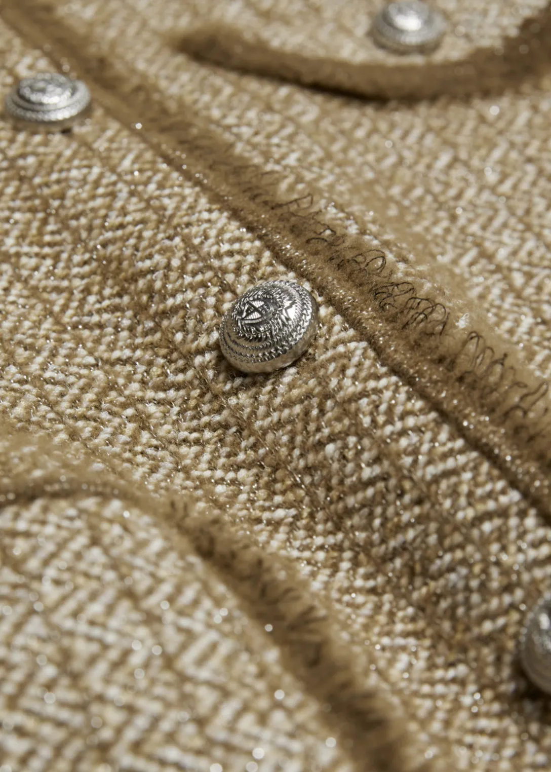 Veste courte en tweed avec une finition métallisée subtile. Dotée d’épaulettes, de touches contrastées et d’une fermeture boutonnée en métal.
