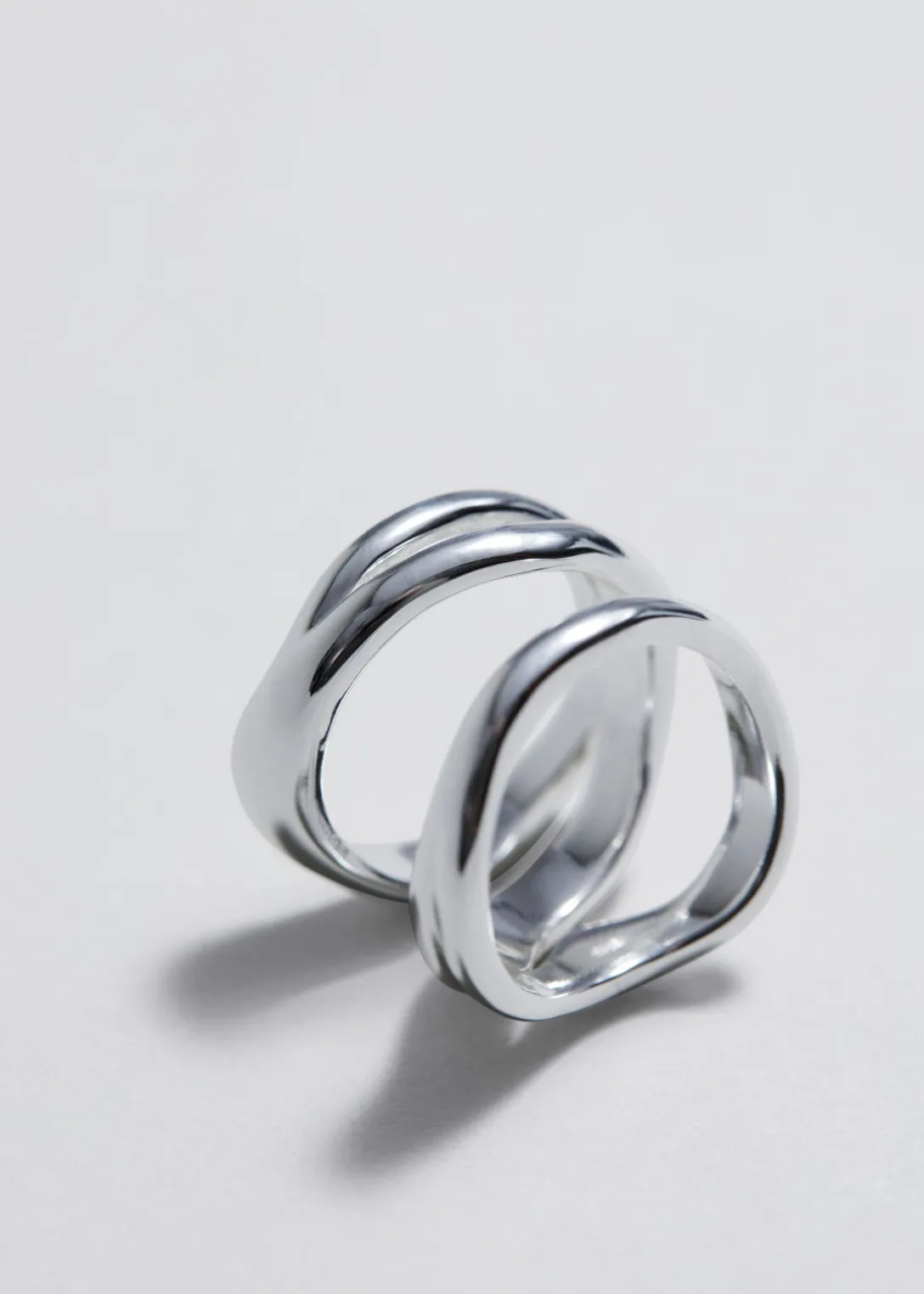 Cette bague à trois anneaux en laiton possède une finition brillante.