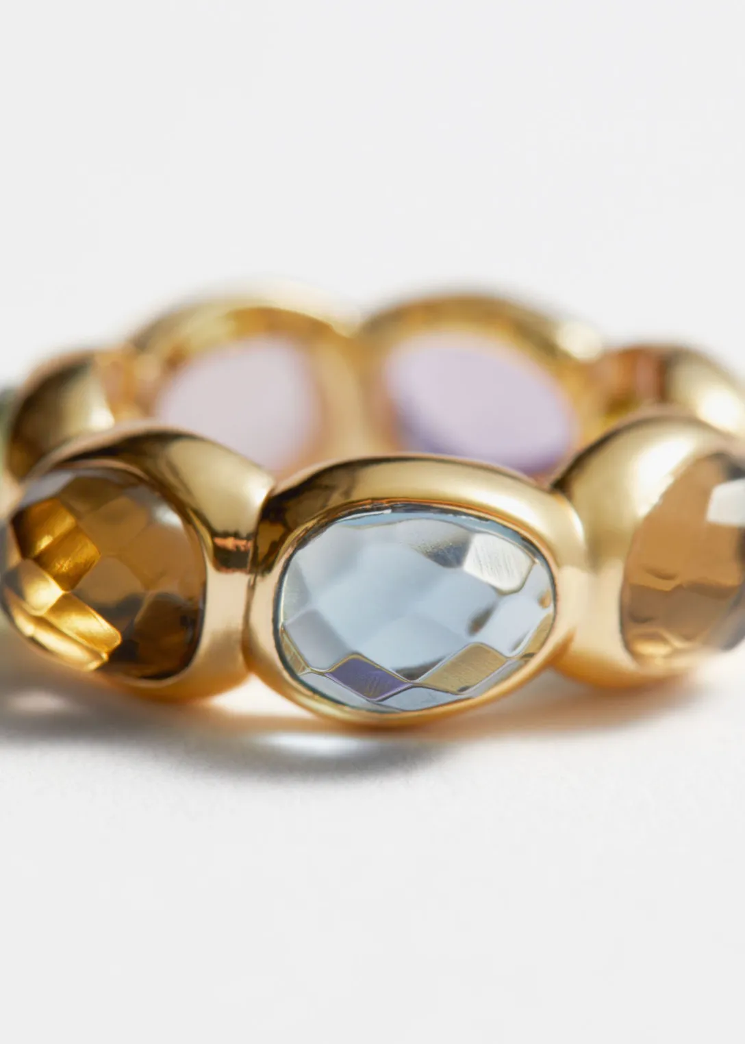 Cette bague a été fabriquée en laiton poli et couronnée de sept cristaux colorés. Portez-la seule ou avec d’autres bagues au même doigt.