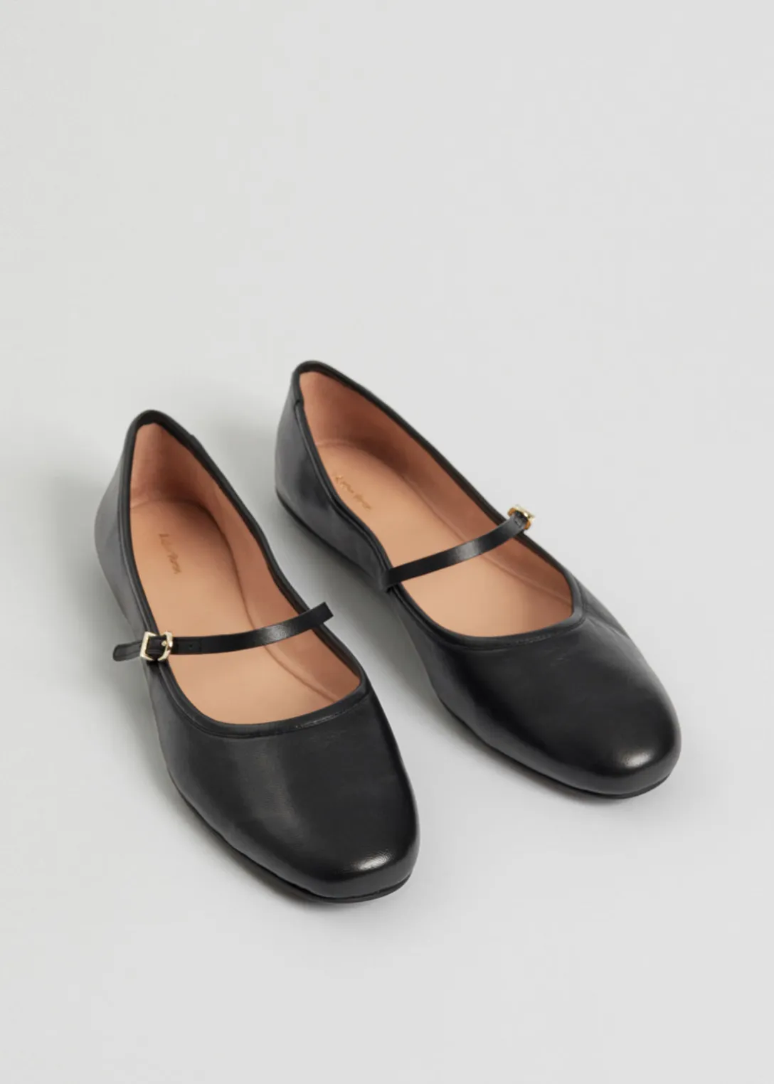 Ballerines Mary Jane en cuir dotées d’une silhouette classique. Confectionnées en cuir souple, dotées d’un bout carré arrondi et ornées d’une boucle demi-lune dorée.