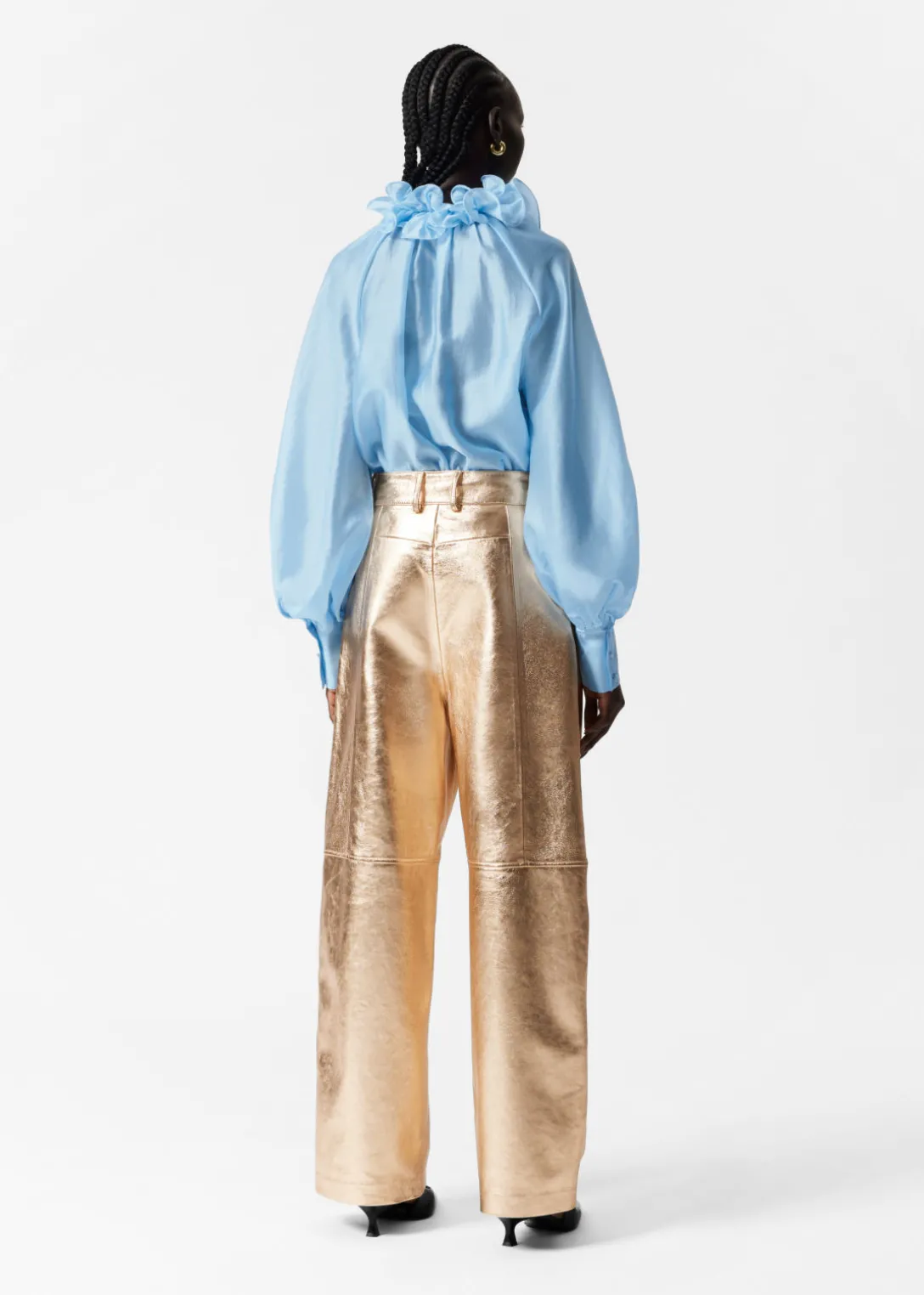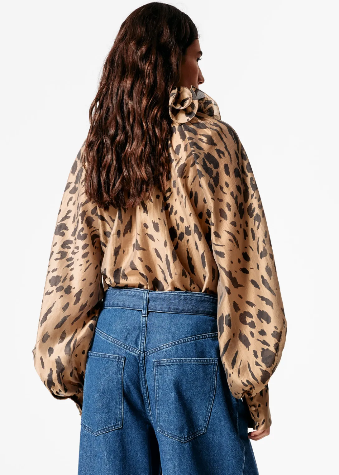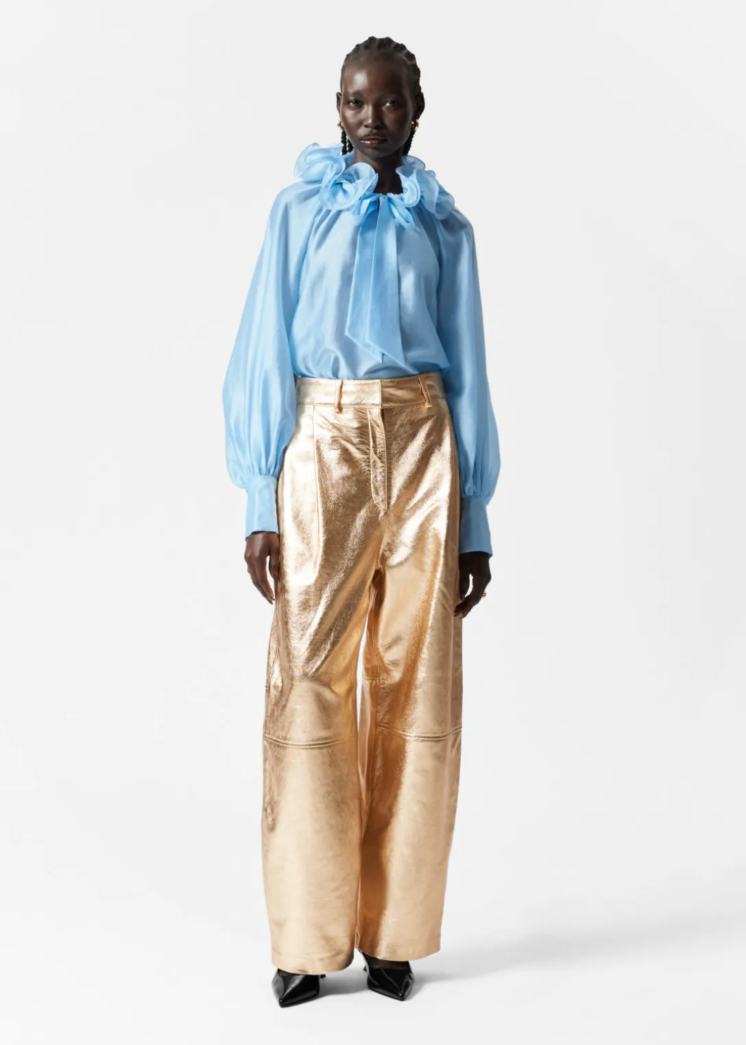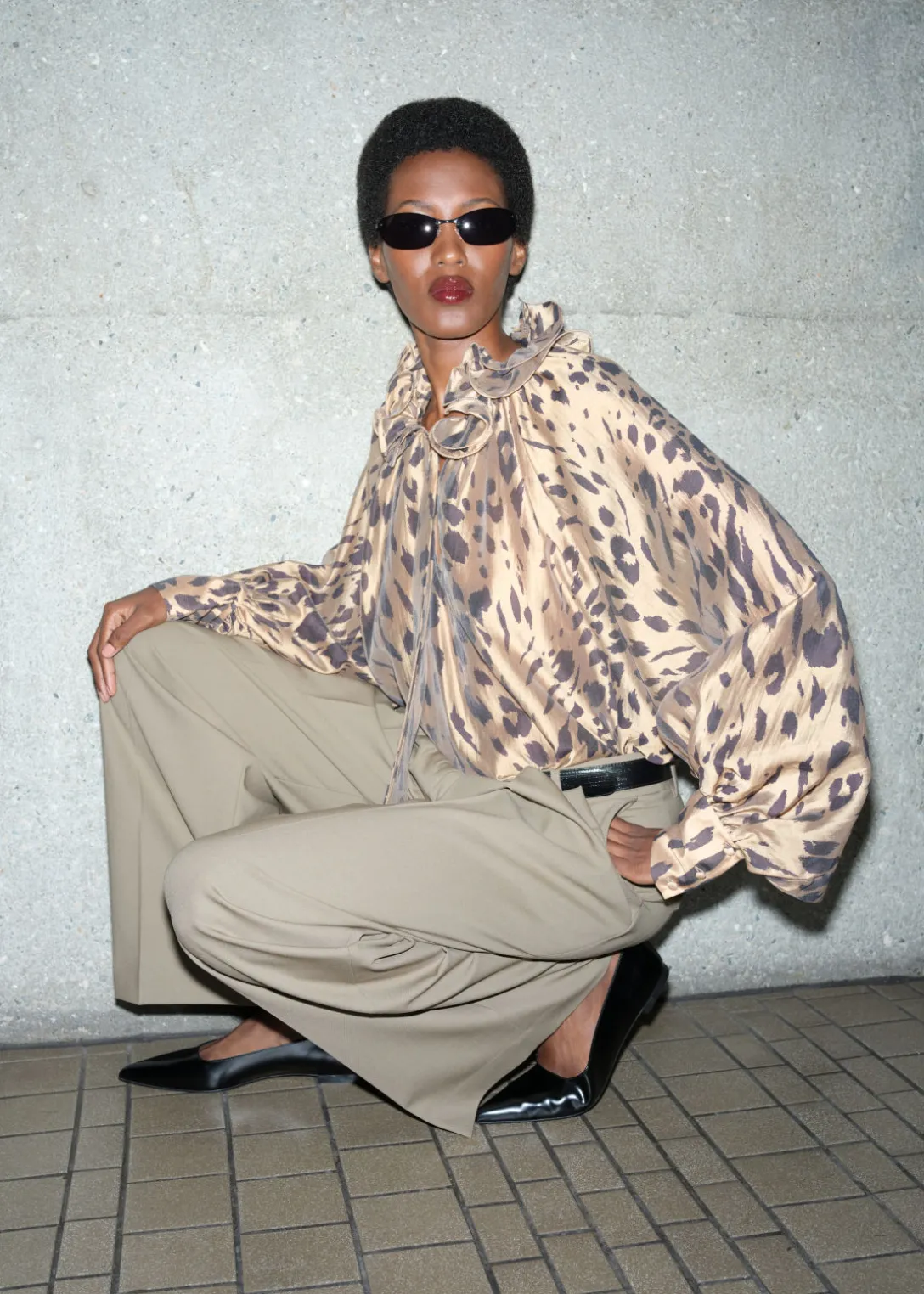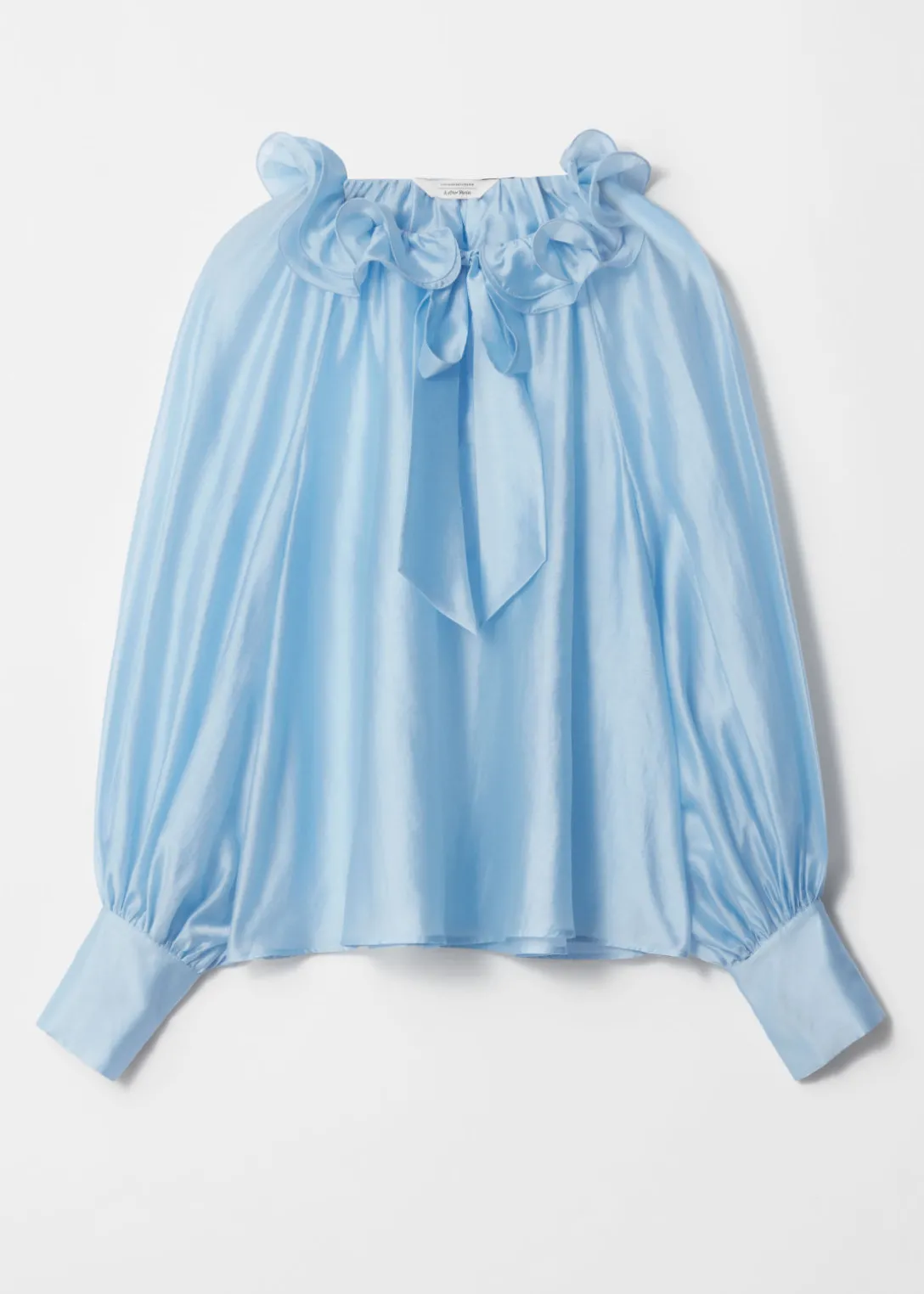 Blouse avec des manches amples et un col volanté avec un lien à nouer.