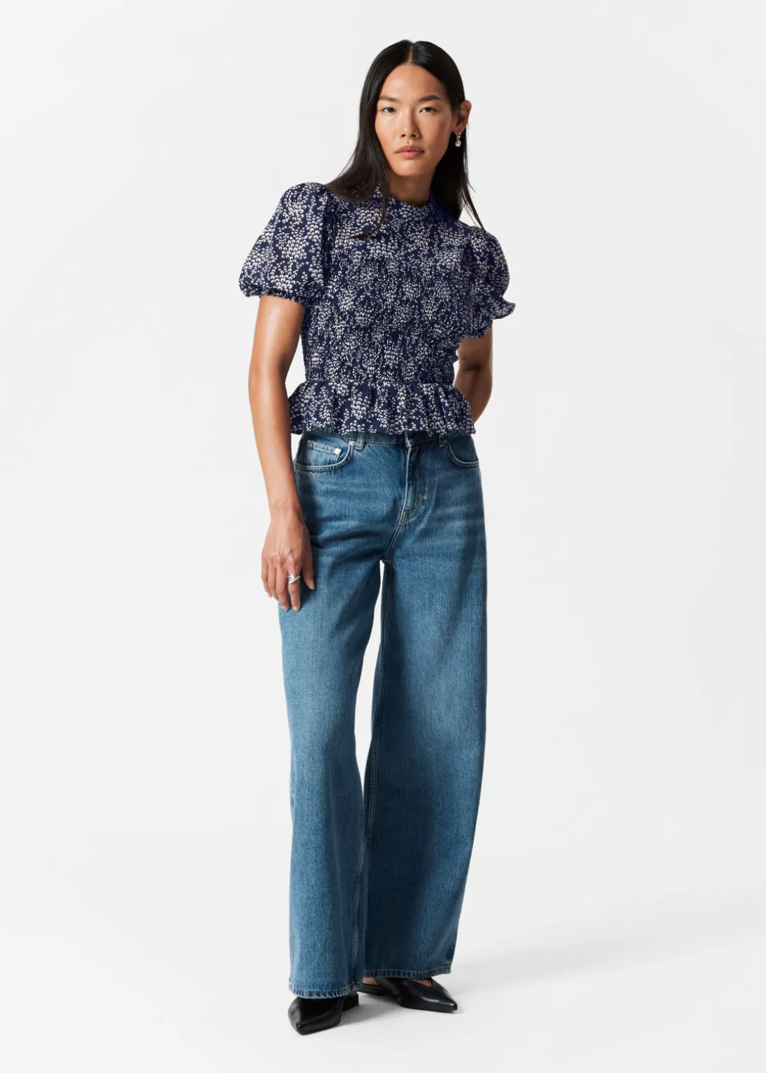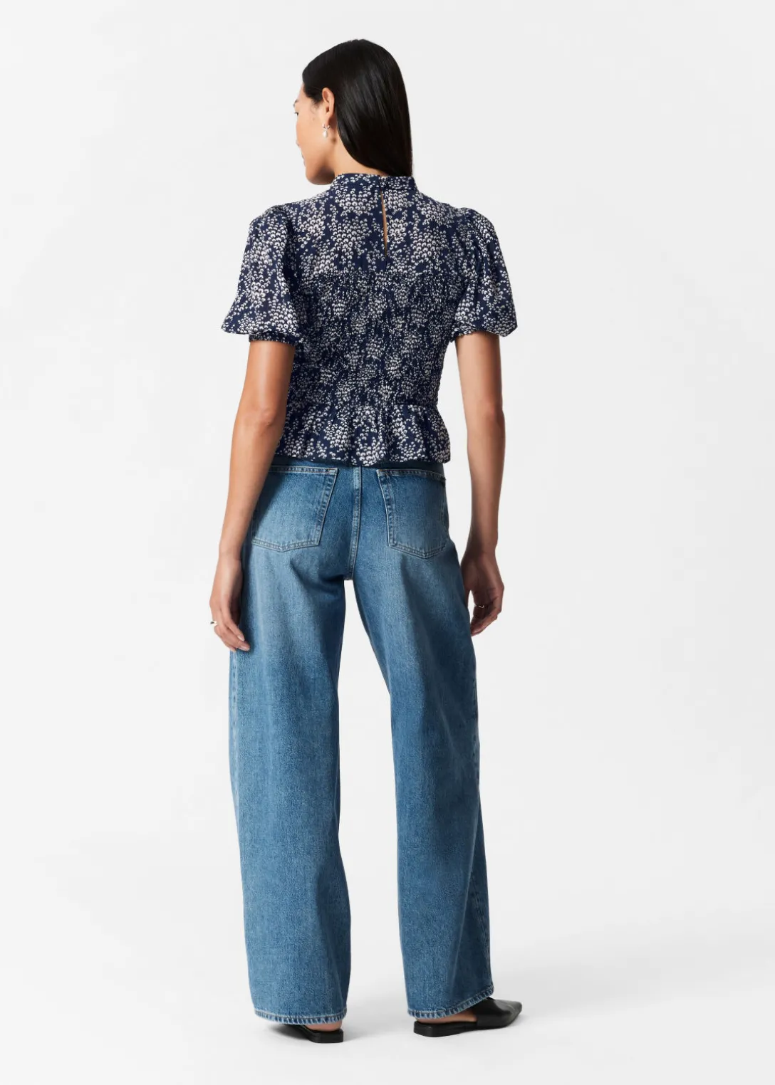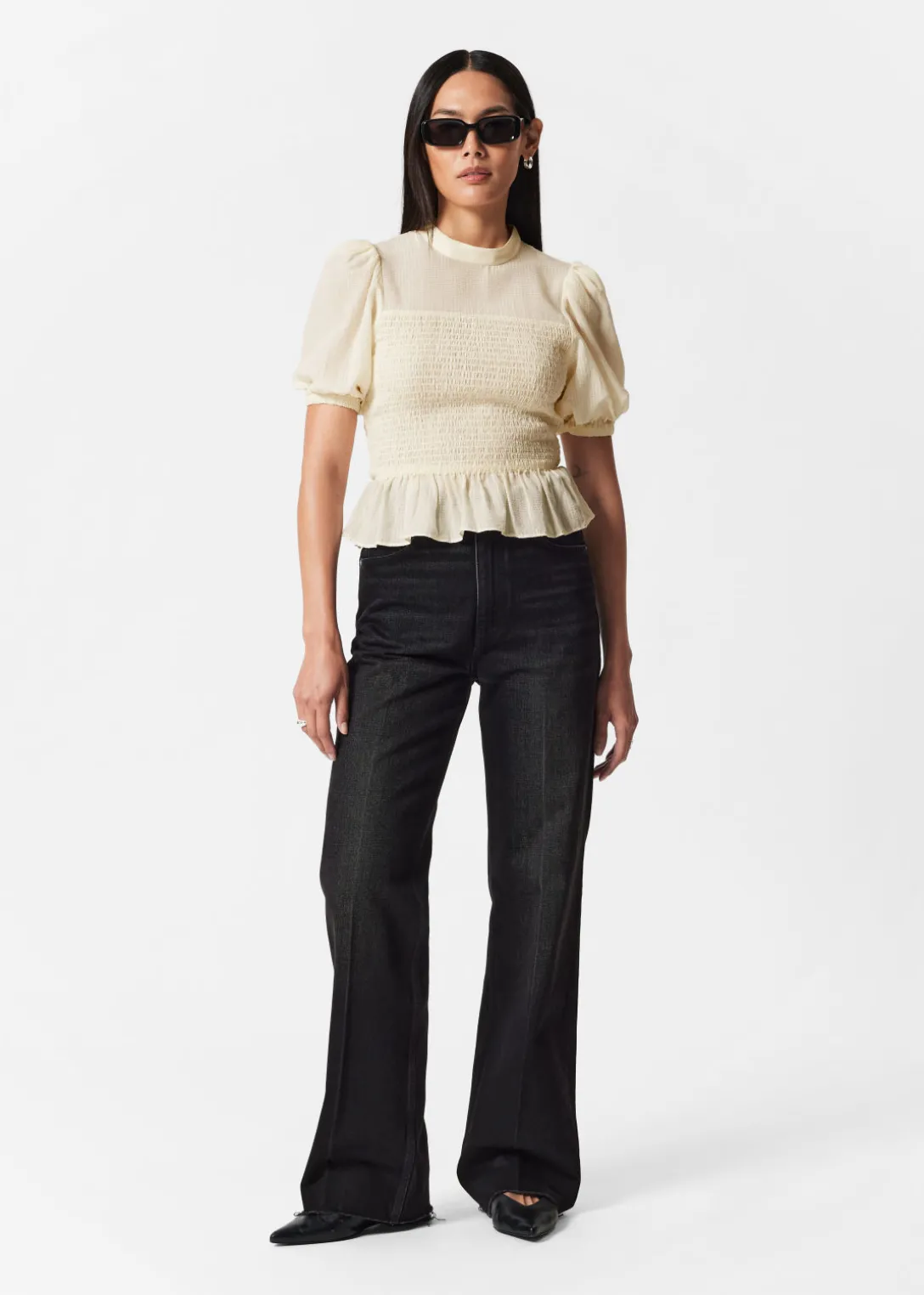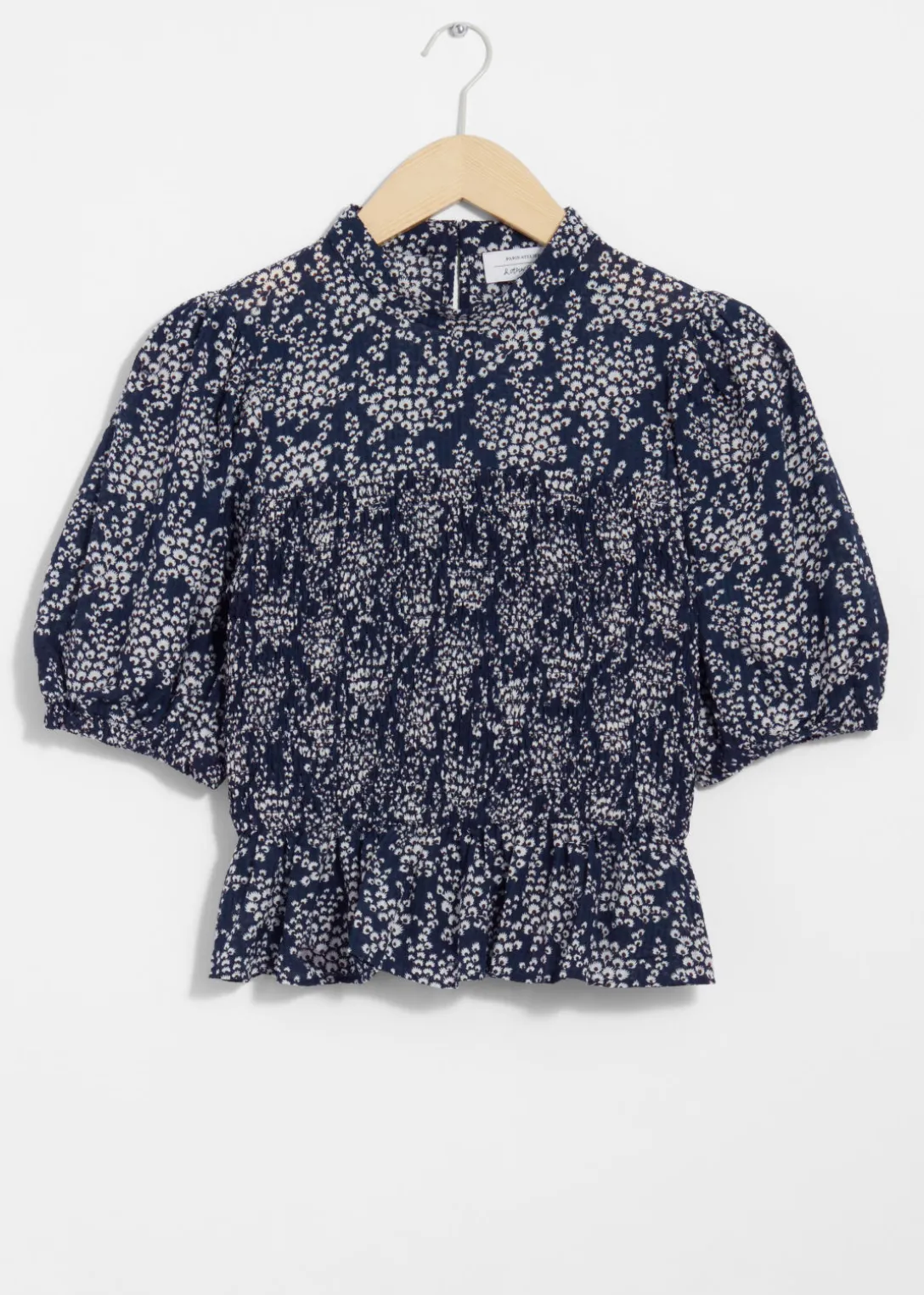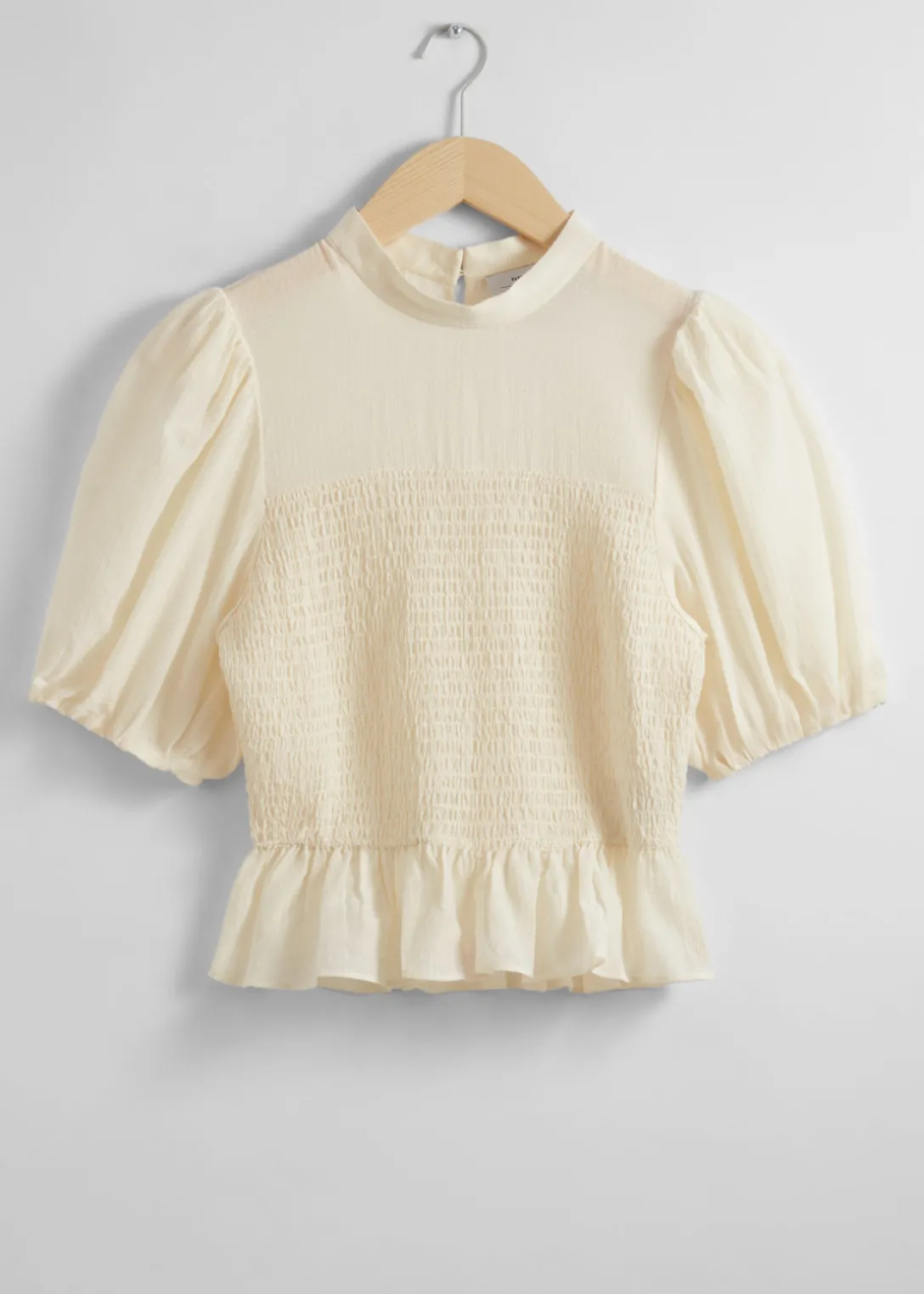 Blouse avec des manches ballon, un corsage à smocks et un ourlet à basque.