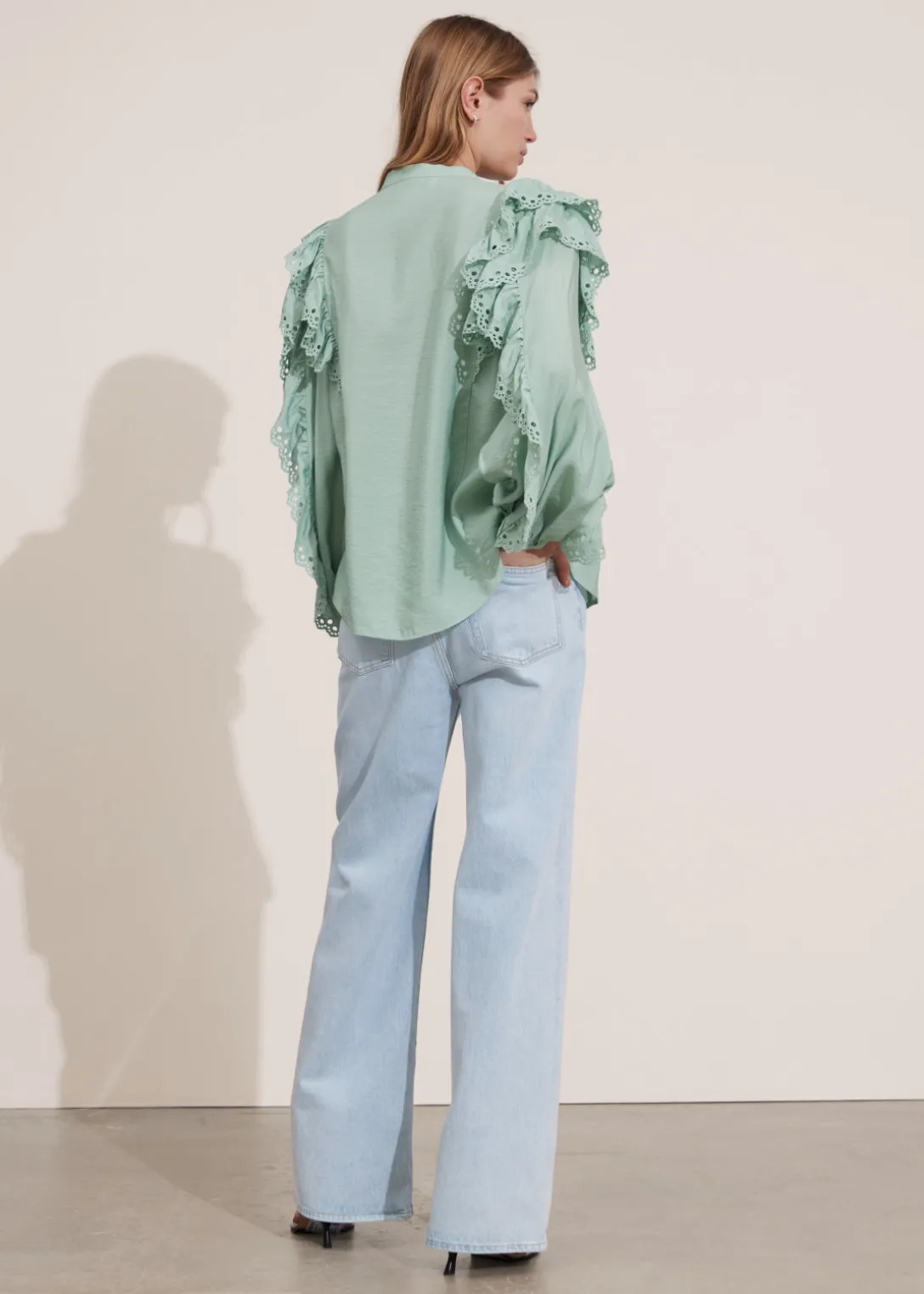 Blouse à manches ballon avec des volants festonnés et brodés au niveau des épaules et des manches.