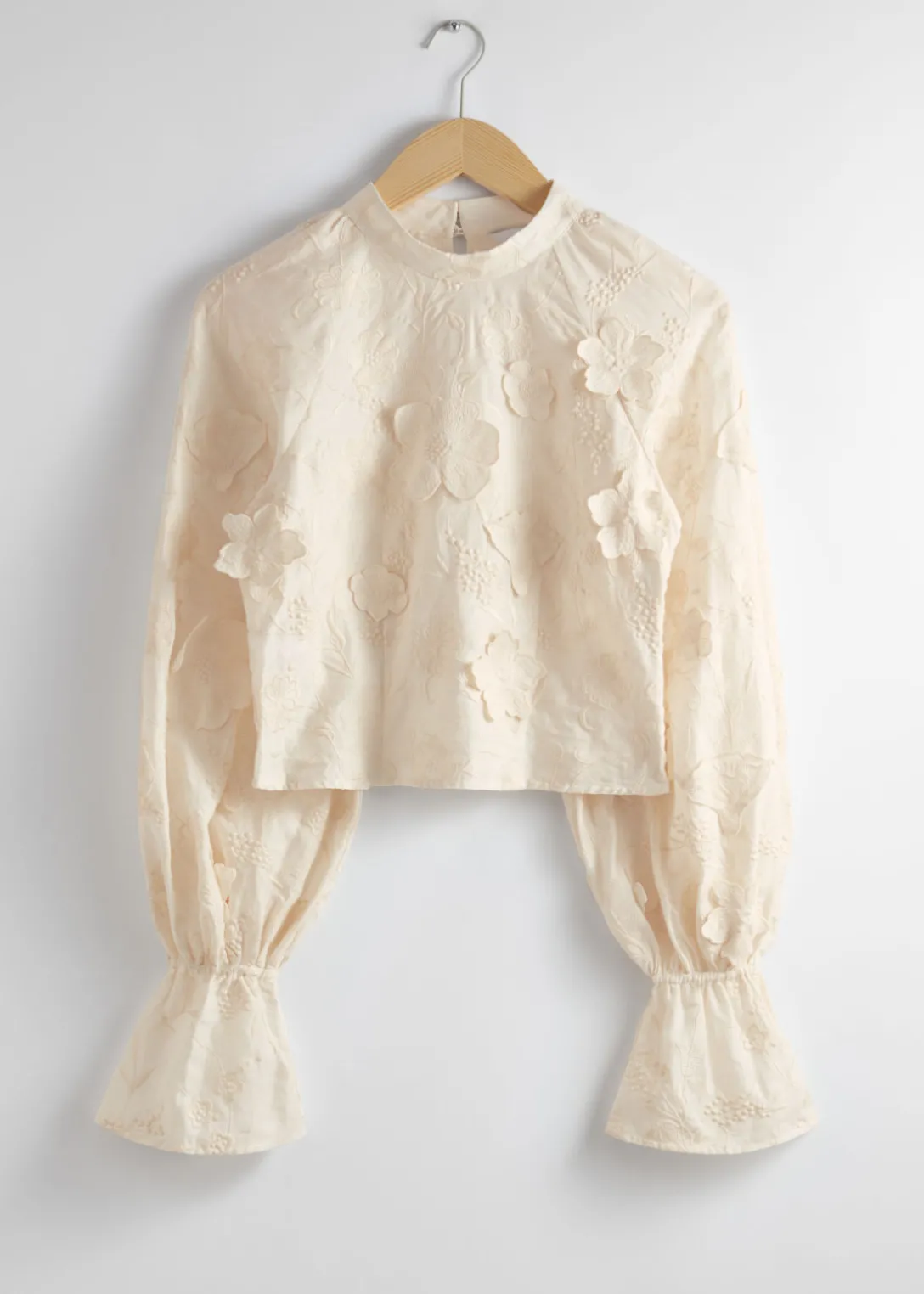 Blouse courte à col montant, avec des broderies complexes et des motifs floraux appliqués.