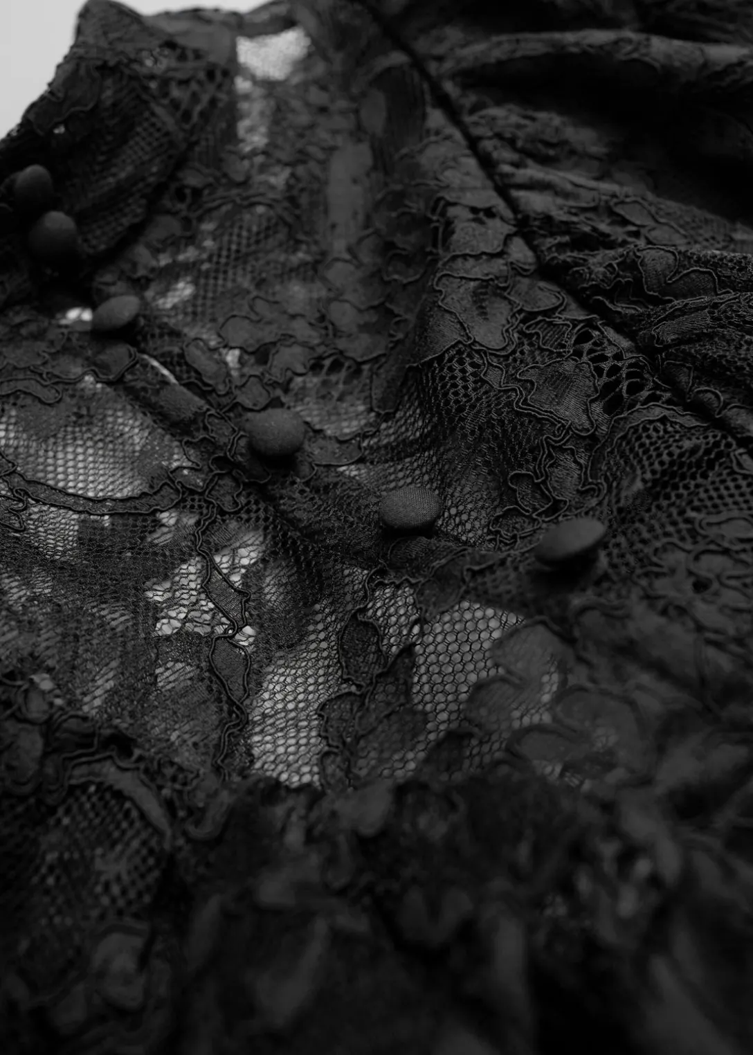 Blouse en dentelle avec des volants au niveau des épaules et des manches amples aux poignets volantés.