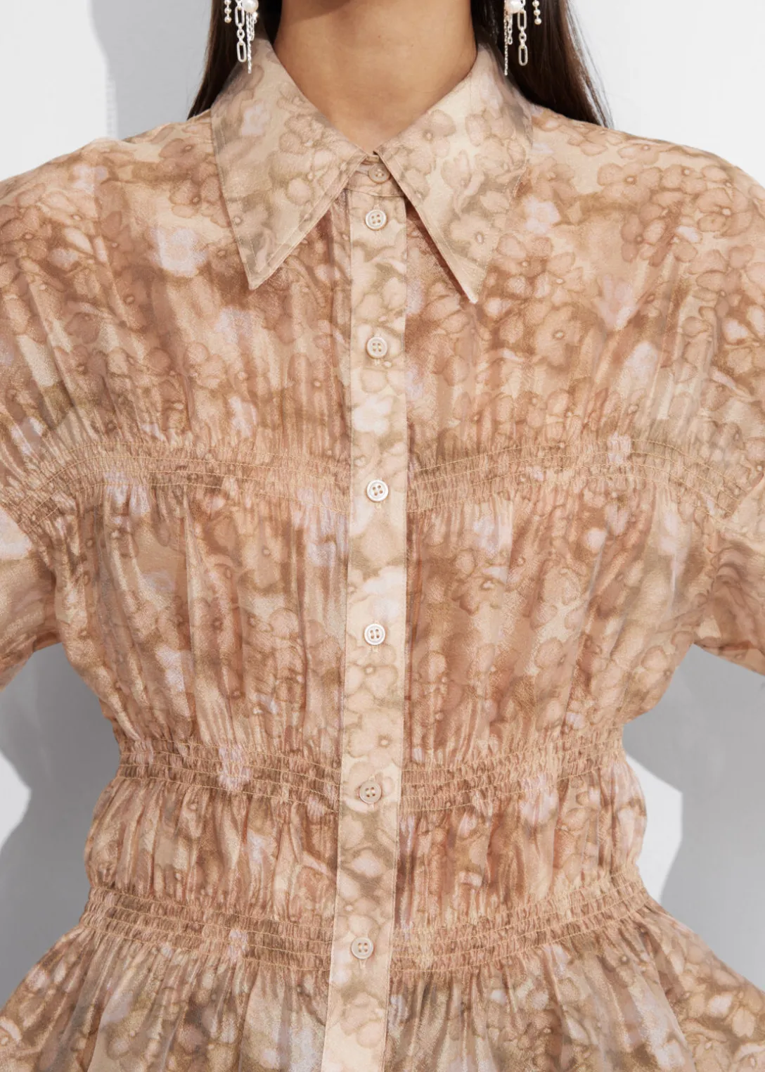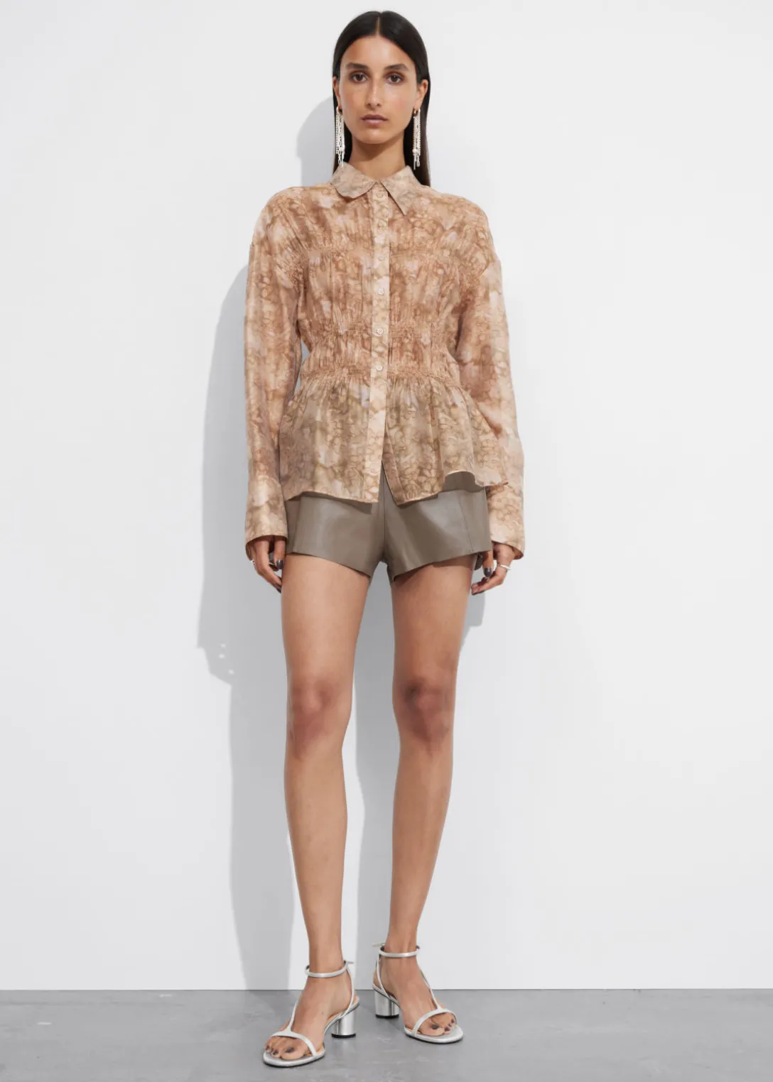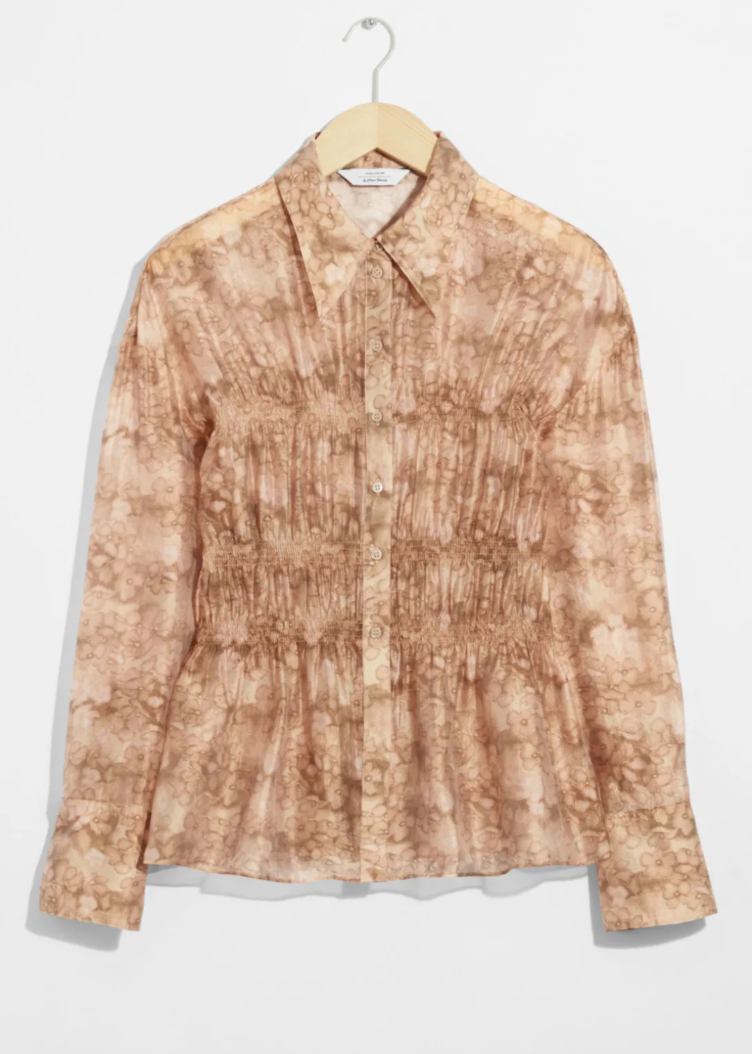 Blouse transparente avec manches longues, détails à smocks et ourlet à basque.