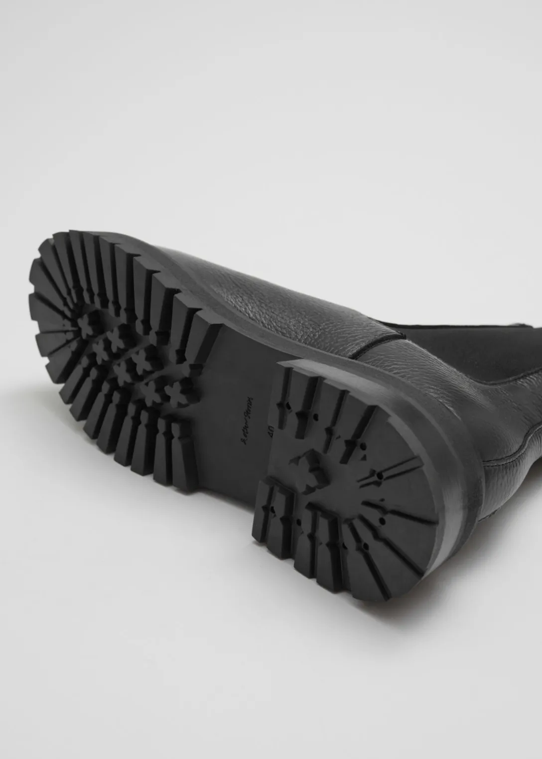 Bottines Chelsea en cuir avec semelle épaisse, doublure en polaire, panneaux latéraux élastiques et languette en cuir.