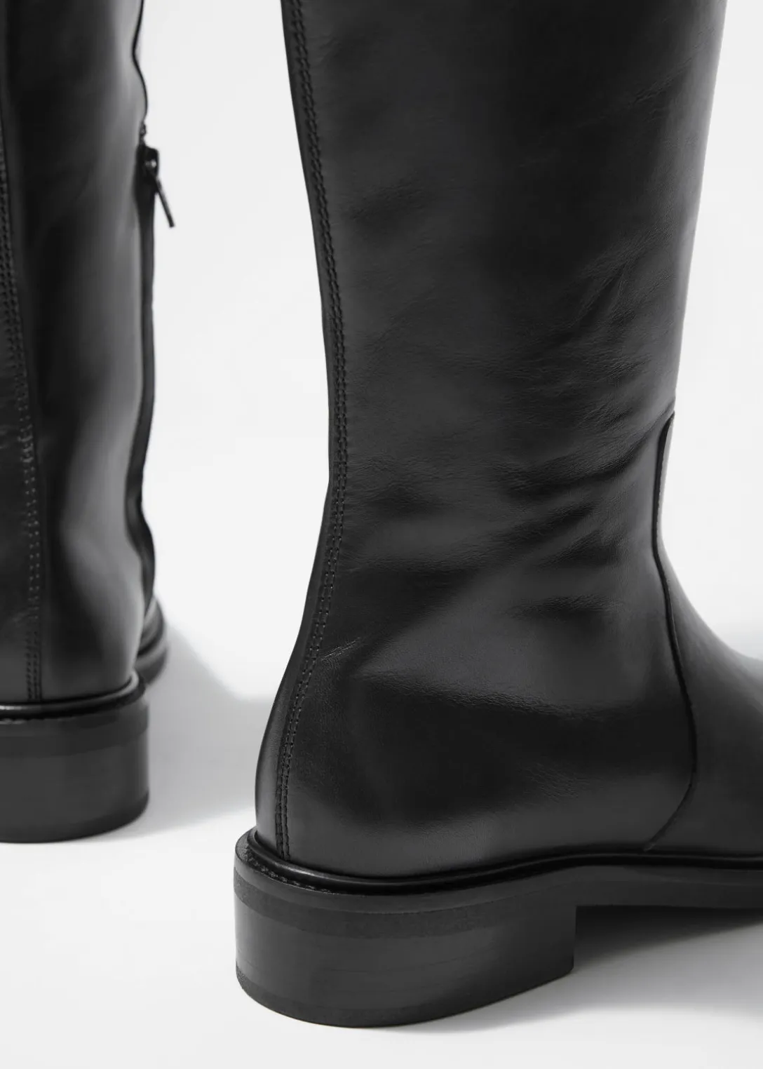 Ces bottes s’inspirent des modèles classiques d’équitation. Elles ont été fabriquées en cuir souple au Portugal. Le talon de 30 mm offre une élévation subtile tout en étant suffisamment confortable pour les porter toute la journée. Elles reposent sur des semelles en caoutchouc et sont dotées d’une fermeture éclair dissimulée.