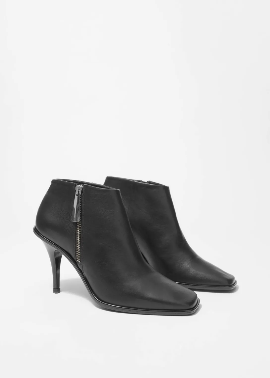 Ces bottines sont conçues pour arriver juste au niveau des chevilles. Confectionnées au Portugal à partir de cuir souple, elles présentent des talons fuselés, des bouts légèrement carrés et des fermetures zippées argentées sur le côté.