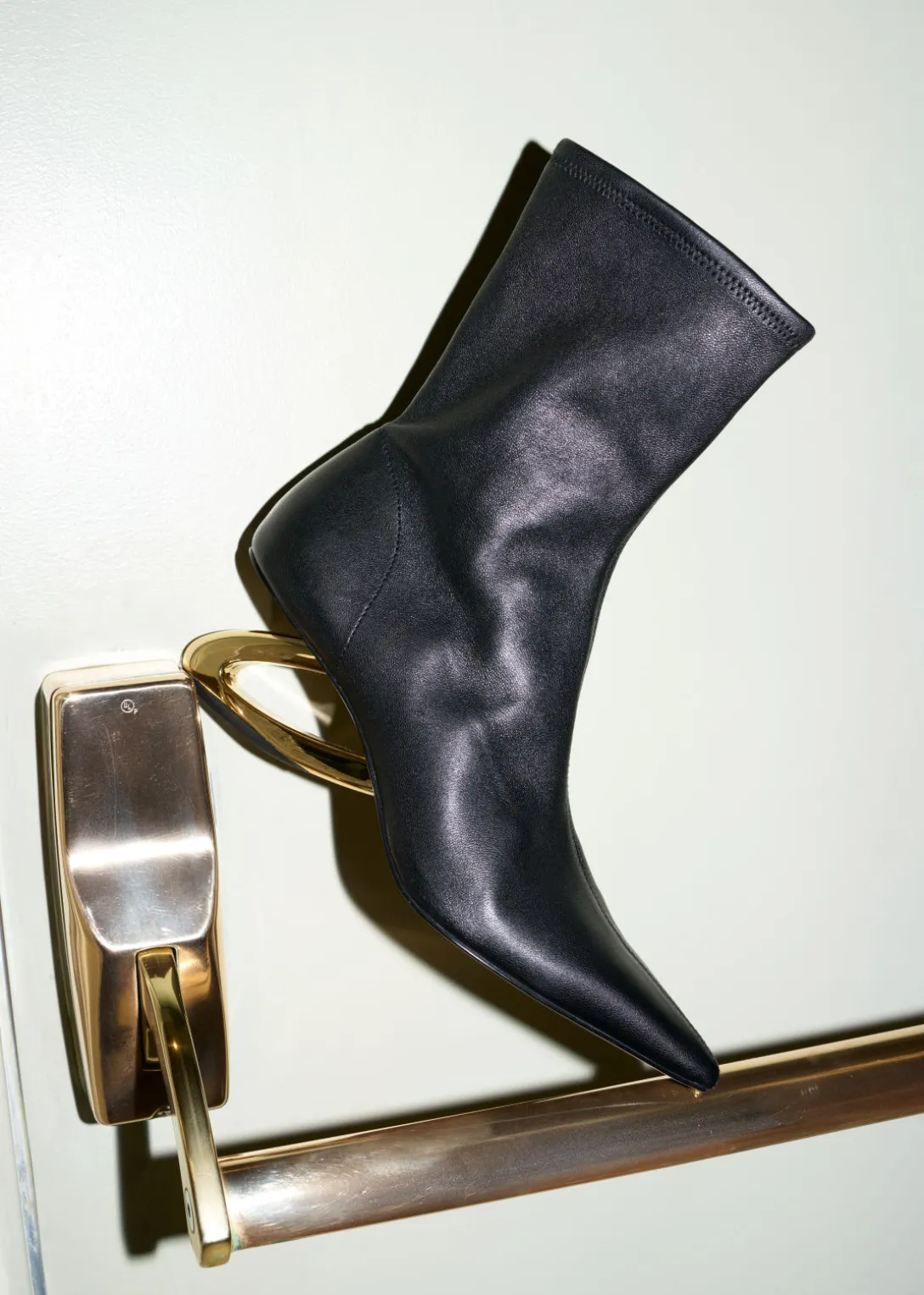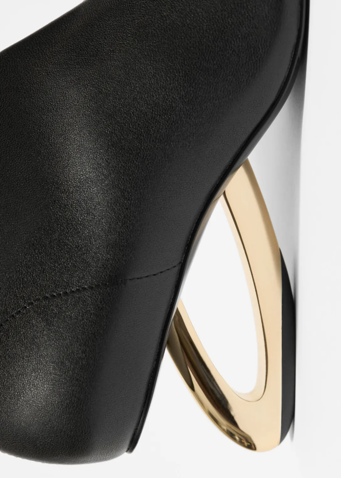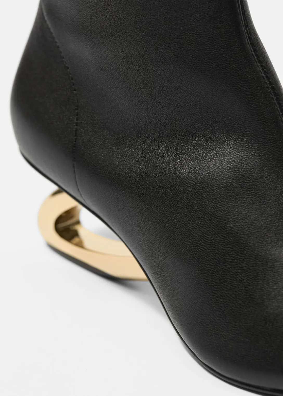 Ces bottines rehausseront n’importe quelle tenue. Confectionnées en cuir nappa extensible et souple, elles sont ornées de talons dorés sculpturaux.