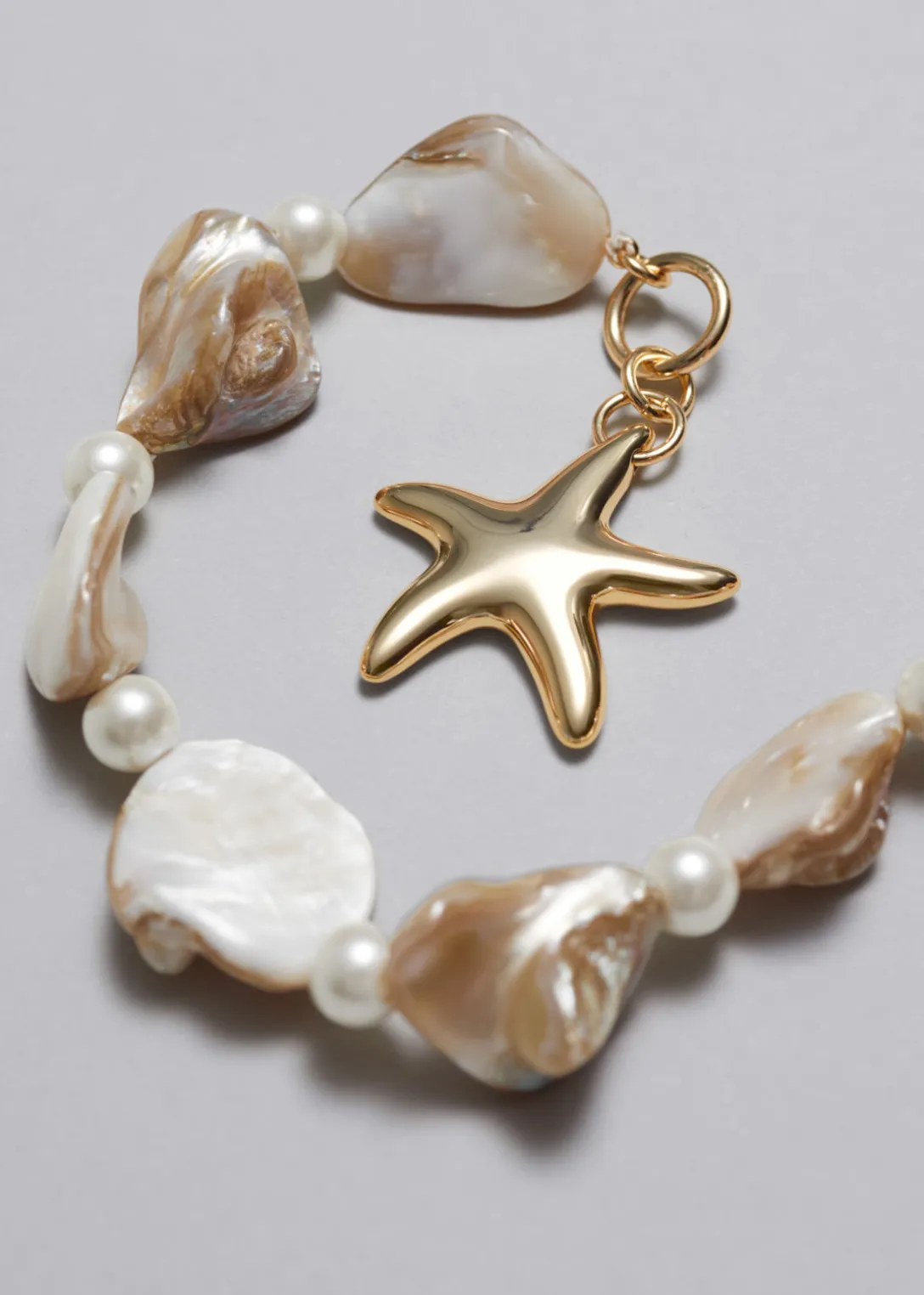 Ce bracelet présente tout un éventail de coquillages brillants et de perles synthétiques, créant une allure espiègle pour la plage. Doté d’une chaîne d’extension ornée d’un pendentif doré en forme d’étoile de mer.