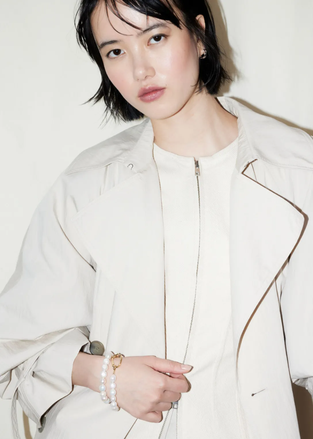 Bracelet orné de perles d’eau douce brillantes de différentes tailles et formes organiques. Doté d’une fermeture à agrafe dorée.