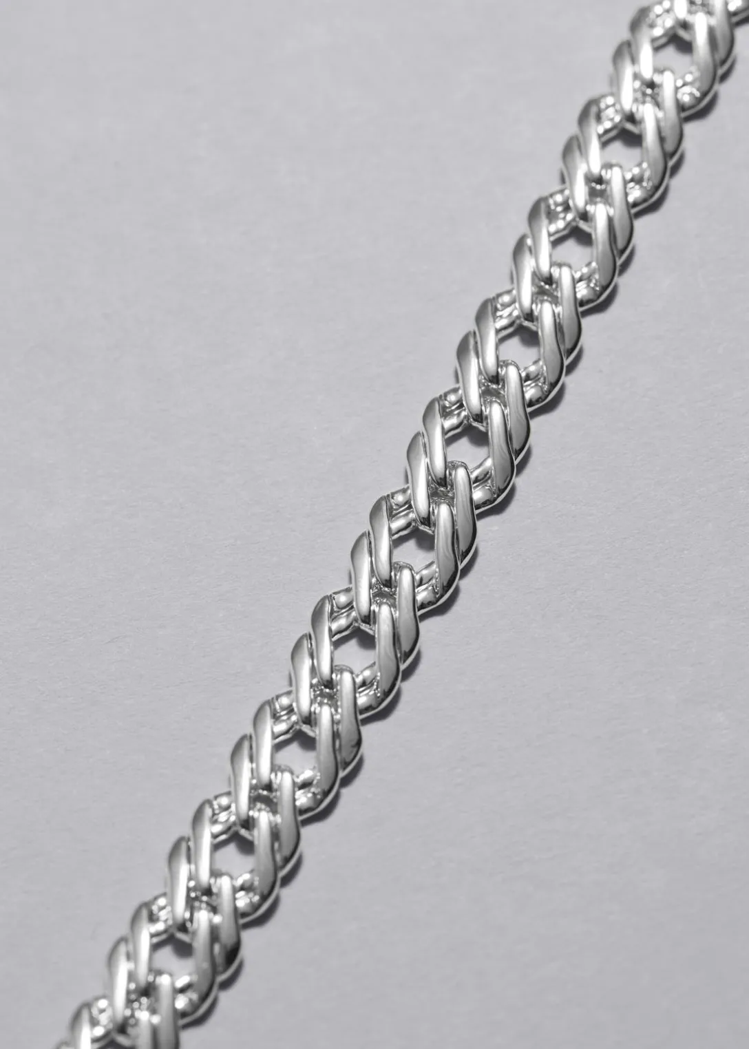 Bracelet épais en chaîne, confectionné en laiton poli. Doté d’un fermoir à mousqueton et d’une chaîne d’extension.