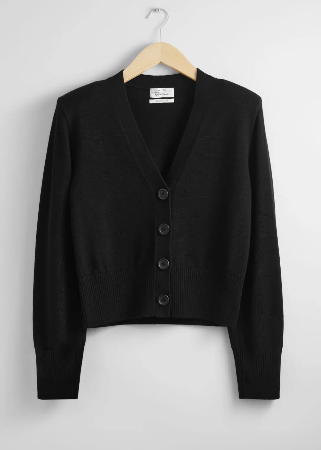 Cardigan en laine mérinos, avec un col en V et des épaulettes.