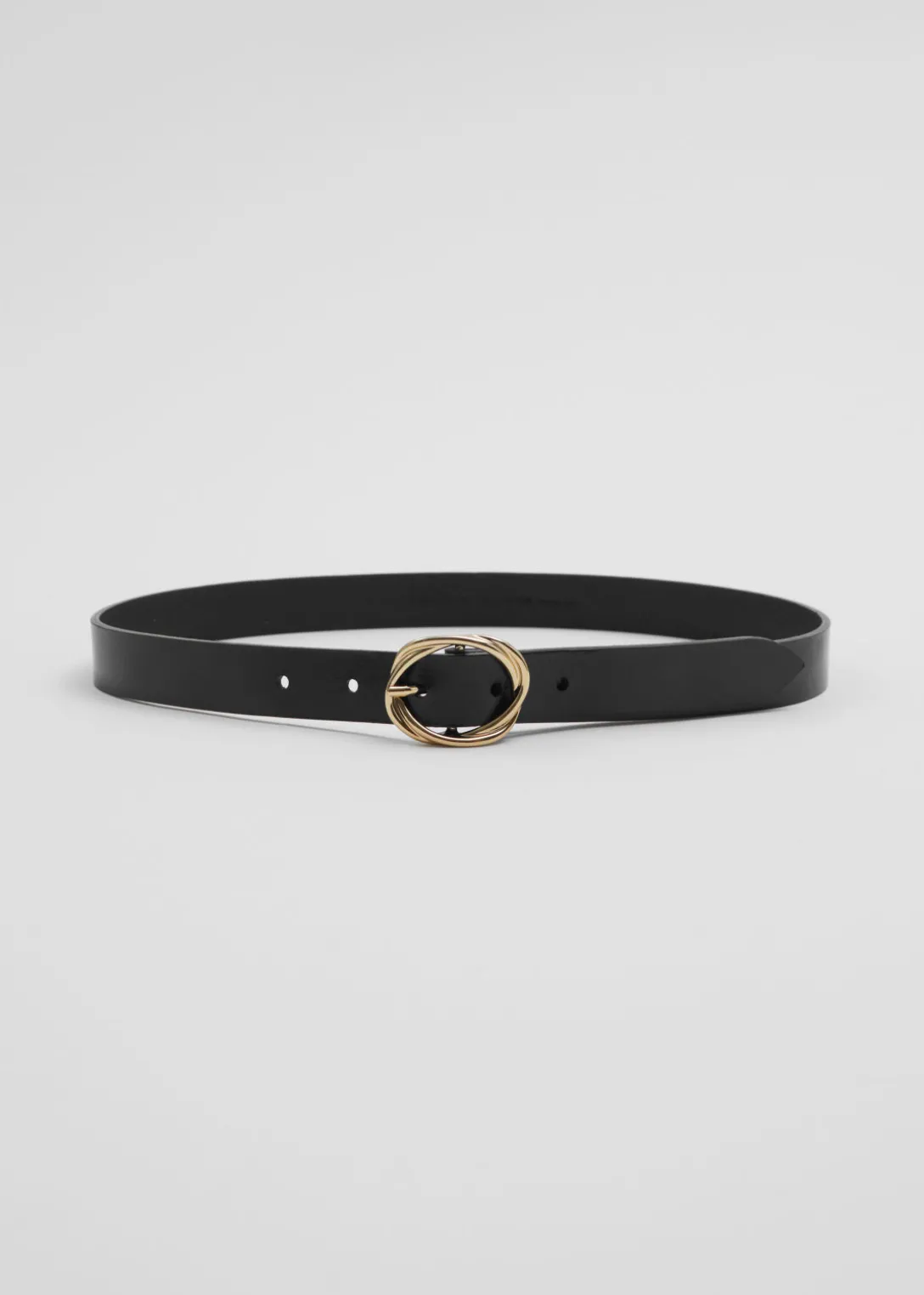 Conçue pour être portée sur la taille, cette ceinture est confectionnée en cuir lisse et ornée d’une boucle dorée à effet noué.
