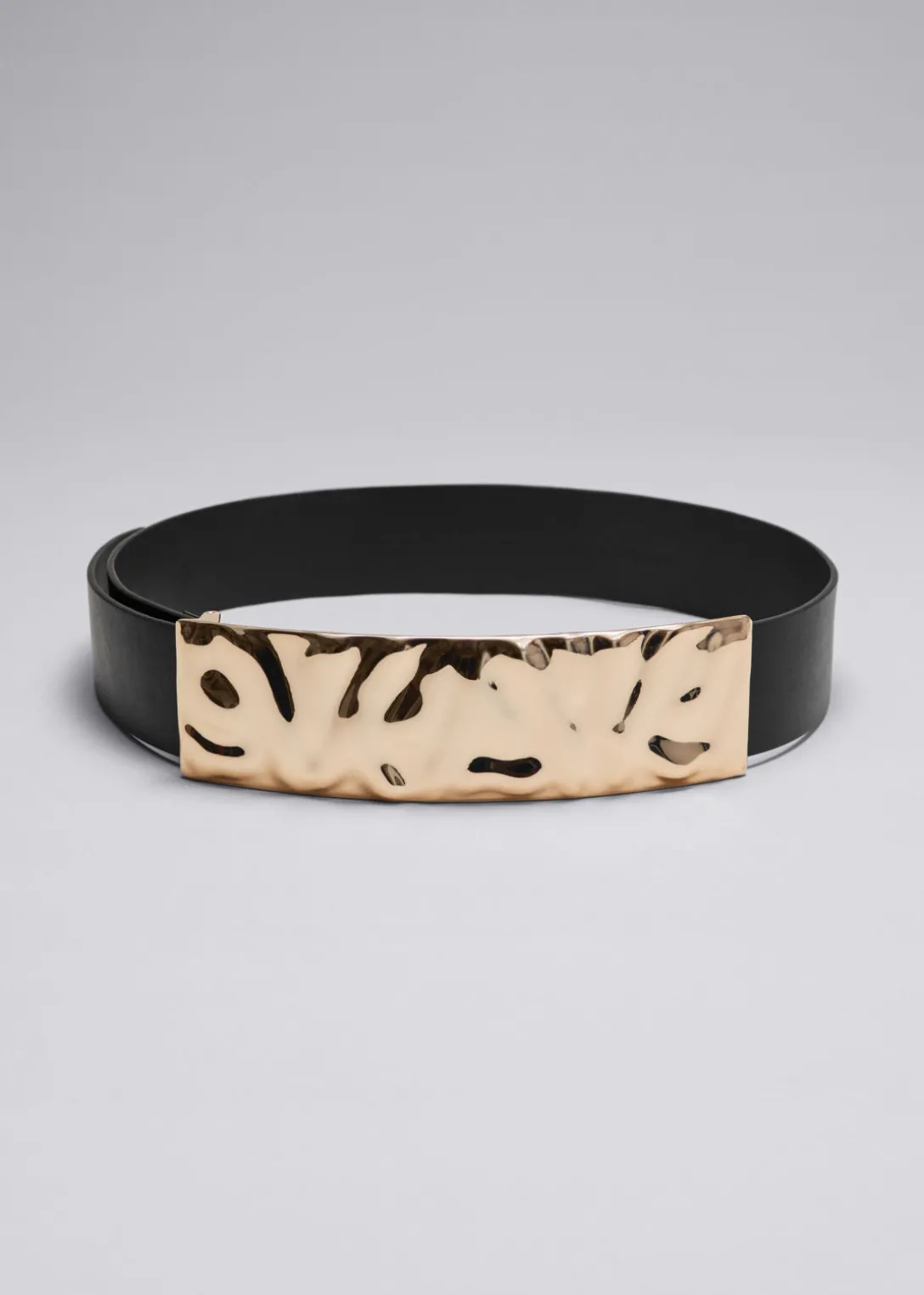 Cette ceinture en cuir souple présente une boucle oversize dorée de style sculptural. Elle est dotée d’une fermeture à bouton pression, élastique et ajustable.