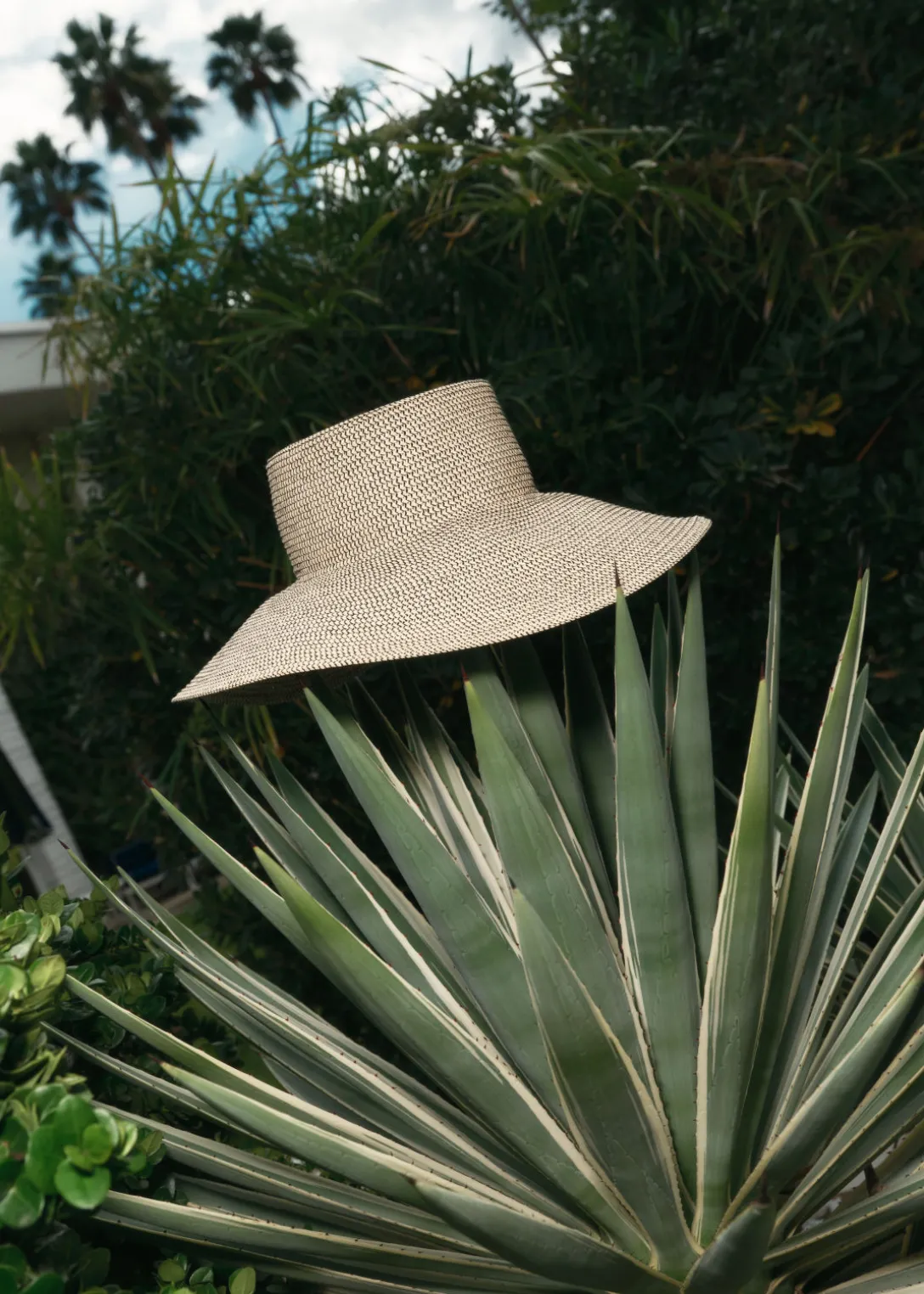 Confectionné en paille de papier bicolore, ce chapeau de soleil léger possède un bord oversize légèrement tombant pour couvrir le visage et le cou.