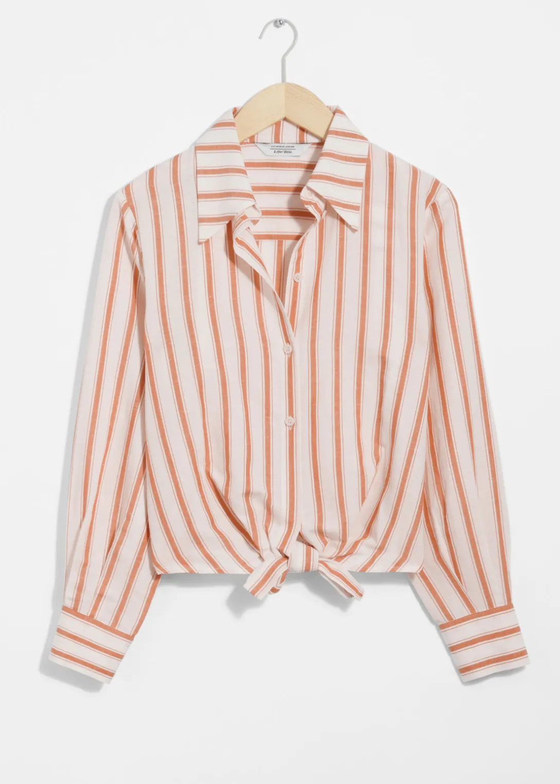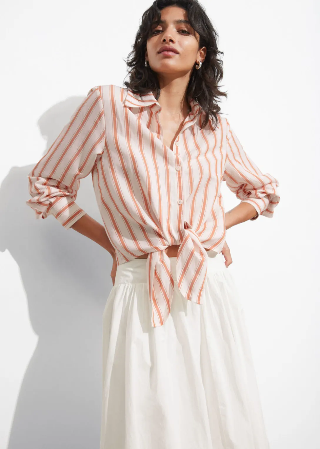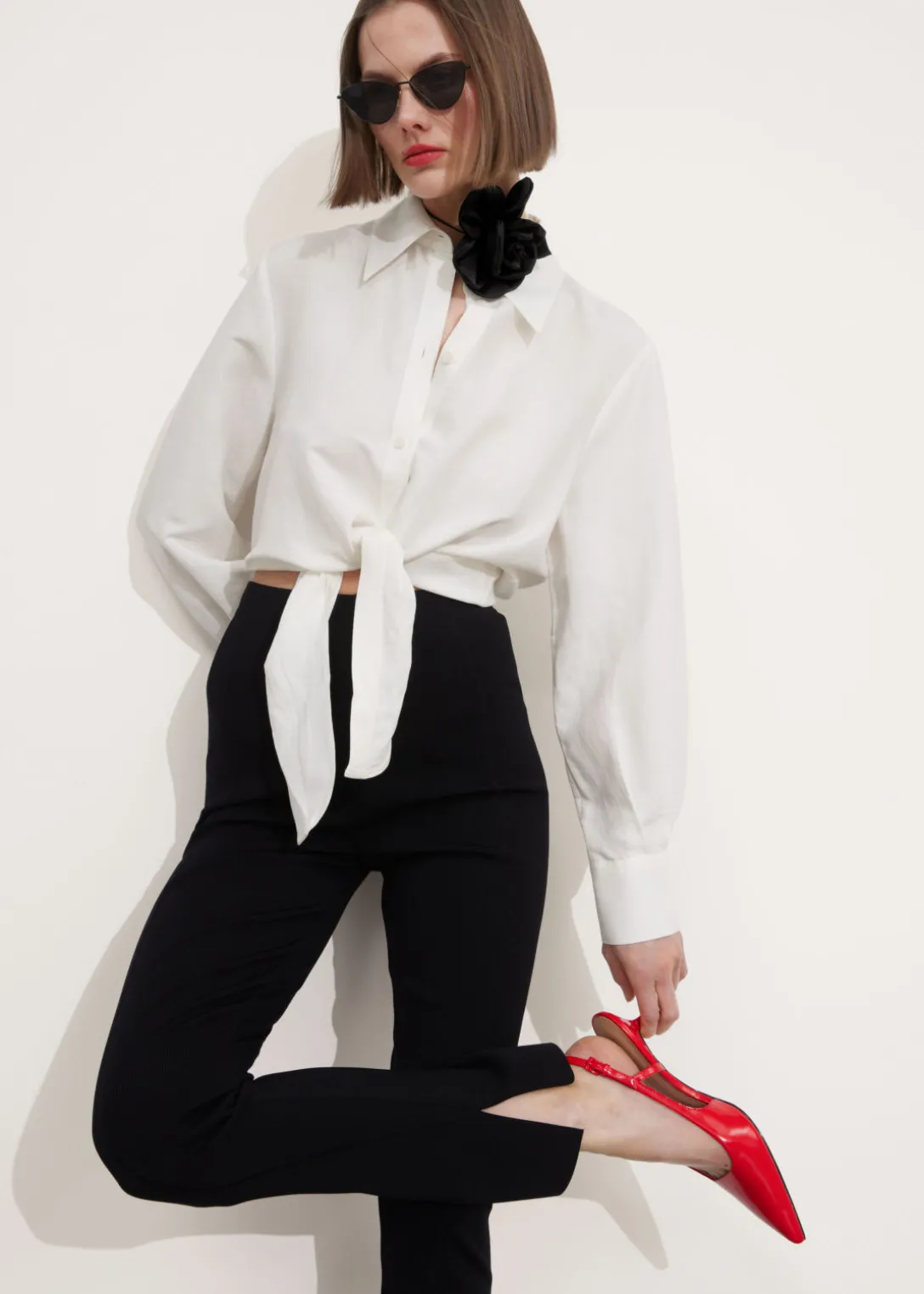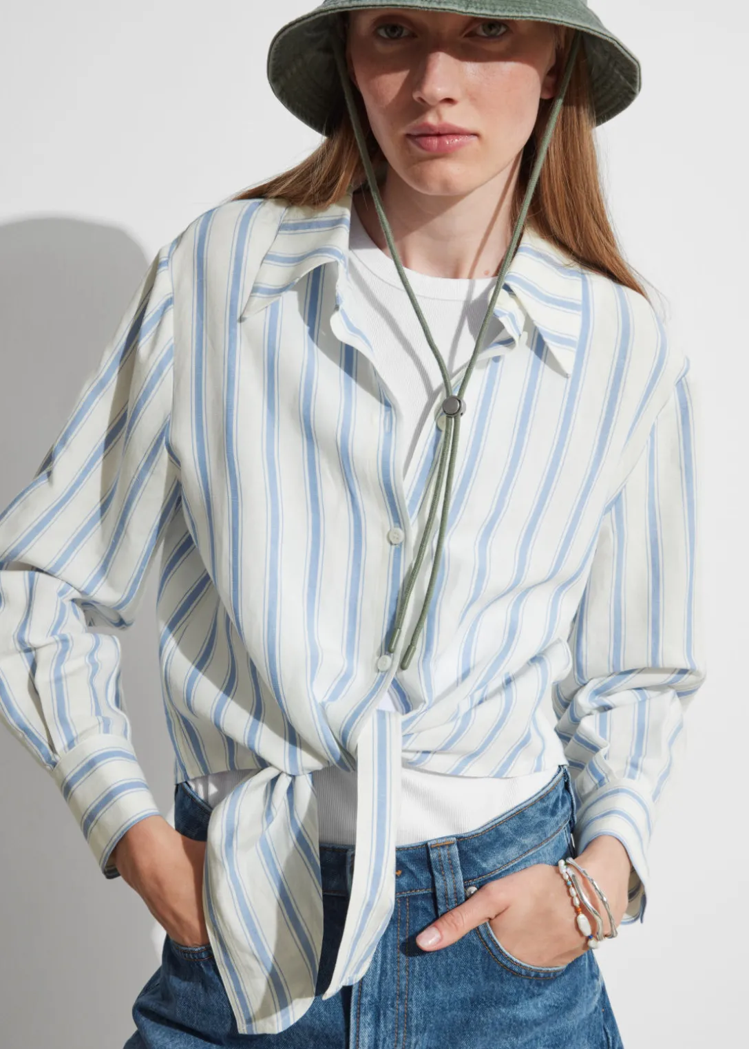 Chemise à manches longues, avec des liens ton sur ton à nouer soigneusement au niveau de l’ourlet.