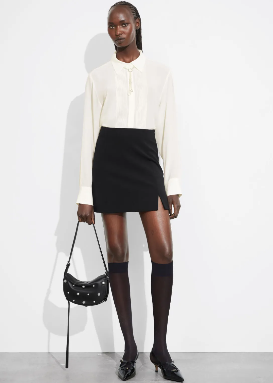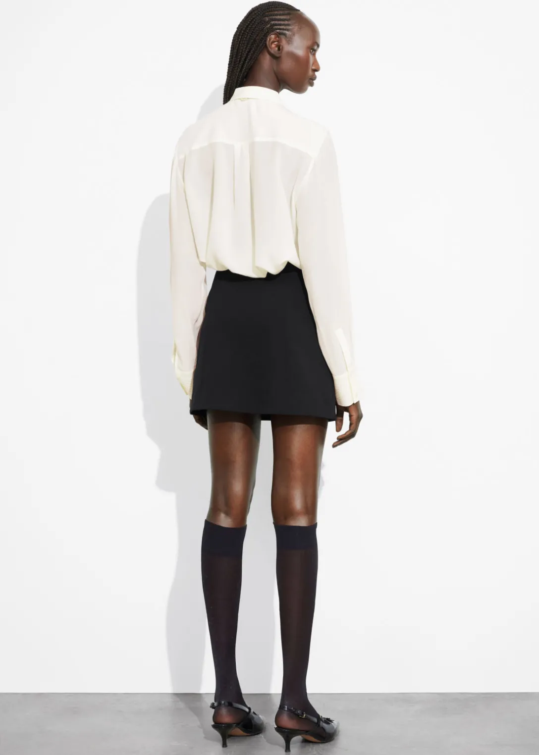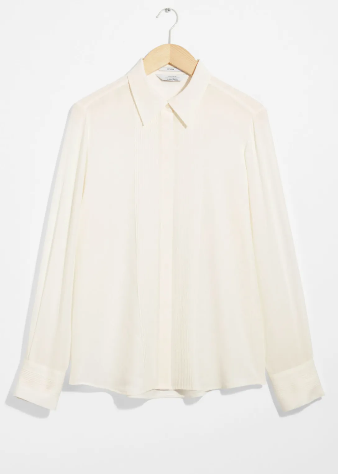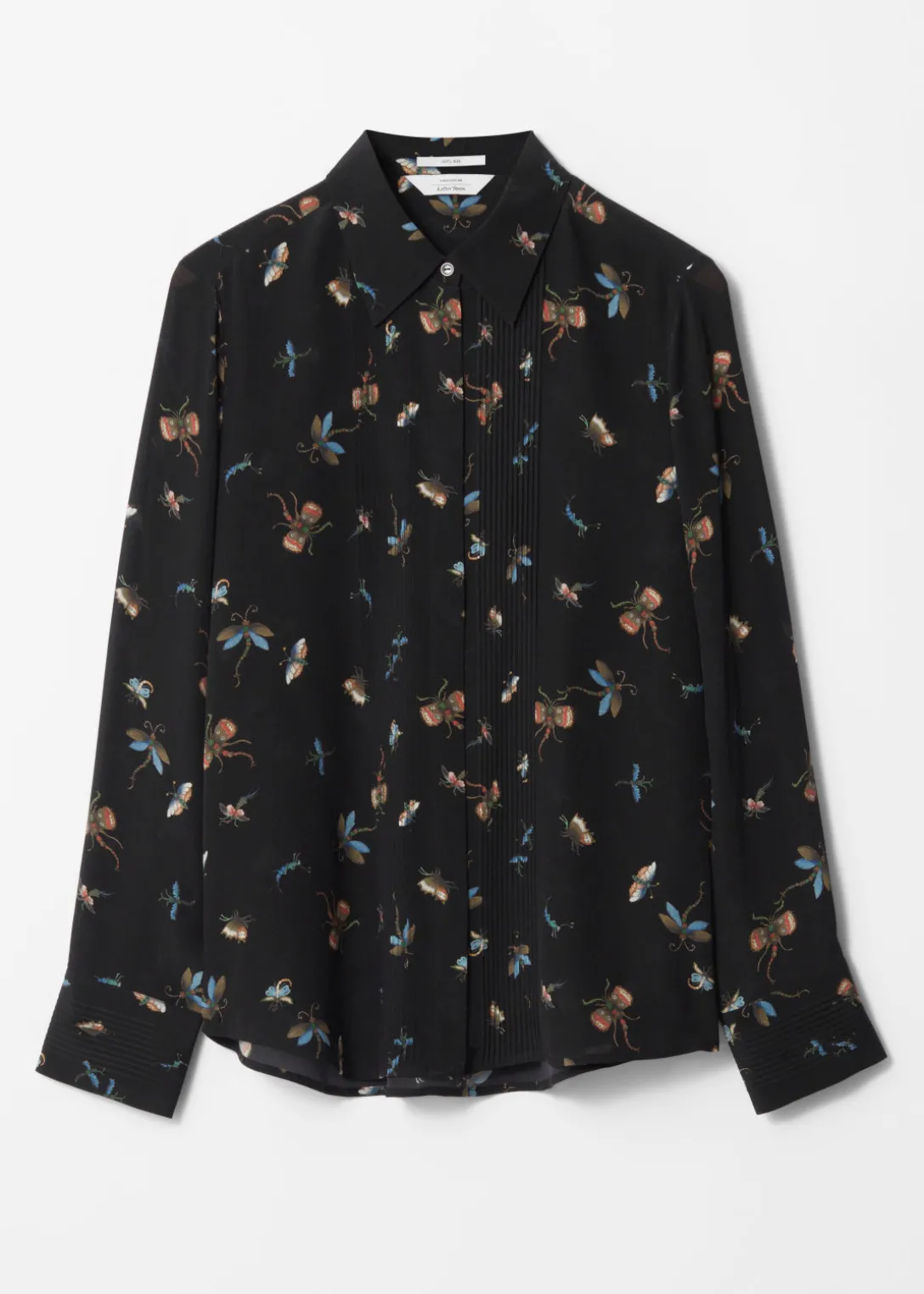 Chemise en soie à manches longues. Dotée de pinces au niveau de la patte et des poignets.