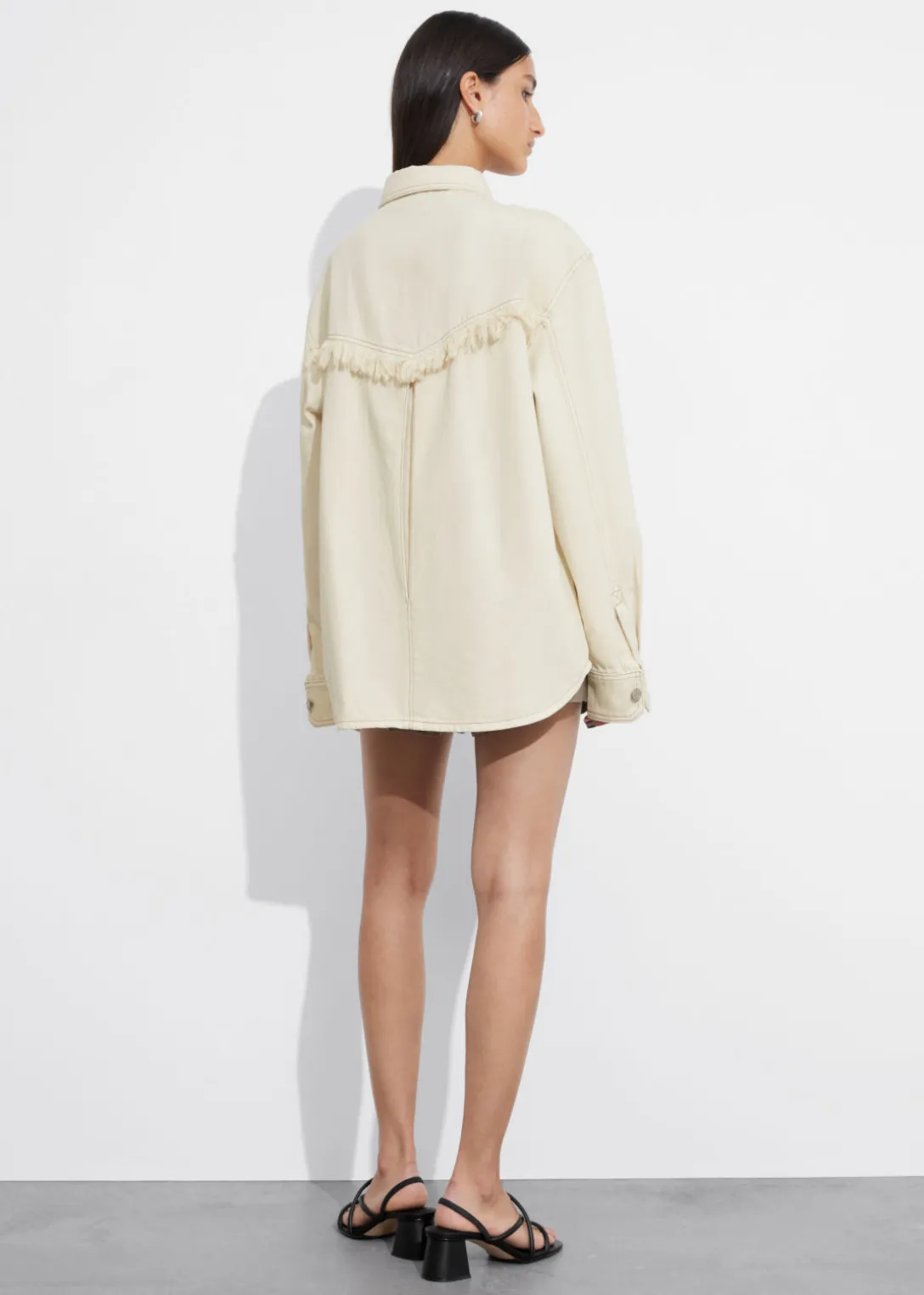 Chemise en denim avec des boutons de jean. Dotée de franges à l’avant et à l’arrière.