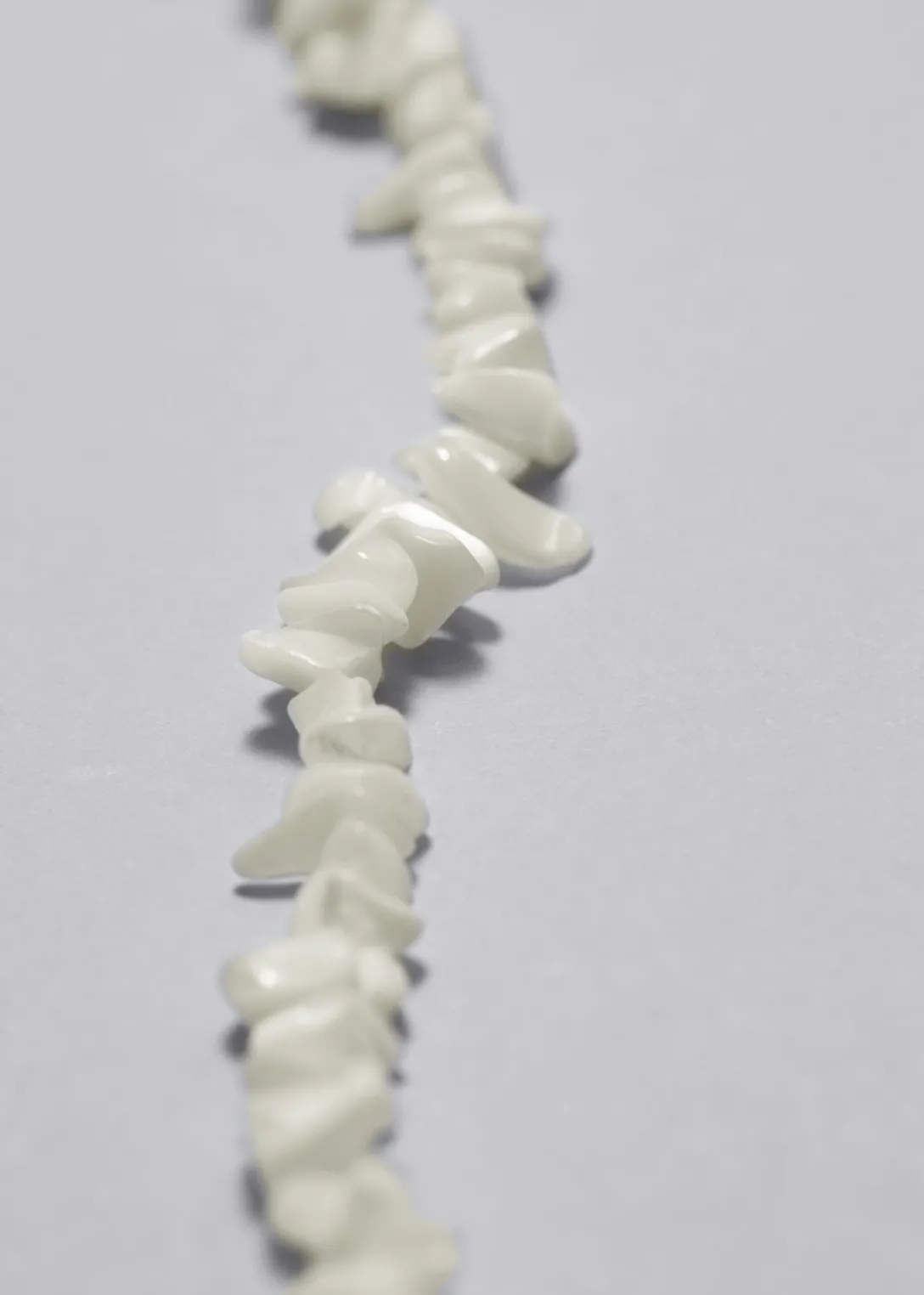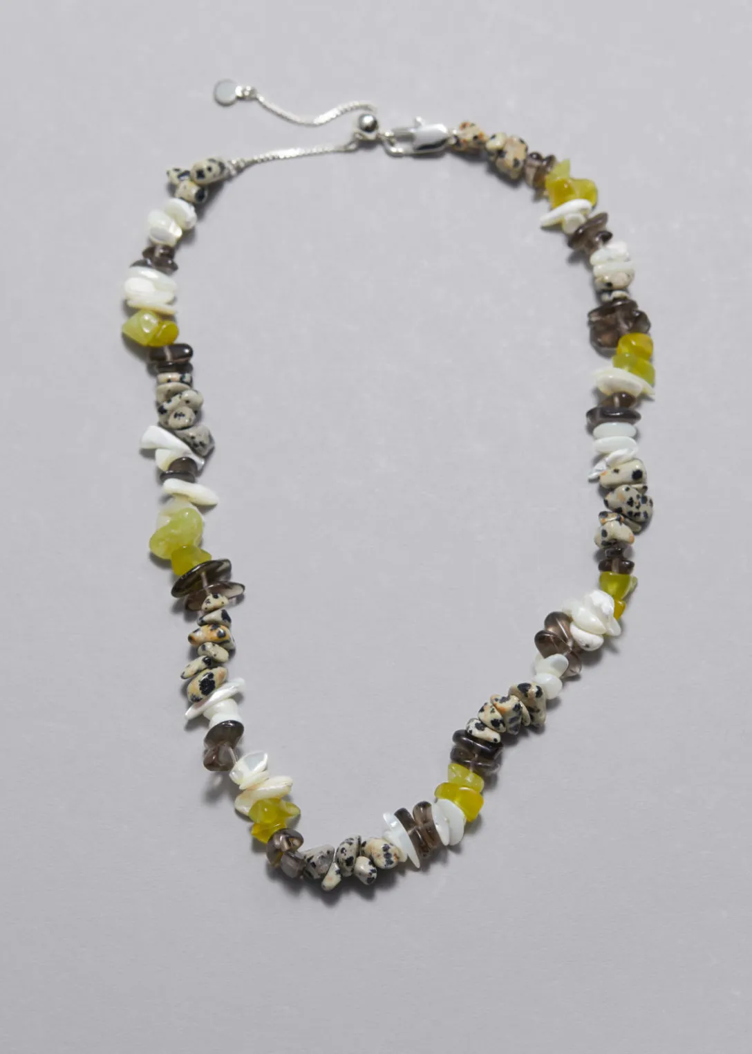 Ce collier permet de donner facilement un coup d’éclat à un look neutre. Orné de perles de pierre et de coquillages lumineux, il possède un fermoir à mousqueton et une chaîne d’extension.