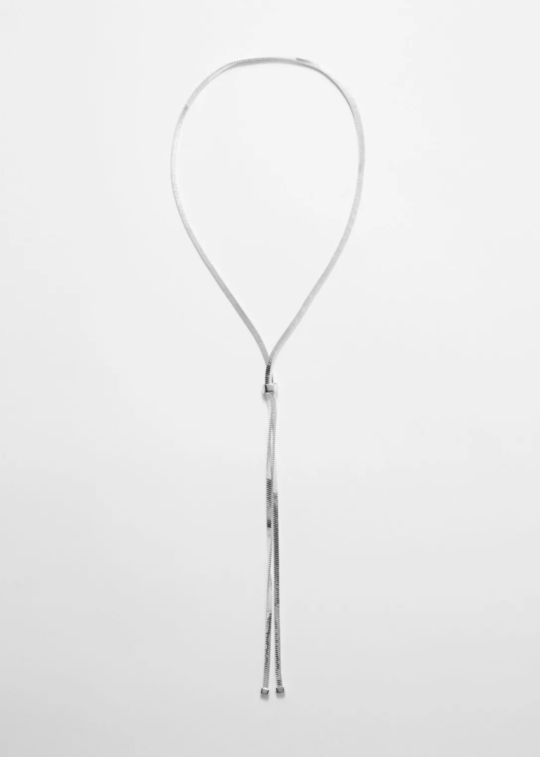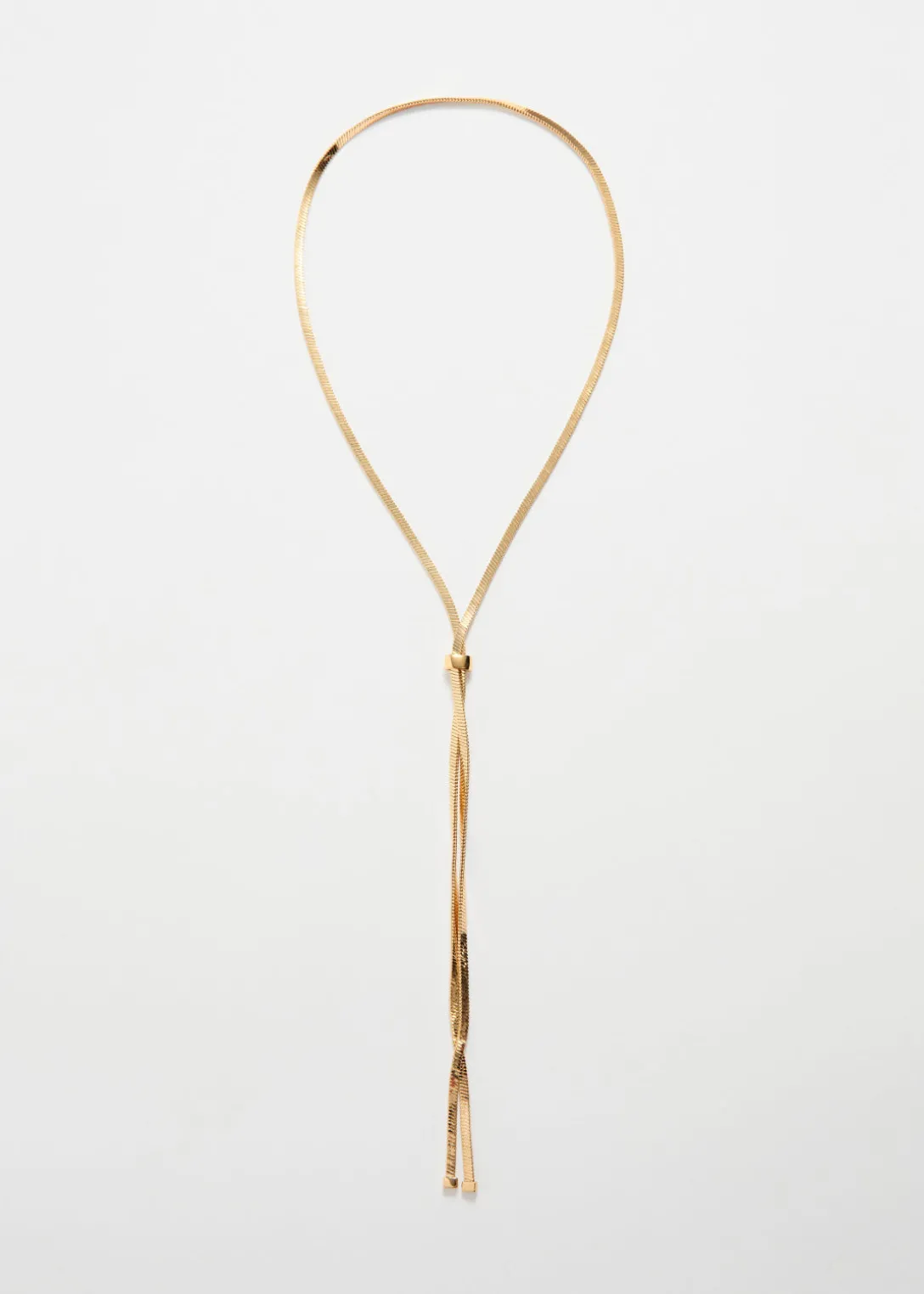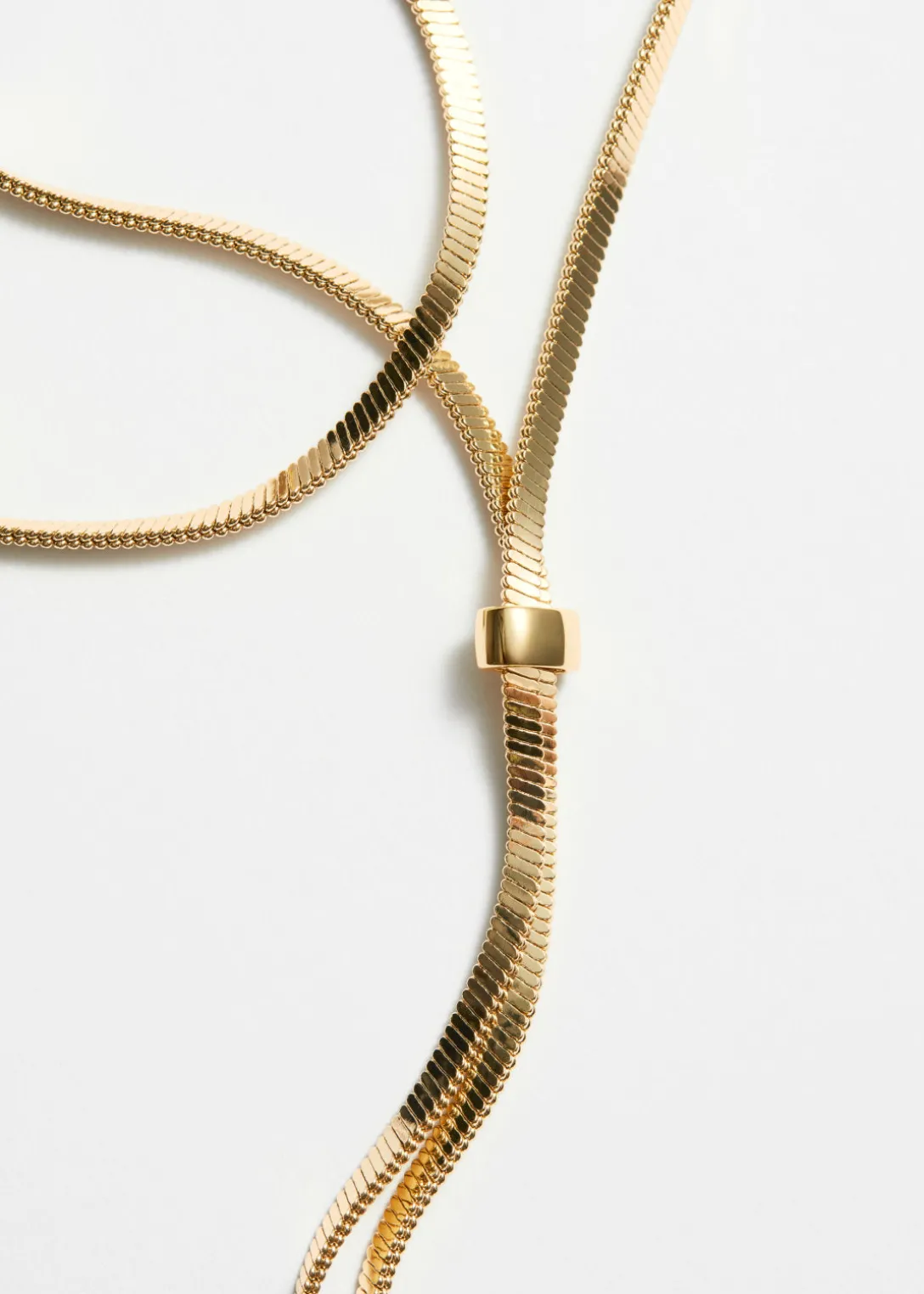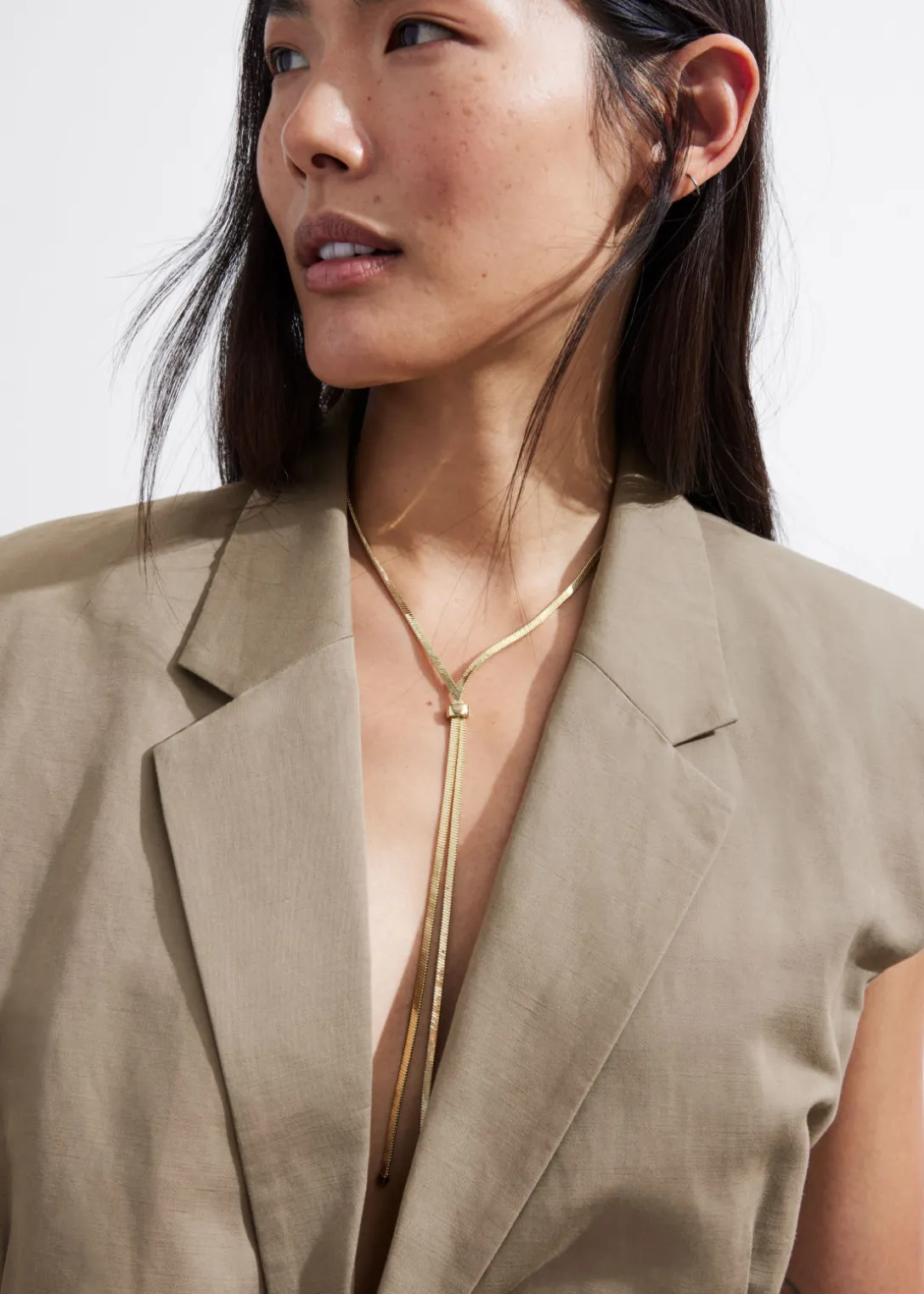 Conçu en forme de lasso, ce collier est idéal pour habiller les décolletés plongeants. Il a été fabriqué en laiton poli et présente des détails décoratifs rectangulaires en guise de finitions.