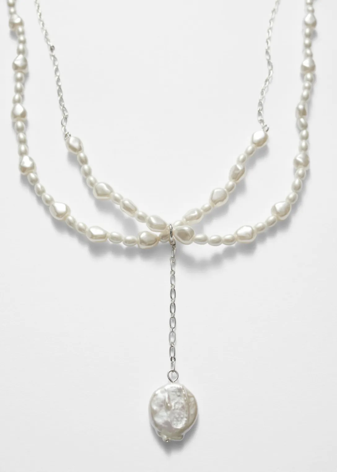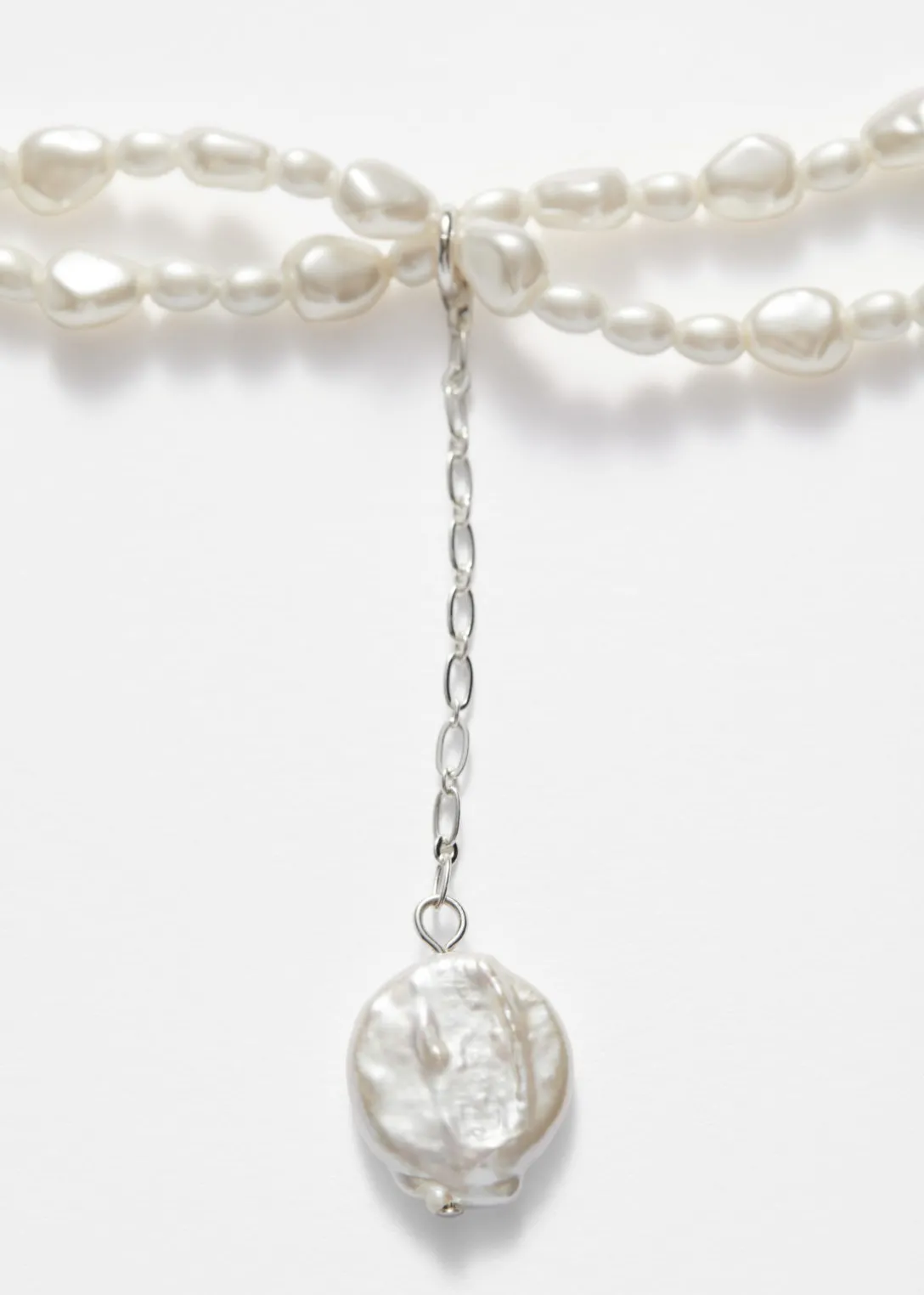 Confectionné en laiton plaqué argent, ce collier court est orné de deux rangées de perles brillantes. Au centre, il présente un pendentif à perle d’eau douce et une chaîne d’extension pour un ajustement personnalisable.