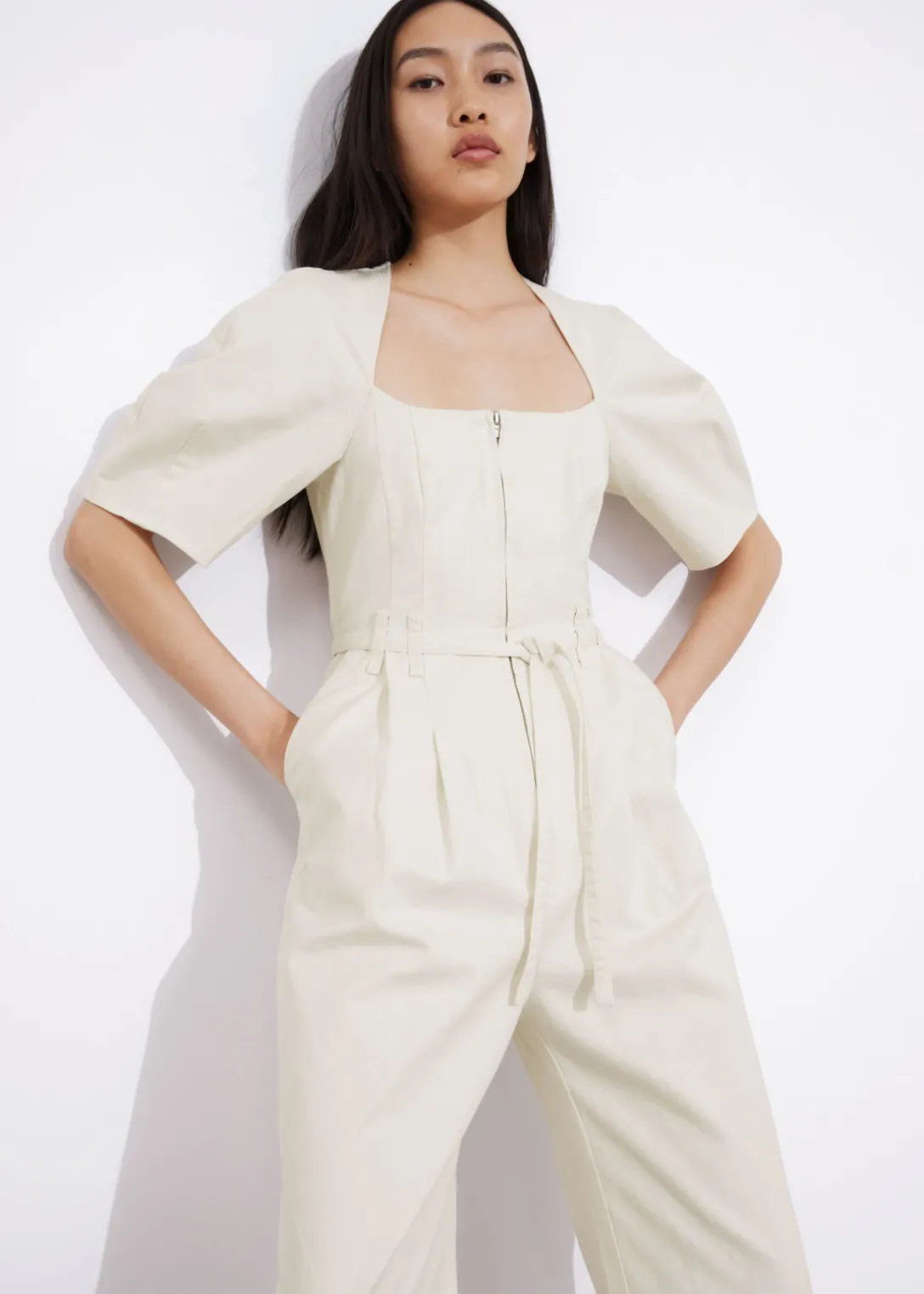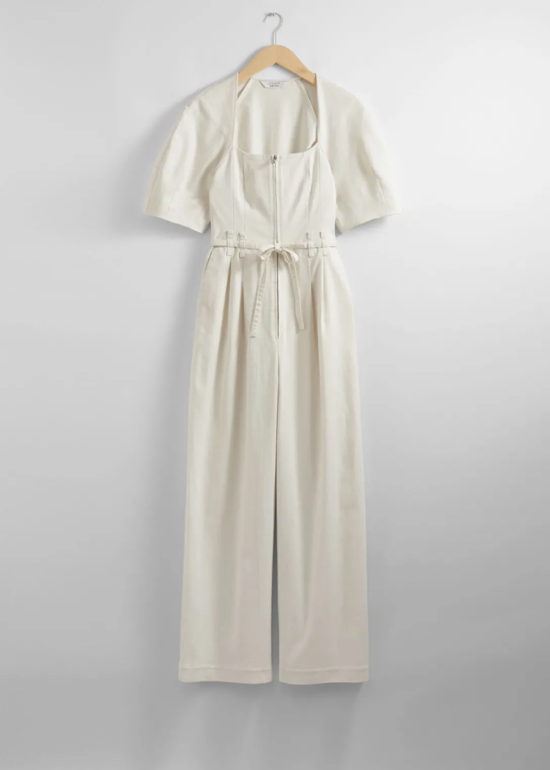 Combinaison avec une encolure carrée et des manches trois-quarts. Dotée d’une ceinture fine assortie à nouer.