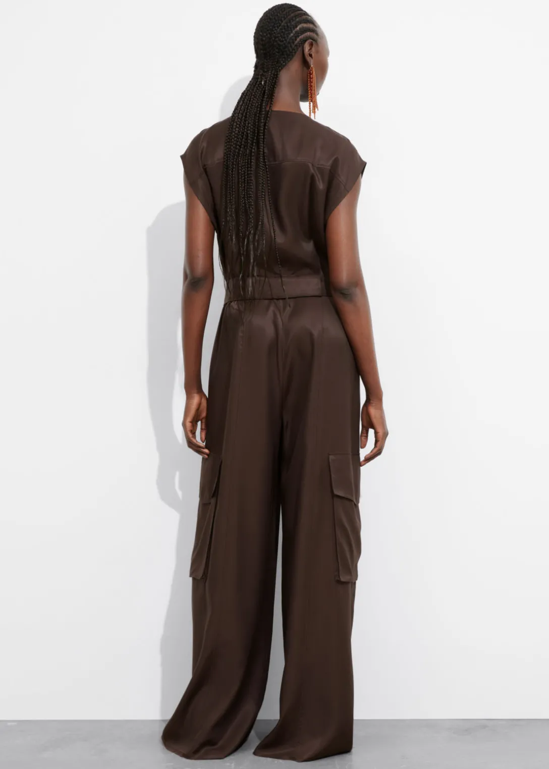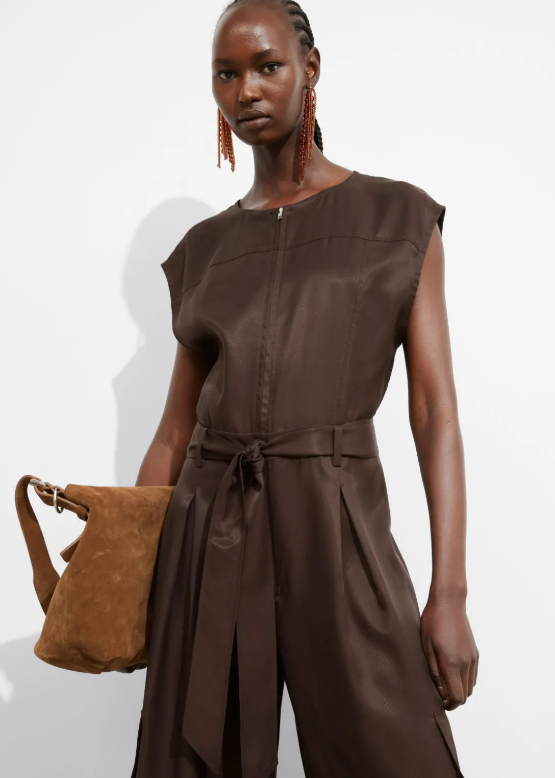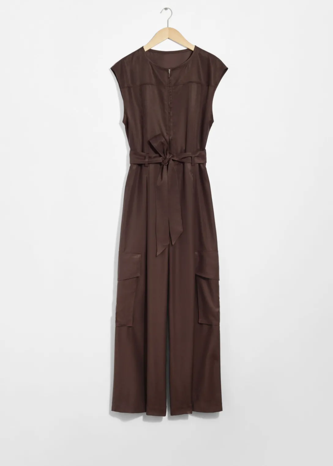 Combinaison zippée à ceinture avec des détails de style utilitaire. Dotée de grandes poches plaquées au niveau des jambes.